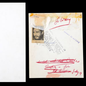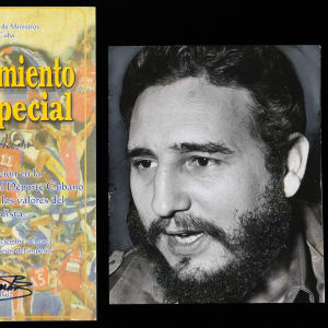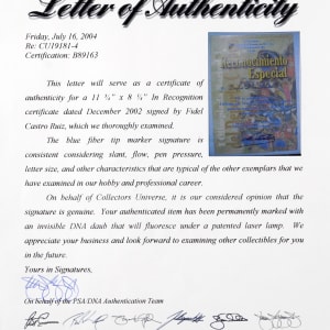 Fascinating and extremely rare certificate of recognition presented to a member of Cuba's national sports team for his participation in the “Olimpiada Nacional del Deporte Cubano,” Cuba’s national athletic games. Presented to Daylon Diaz Acosta, the certificate is particularly notable for its bold black Sharpie signature of Cuban leader Fidel Castro at the base. Measuring 8.25 x 11.25 inches and printed on heavy stock, the colorful certificate features a collage of Cuban sport images in the background and represents the country’s deep cultural and political intertwining of athletics and patriotism under Castro’s leadership. The piece presents very well overall, grading Very Good overall, with only light wear confined to the corners and edges from gentle handling over time. The autograph remains dark and strong. Items personally signed by Fidel Castro, especially those linked to Cuba’s organized sports institutions, are scarce and highly collectible. Also accompanying the certificate is a 1950s-era news service photograph of a close-up Castro measuring approximately 7.5 x 9.25 inches. The photograph displays a number of wrinkles and surface imperfections as well as standard editorial markings on the reverse. Full LOA from PSA/DNA for the Castro signature. Total: 2 items (certificate and photograph).