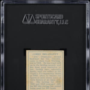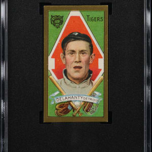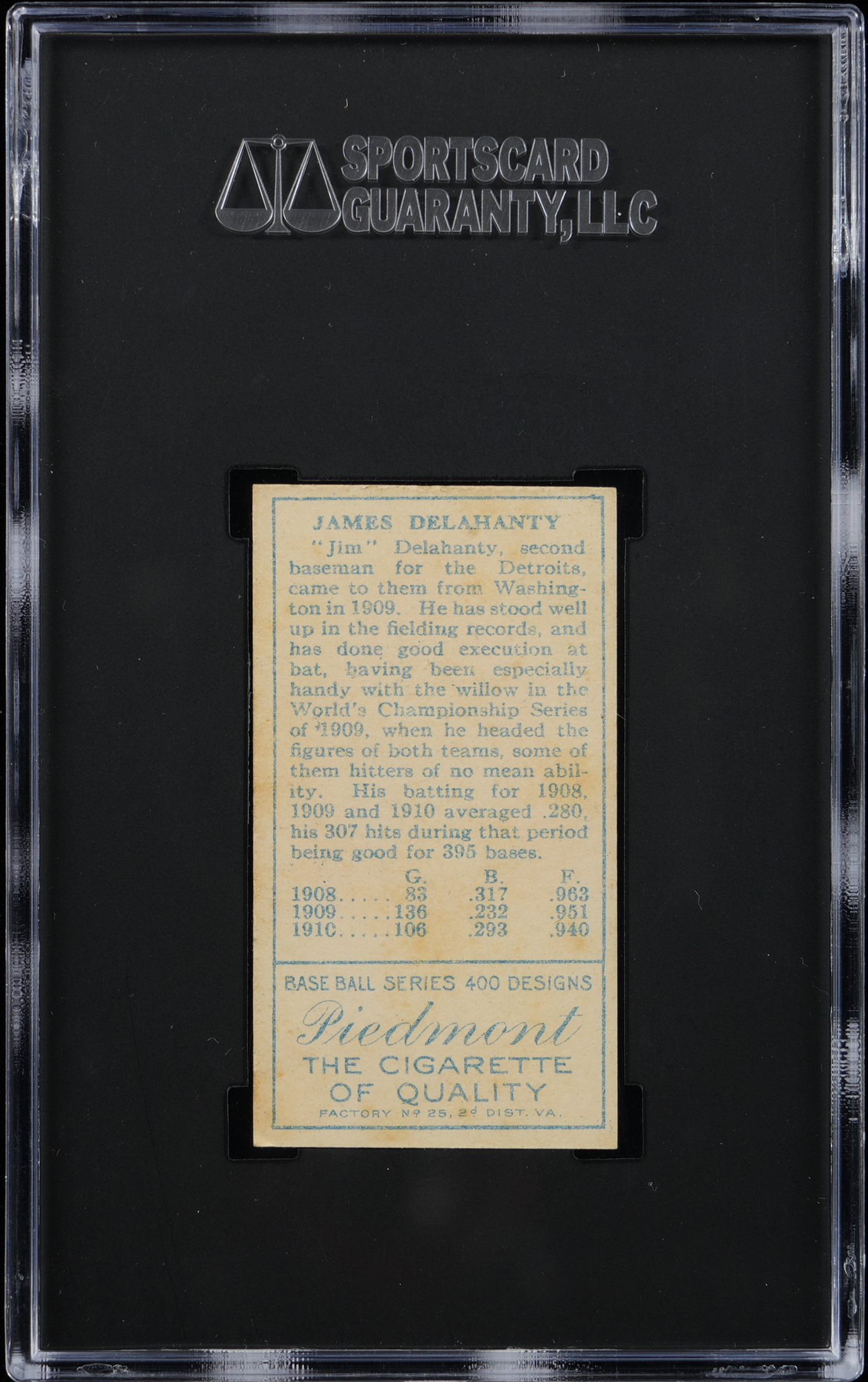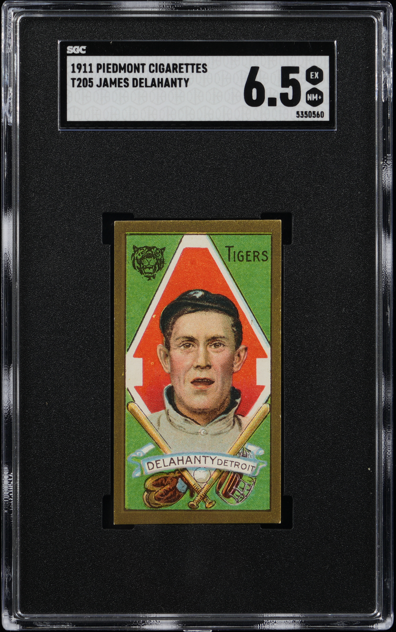 Graded EX/NM+ 6.5 by SGC. Ed's younger brother is preserved in timeless splendor on this high-grade 1911 T205 Gold Border James Delahanty single. This well centered and unchipped 114-year-old Detroit Tiger is flanked by a Piedmont advertising back. Ranks as population 1 with none higher for the brand specific report.