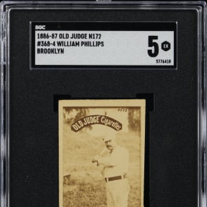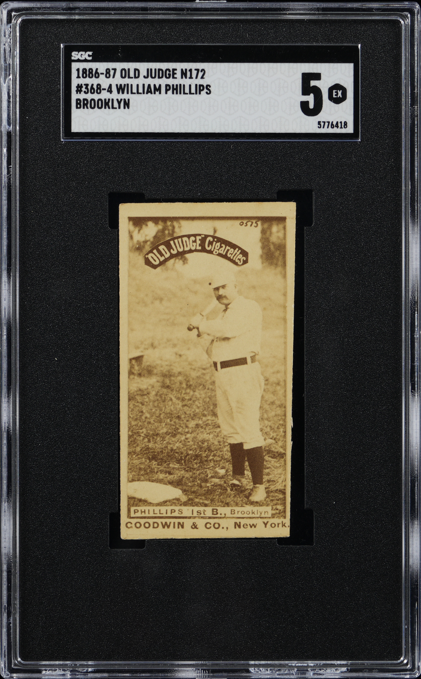 Graded EX 5 by SGC and confirmed as pose #368-4 by the service. Very impressive 1886-1887 N172 Old Judge tobacco card picturing William (Bill) Phillips of the Brooklyn Grays. This Canadian pioneer was the first from the country to suit up in the big leagues. The outdoor "Bat Over Right Shoulder" pose is exceptionally clear and framed by well-formed corners, fresh edges and a clean, blank back. Of the 2 total of the player/pose combination judged by SGC, this antique is the lone copy at the grading tier and the highest graded overall. In comparison, PSA has only graded three total copies of the offered pose with the only copy at the EX 5 tier displaying a qualifier. This relic would make a fantastic companion piece for the 1887 Carroll Studio Phillips that is available as a separate lot in this auction.