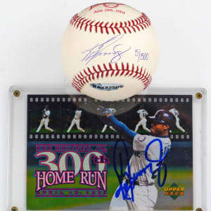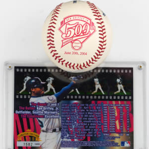 600 Home Run Club member Ken Griffey Jr. stars on this high-end pair of single-signed collectibles. Includes: 1.) commemorative 500th Home Run Club limited edition OML/Selig baseball on sweet spot #5/500 ("8-9", ball "9") with UDA sticker and matching cert card and 2.) 300th Home Run oversized 3-1/2 x 4-7/8" limited edition card #/10,0000 ("9-10"). The signed ball is housed in a deluxe velvet drawstring bag and decorative box. The oversized 300th Home Run card comes with an Auction LOA from James Spence/JSA.