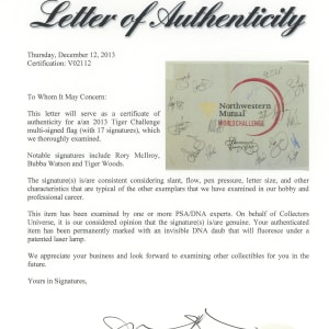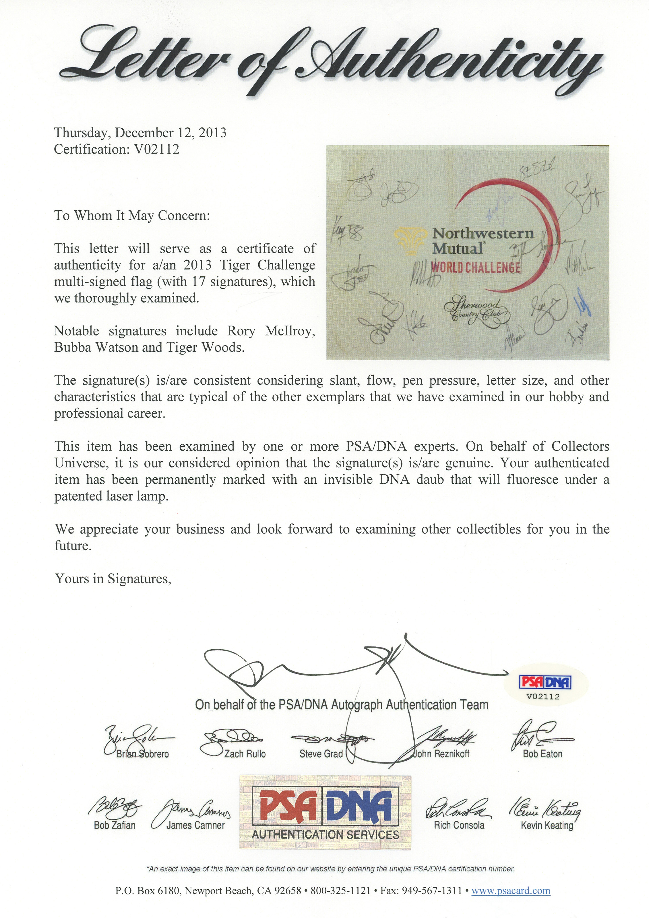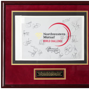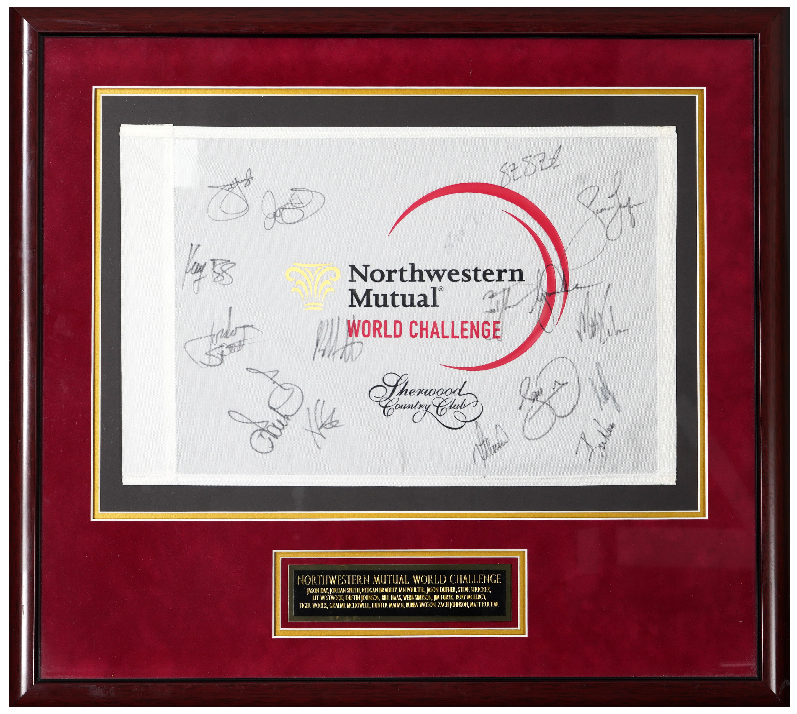 Striking golf flag from the 2013 Northwestern Mutual World Challenge, boldly signed by 17 of golf’s elite stars, including Tiger Woods, Rory McIlroy, and Bubba Watson. The flag, which measures approximately 20 x 13 inches, is professionally matted and framed for display to total dimensions of 26.5 x 29 inches. Along the bottom is a plaque listing all the signers: Jason Day, Jordan Spieth, Keegan Bradley, Ian Poultier, Jason Dufner, Steve Stricker, Lee Westwood, Dustin Johnson, Bill Haas, Webb Simpson, Jim Furyk, Rory McIlroy, Tiger Woods, Graeme McDowell, Hunter Mahan, Bubba Watson, Zach Johnson, and Matt Kuchar. This unique ensemble captures a star-studded moment in professional golf and includes the event's winner, Zach Johnson, who defeated Tiger Woods in a playoff in the 2013 event. Full LOA from PSA/DNA. The size/weight of this item requires that there will be an additional shipping charge for this lot.