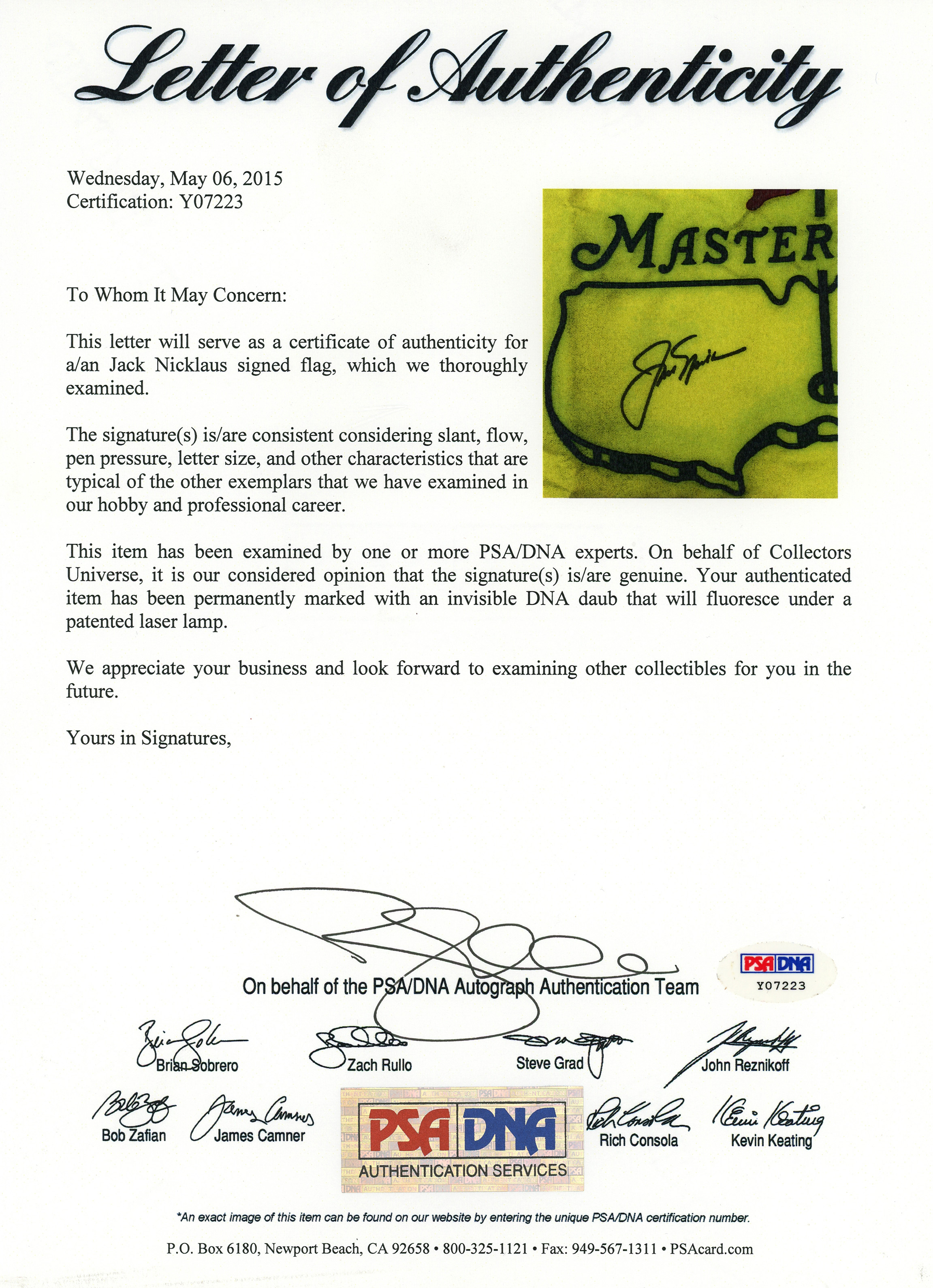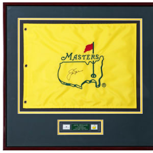 The “Golden Bear” roars in with this single-signed Masters flag in framed display. Hall of Fame legend Jack Nicklaus has proudly enjoyed the most success of any golfer in the history of the Masters Tournament play, winning the elite major a record six times. It’s remarkable that Nicklaus first one this prominent tournament in 1963, and then earned the “Green Jacket” honors for the final time a generation later in 1986, a testament to his longevity at the top of the game. Professionally mounted to overall dimensions of 26” x 25”, this stately display piece is centered with a like-new Masters flag, neatly signed by Nicklaus within the iconic logo. Located at bottom-center is a title plate engraved with “Jack Nicklaus, The Golden Bear, 18 Career Major Championships, 6X Masters Champion, Hall of Fame 1974”.