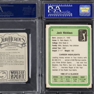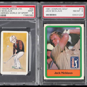 Each graded by PSA. "The Golden Bear" roars with the offered trio of 1979-1981 Jack Nicklaus rookie singles. Includes: 1.) 1979 Venorlandus Ltd. Our Heroes World of Sport #22 (PSA MINT 9); 2.) 1981 Donruss Golf #13 RC (PSA NM-MT 8) and 3.) signed 1981 Donruss Golf Statistical Leader (PSA/DNA Authentic, Auto "8-9", card EX-MT).