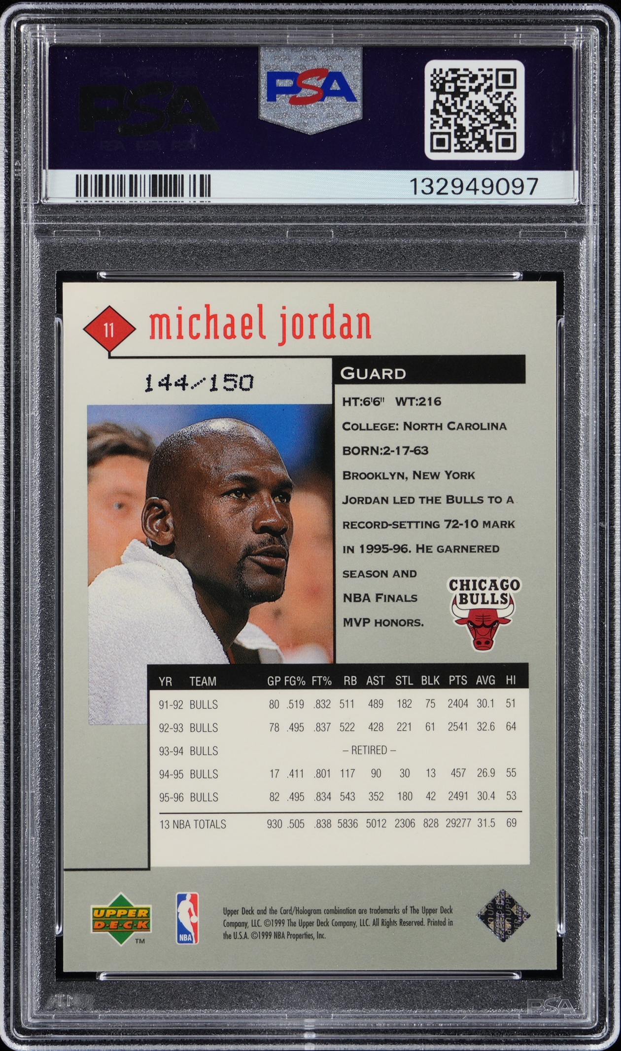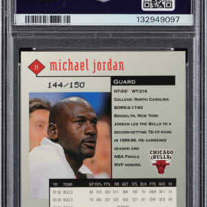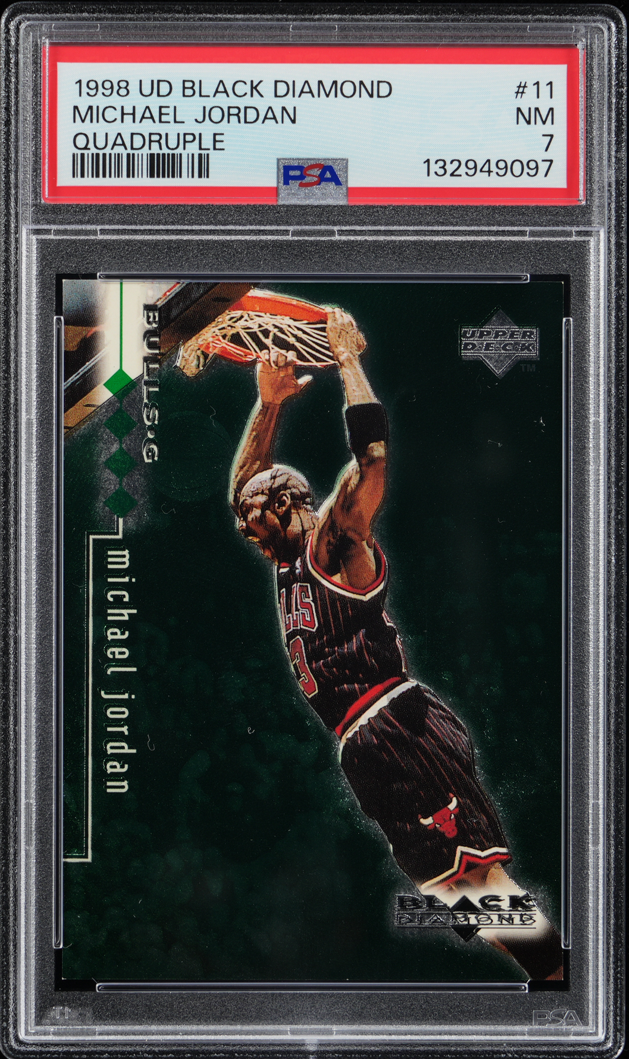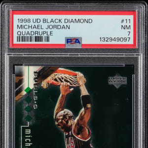 Graded NM 7 by PSA. Serially numbered #144/150. 1998-1999 UD Black Diamond Basketball #11 Quadruple variant of Chicago Bulls Hall of Famer Michael Jordan.