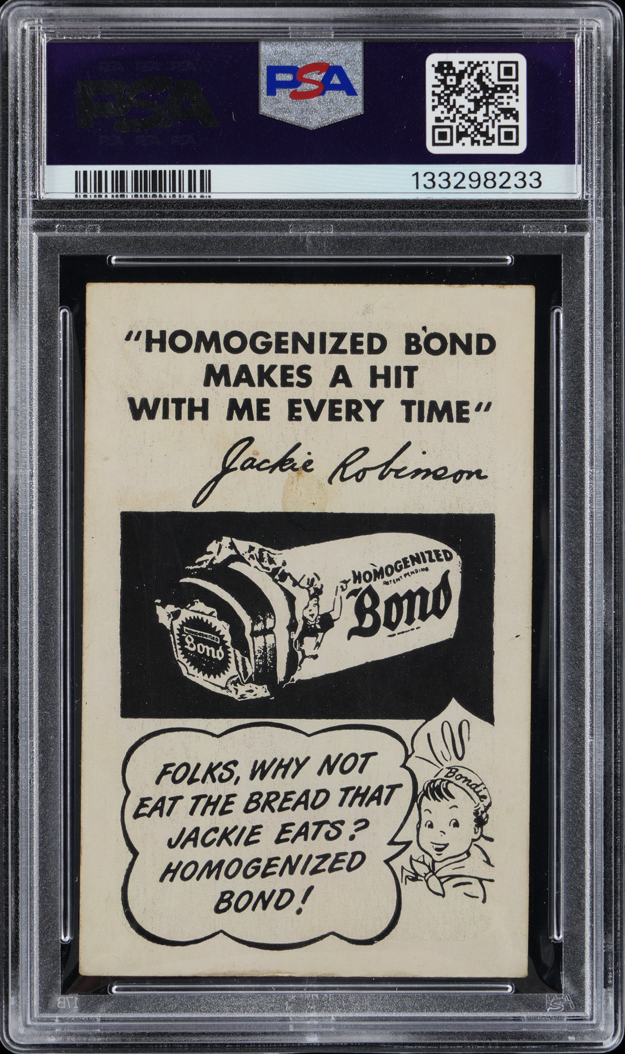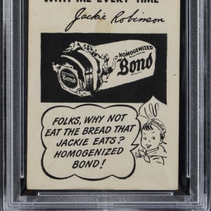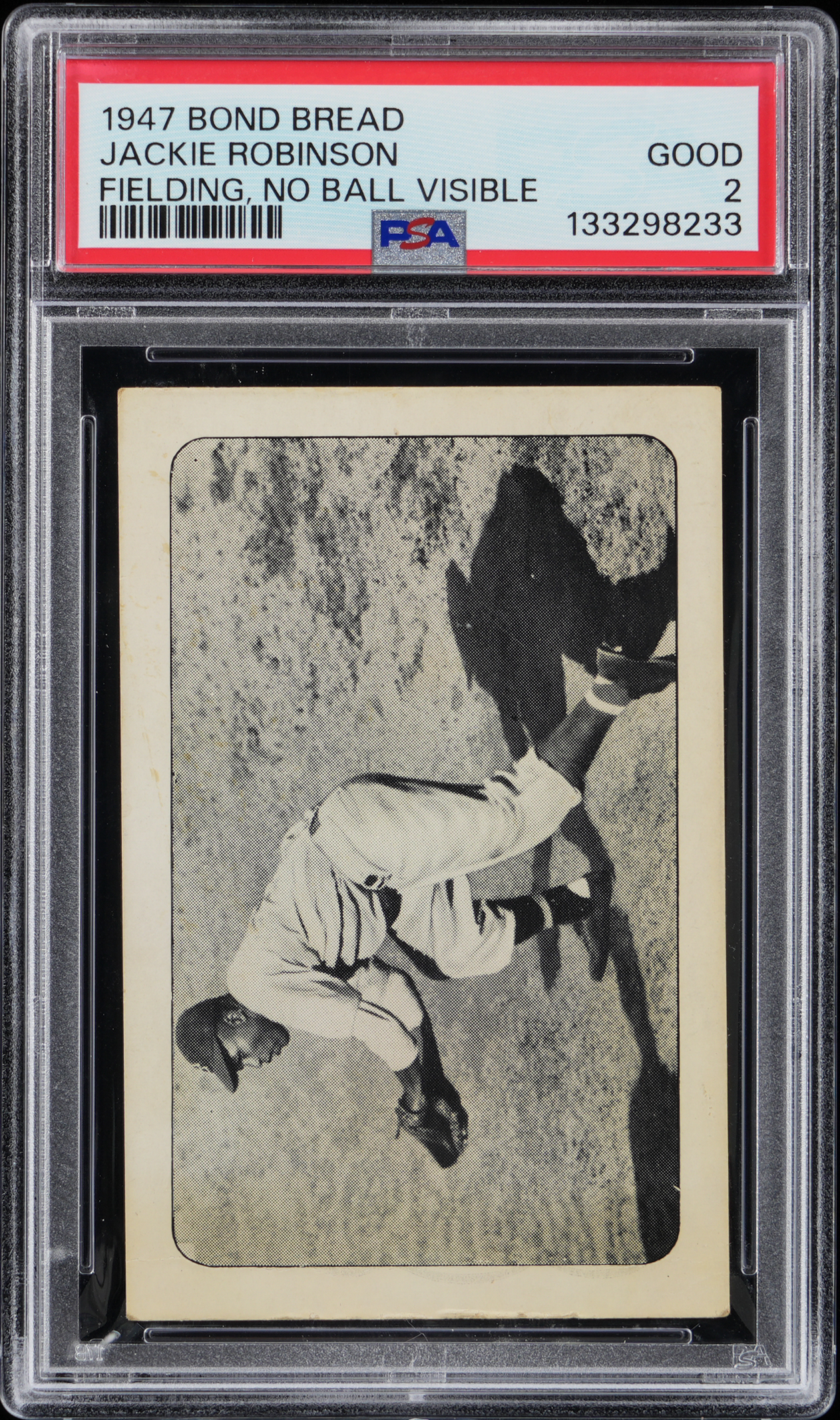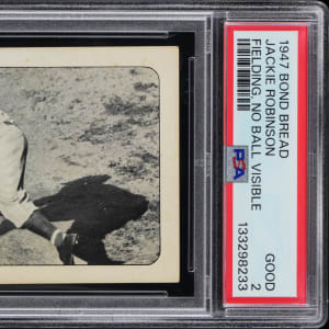 Graded GOOD 2 by PSA. Brooklyn Dodgers rookie sensation Jackie Robinson fields his position on the offered 1947 Bond Bread "Fielding, No Ball Visible" pose. Only 30 total copies of this #42 scarcity have been evaluated by the grading service. Presents at the peak of its overall evaluation!