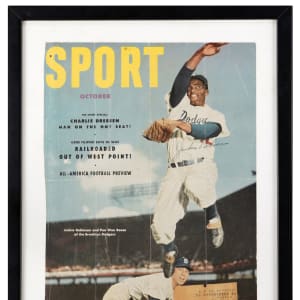 Attractive Sport magazine cover from October 1952 featuring Brooklyn Dodgers Hall of Famers Pee Wee Reese and Jackie Robinson, signed by Robinson across his image. The magazine cover, which measures 8-3/8 x 10-3/4 inches, is detached from the remainder of the magazine and trimmed along the left edge. It bears a mailing label to a Brooklyn, New York, subscriber and displays a number of fold lines from multiple folds, which do not detract from the overall display value. Framed to total dimensions of 11.25 x 13.75 inches. The size/weight of this item requires that there will be an additional shipping charge for this lot. Auction LOA from James Spence/JSA.