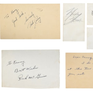 Signed business cards (5): Abe Saperstein (HOF, d.1966), Thomas (“Satch”) Sanders (HOF), “Meadowlark” Lemon (HOF), Murphy Summons, Fred Burks and Murphy Summons dual-signed;