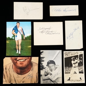 Single items offered without authentication due to time/cost restraints, that are presumed genuine (10) with: Bill Rigney government postcard, Bill Connelly cut, Bobby Avila real photo postcard, Stan Musial faded signature on a 5” x 7” photograph (HOF), Bobby Thomson 5” x 7” photograph, and (5) on magazine clipping photographs with irregular edges: Bobby Avila, Al Rosen, Luke Easter, Frank Baumholtz, Ray McMillan.