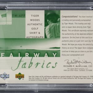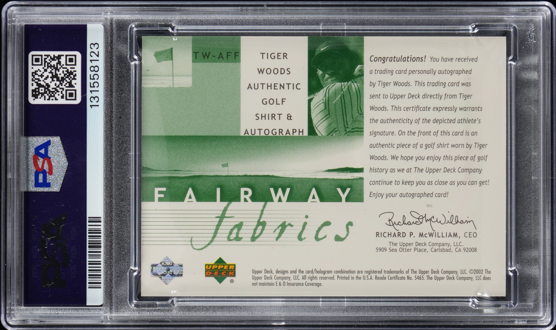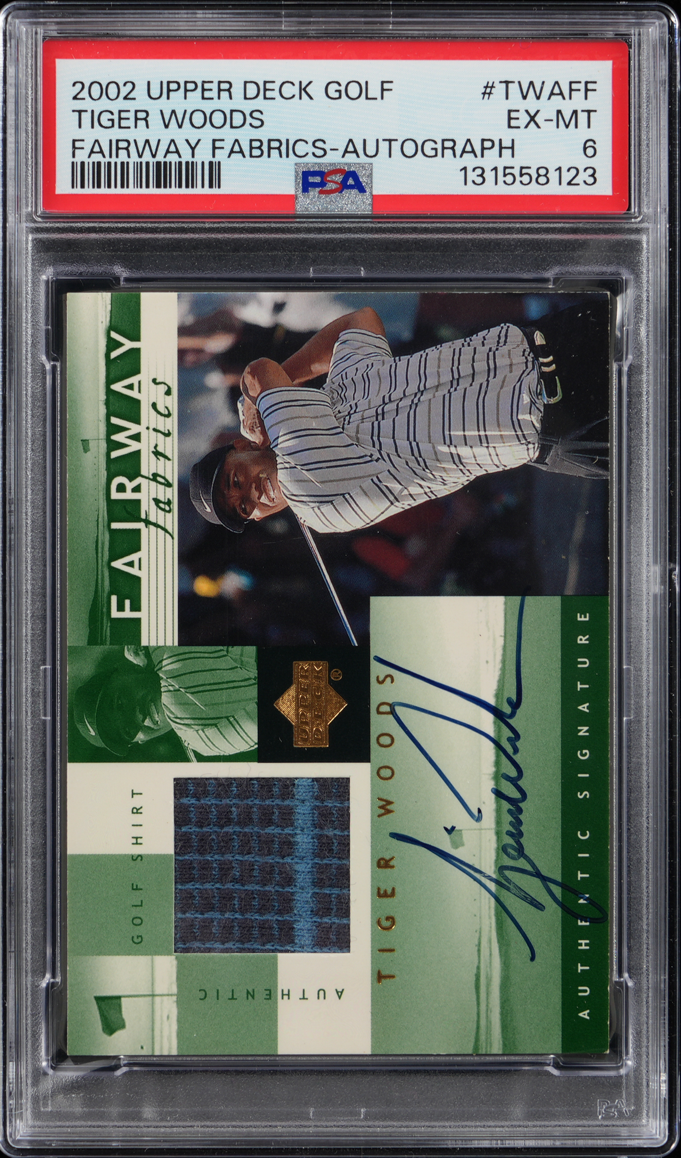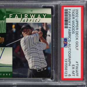 Graded EX-MT 6 by PSA. Imagine the thrill in pulling the offered 2002 Upper Deck Golf Tiger Woods Fairway Fabrics certified autograph/shirt relic from a pack?! A fantastic early combo from the all-time-great golfer.