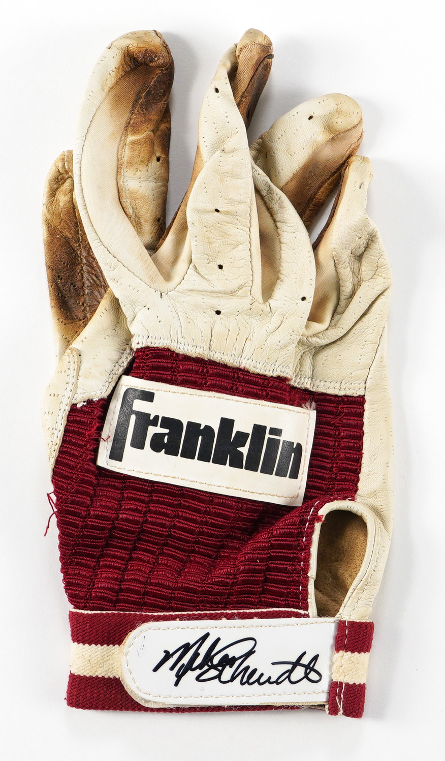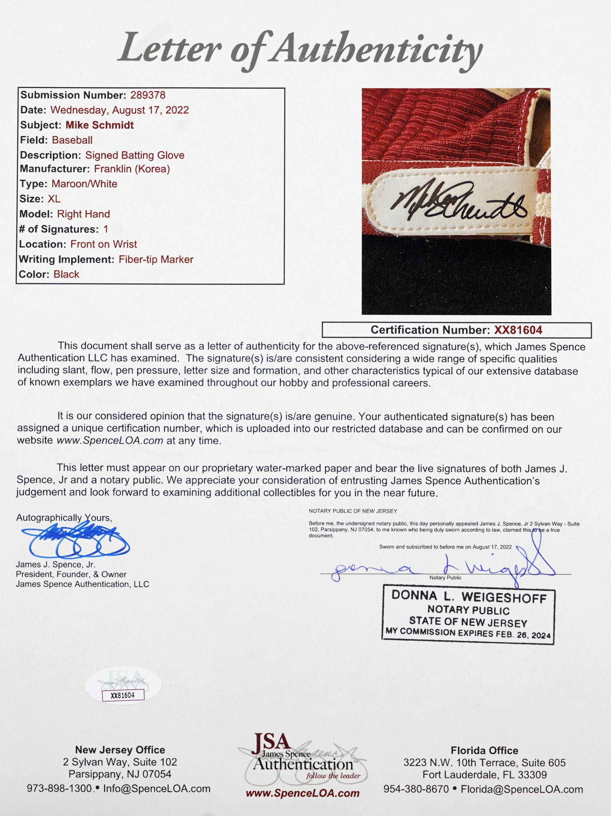 Put your hand in the glove of the man widely considered the greatest third baseman of all-time, when you bring home this Mike Schmidt signed, game-used batting glove. Consigned by longtime east coast memorabilia dealer and avid collector Ed Dolan, this Phillies red and white glove was purchased by him directly from Philadelphia sports media personality Howard Eskin. Offered publicly for the first time, this Franklin glove is reported in the accompanying notarized letter of provenance from Dolan as having been gifted by Schmidt to Eskin, who maintained a long-running friendship with the Phillies Hall of Fame slugger. Abundant signs of authentic game use are evident, and a healthy coating of gripping agent residue coats the business side of this glove, which had to have covered Schmidt’s good right hand for at least a few of the 548 career home runs he hit. Schmidt has signed boldly on the backstrap, which miraculously remains bright white, showcasing Schmidt’s potent signature nicely.