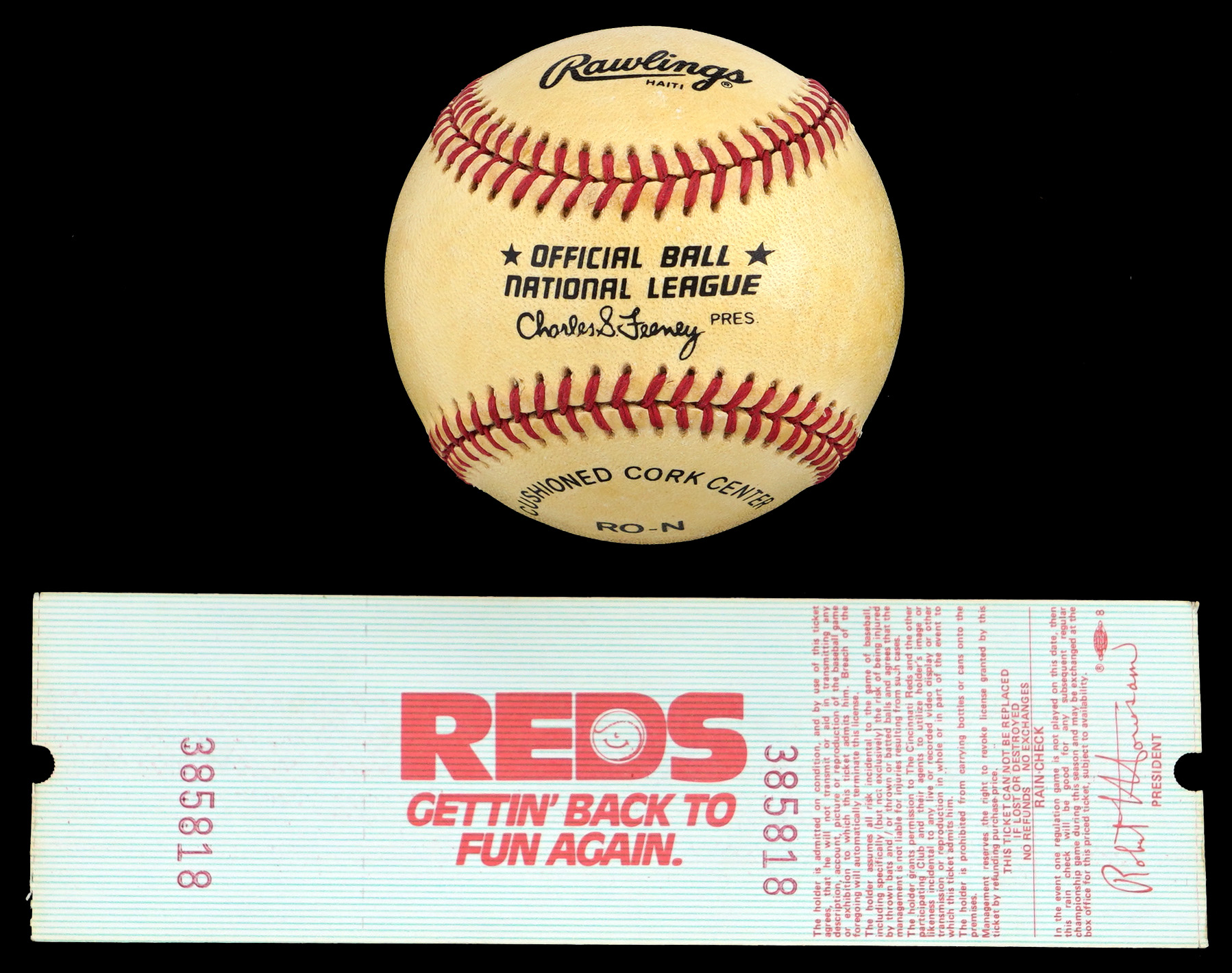 Double down on the “Hit King”, when you place your bids on this Pete Rose signed pair. First up is 9/11/85 Cincinnati Reds full ticket from the game at Riverfront Stadium when Rose collected career hit number 4,192, to break Ty Cobb’s career hit record. Rose has boldly signed this radiant ticket, which remains crisp and clean, with minimal traces of wear. Accompanying this major milestone ticket, is a Rose single-signed ONL/Feeney baseball. This vintage ball appears to have been mudded, made ready for game use, and the factory labeling stamps retain abundant integrity. Rose has signed on the preferred sweet spot location, and his slightly muted signature is an attractive application.