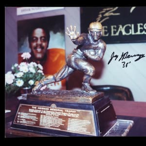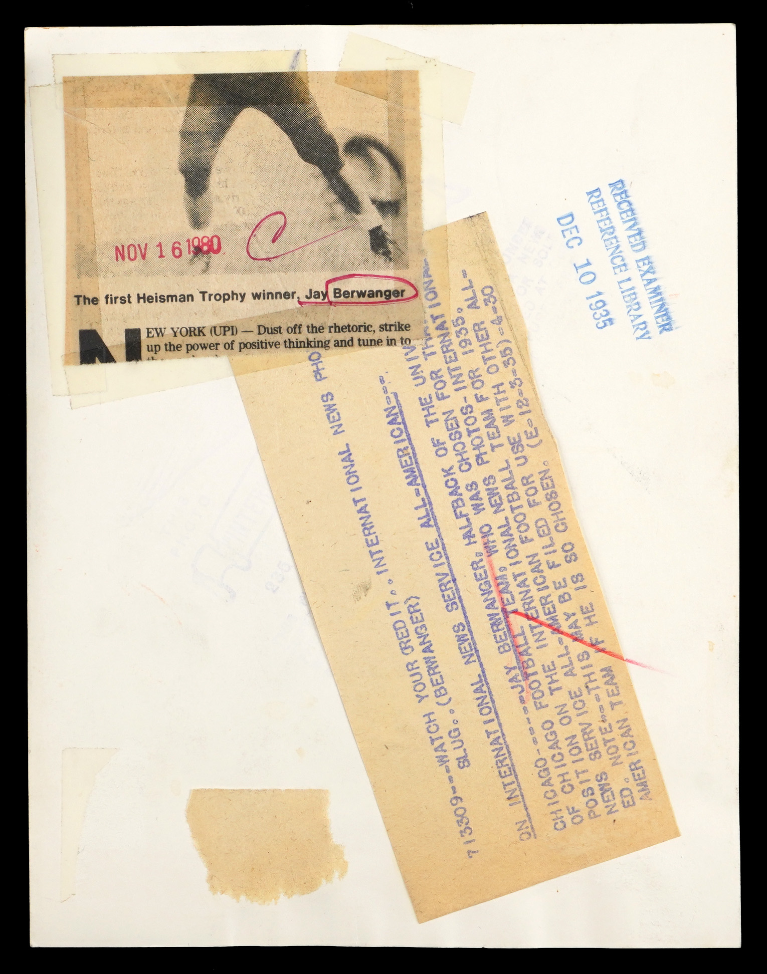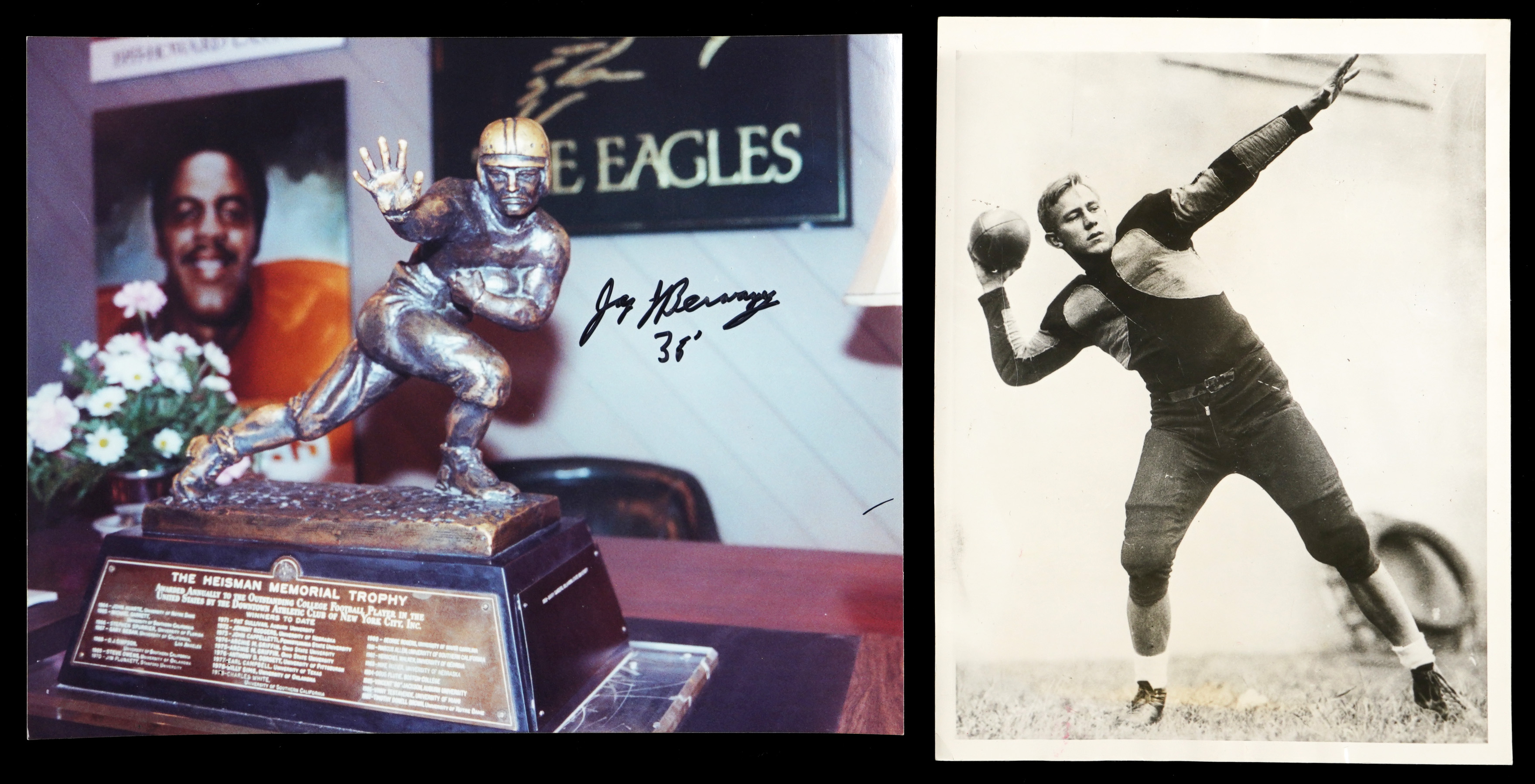 The first Heisman Trophy winners graces the offered pair of Jay Berwanger collectibles. The College Football Hall of Famer is captured on the following mediums: 1.) dated 12/10/35 news service photo measuring 6-3/4 x 8-3/4" with dated reverse credits and 2.) signed 8x10 photograph with '35 inscription. Auction LOA from James Spence/JSA.