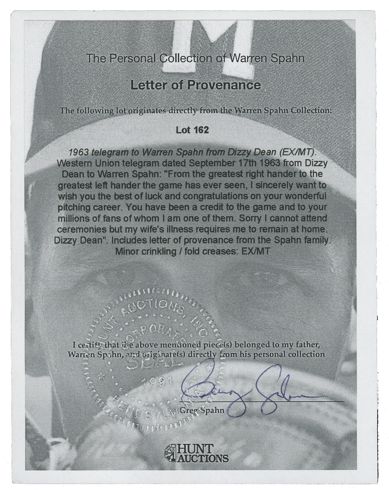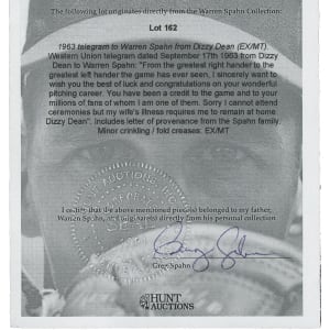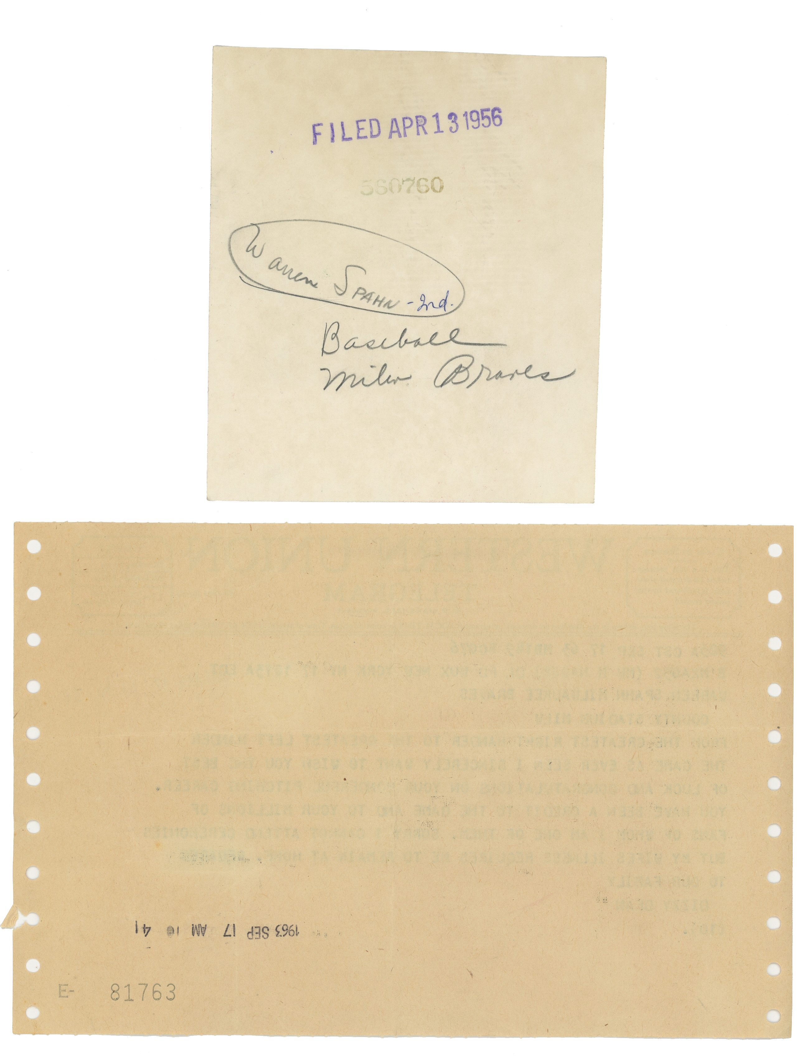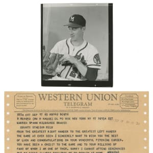 Interesting pair of "golden age" collectibles relating to Milwaukee Braves Hall of Fame pitcher Warren Spahn. Includes: 1.) dated 4/13/56 black-and-white file photo measuring 4-1/8 x 4-3/4" (presents GD, with moderate creasing) and 2.) dated 9/17/63 Western Union Telegram from Dizzy Dean to Spahn with fantastic content congratulating Spahn on his "wonderful pitching career." A one-of-a-kind piece of diamond history in excellent condition that arrives with a Letter of Provenance from Hunt Auctions.