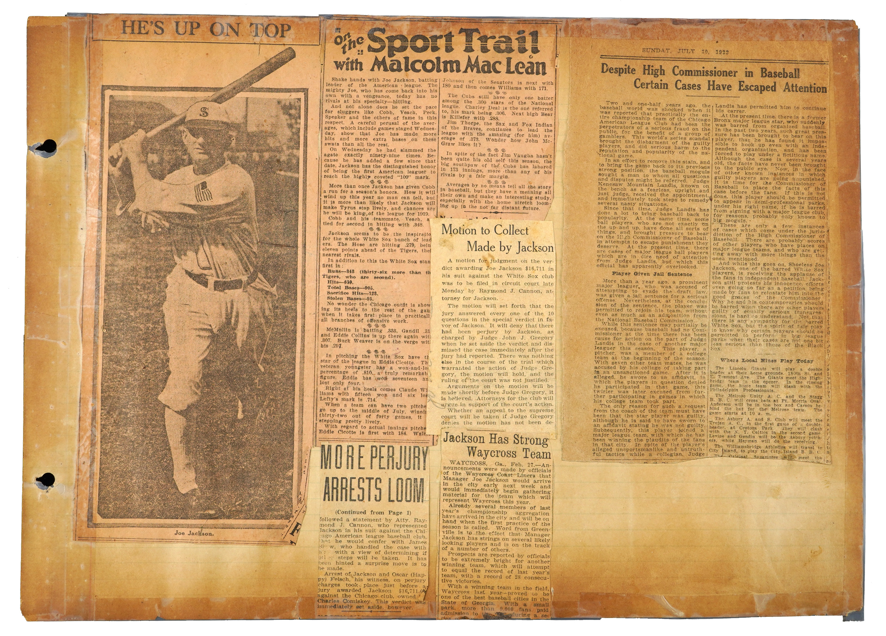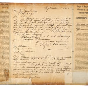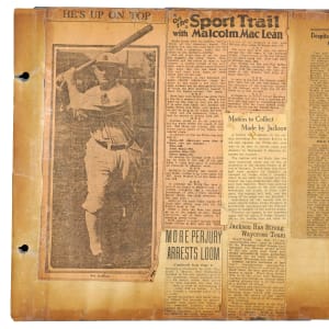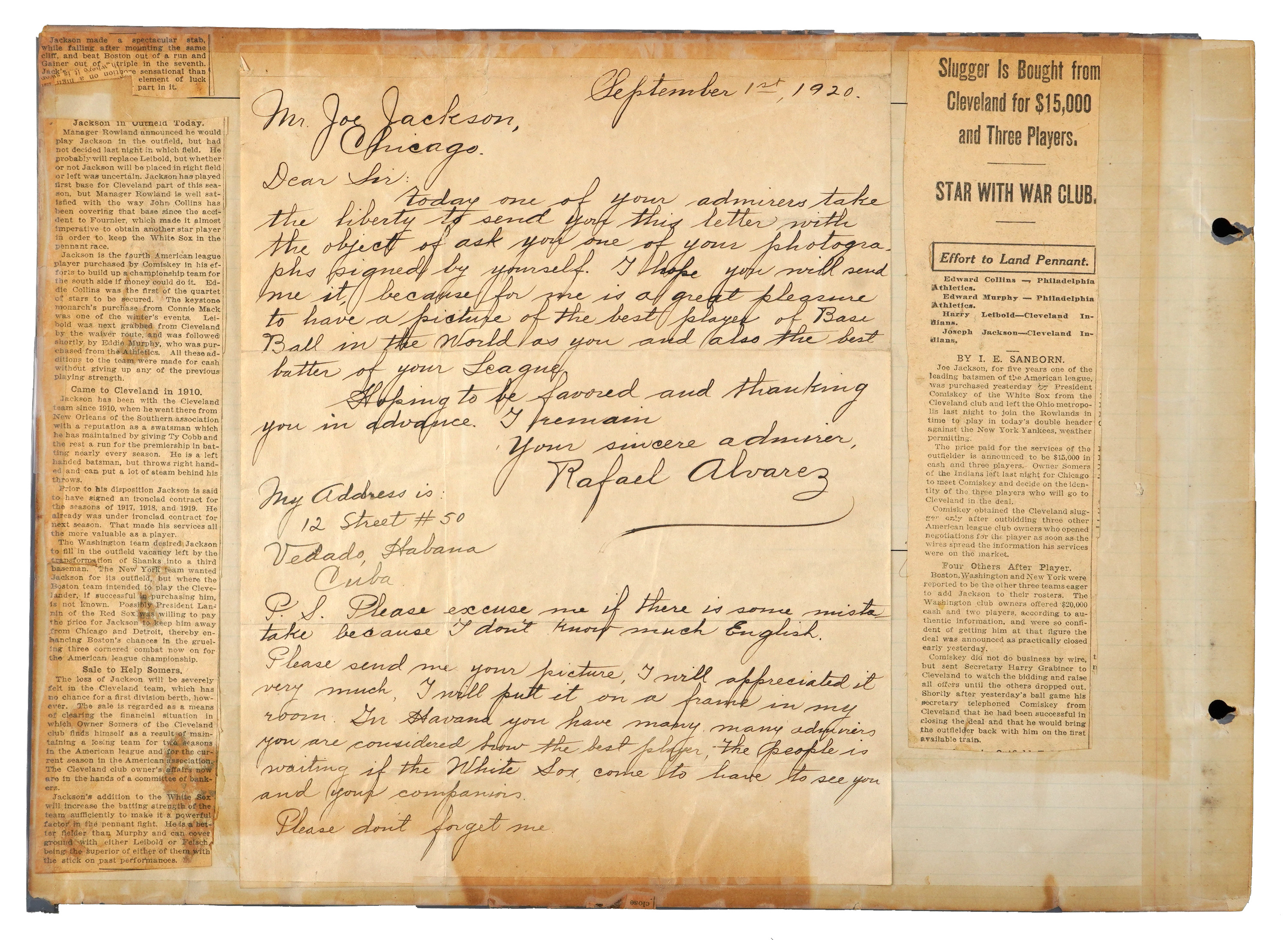 (Shoeless) Joe Jackson had an international appeal during his playing days as evidenced by this unique 1920 fan letter collage. On front of the 15-3/8 x 11" scrapbook page are 6 period newspaper cut-outs affixed to the surface, including three with "Black Sox" content. On the back page are two more newspaper cut-outs (one relating from Jackson's sale to the White Sox) and a dated 9/1/20 handwritten letter from a Cuban fan. In this letter, one Rafael Alvarez writes of his admiration for Jackson and requests "one of your photographs signed by yourself" (a quite difficult task) and "a picture of the best player of Base Ball in the world." Alvarez then apologizes for his poor English and notes the people of Havana "is waiting if the White Sox come to have to see you and your companions." Little did Mr. Alvarez know that Jackson would conclude his big league career just weeks later and Black Sox banishment would follow. A tender and interesting one-of-a-kind artifact that proves the longstanding love of our national pastime from the baseball crazed Caribbean!