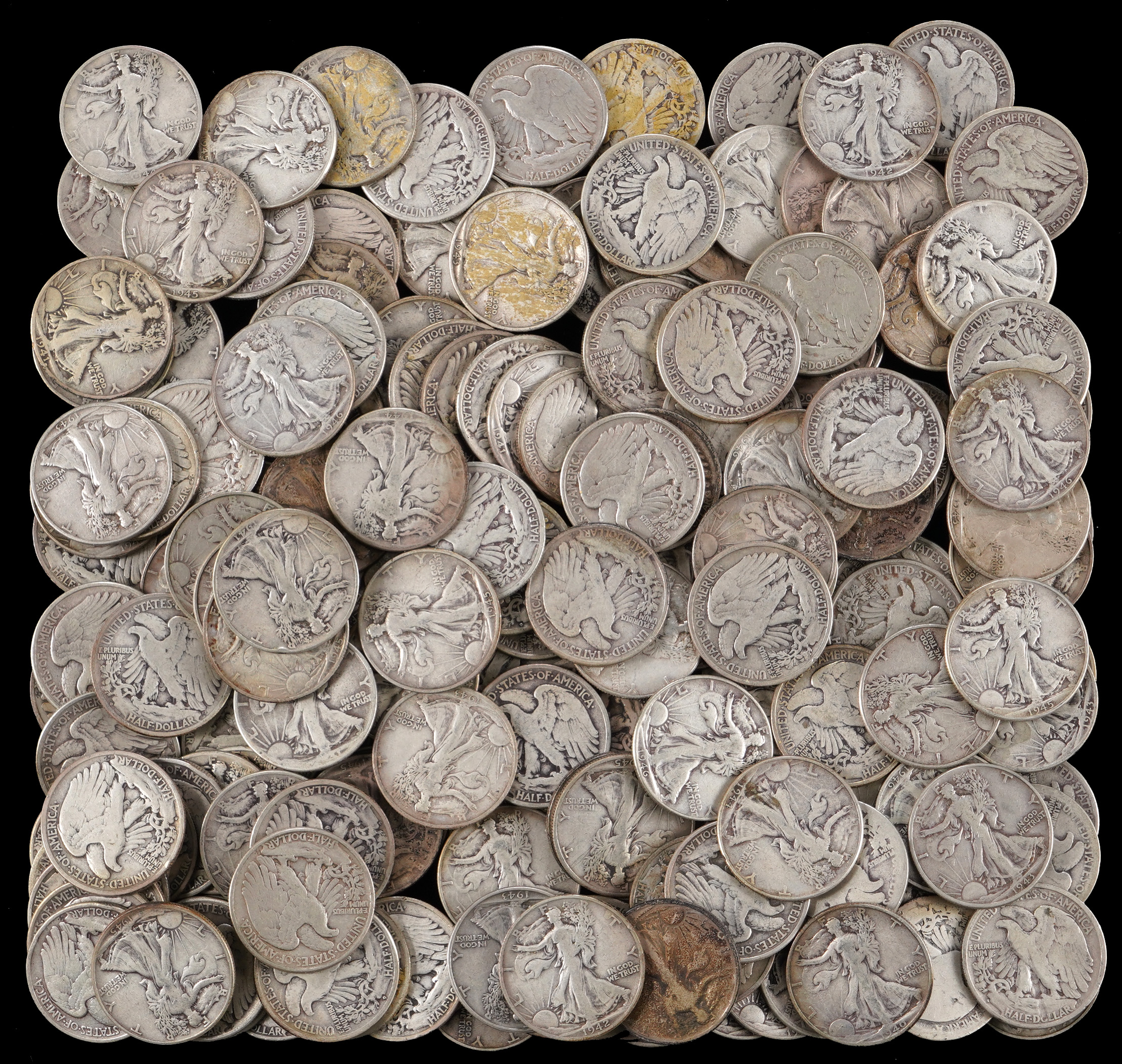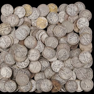 Dig into a silver lode, when you explore this bundle of (180) 1918-1947 Walking Liberty silver half dollar coins. Silver has been on a prolonged uptick, hitting a record high in value of late. Desire to own the precious metal continues to rise right along with the escalating spot price, and this is a fantastic chance to join the chase. While most of the coins in this beefy bundle date from the 1940s, six date from 1918-1920, fourteen date from the 1930s, and the dates are longer visible on just three coins. Condition ranges 95% GD to VF+, 5% lesser. With silver hovering around $50 per ounce in the weeks leading up to the start of this current auction, these 90% silver half dollar coins have been trading for $17-20 each, for common date examples in circulated state, such as those offered here.