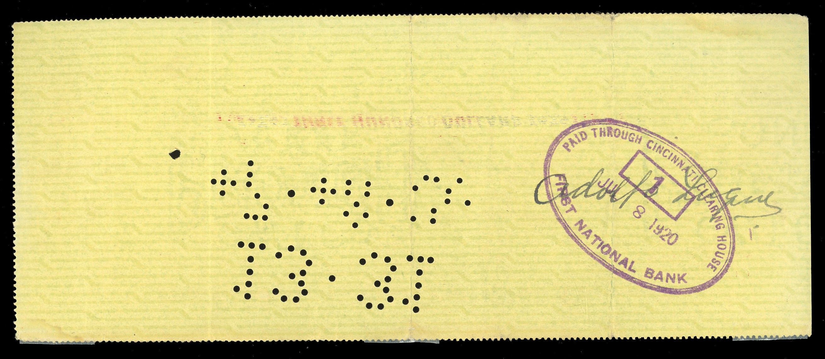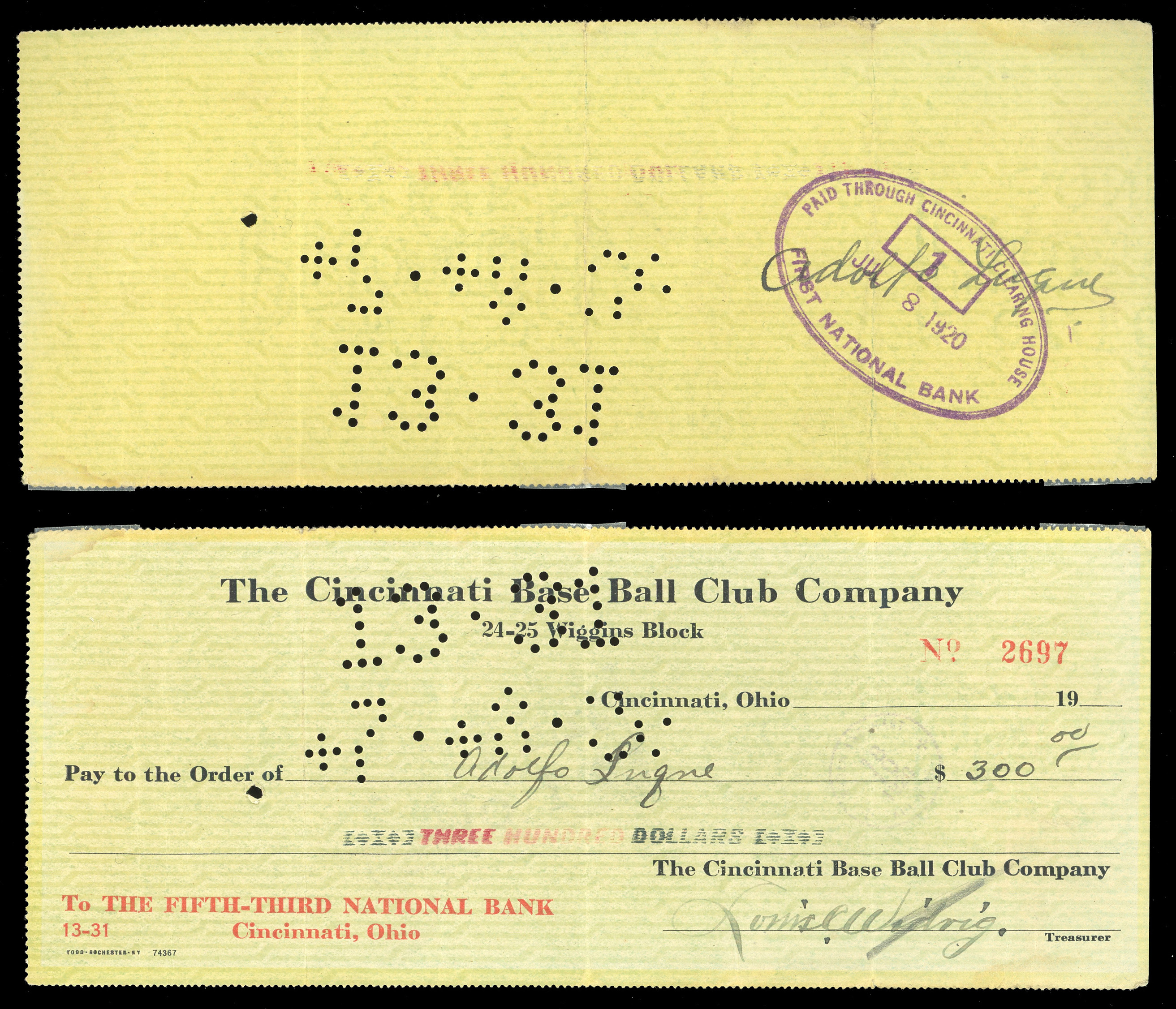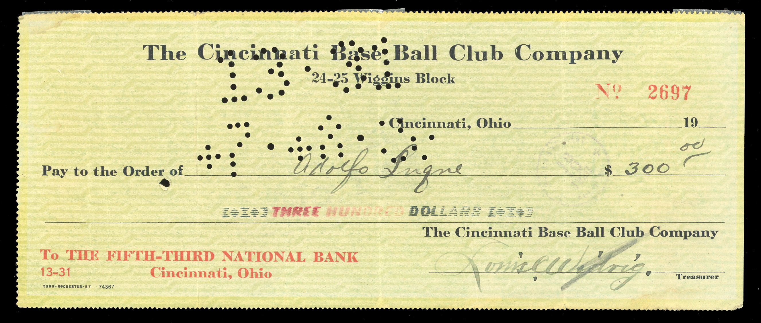 Cincinnati Reds payroll check issued to pitcher Adolfo "Dolph" Luque during the 1920 season in the amount of $300.00. Drawn on the Fifth-Third National Bank of Cincinnati and signed by the team's treasurer, the check is endorsed by Luque on the reverse and features a number of bank related stamps and cancellation marks, including one dated July 8, 1920. The check displays three vertical folds as well as discoloration along the edges and tiny remnants of clear tape along the top edge from having once been mounted within a display. Notably, Luque was a member of the famed 1919 World Championship team, which defeated the Chicago White Sox amid the "Black Sox" scandal to win the franchise's first title. This is one of an exceptional grouping of scarce 1920 Reds payroll checks offered within this auction. Auction LOA from James Spence/JSA.