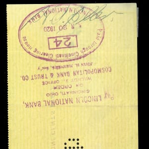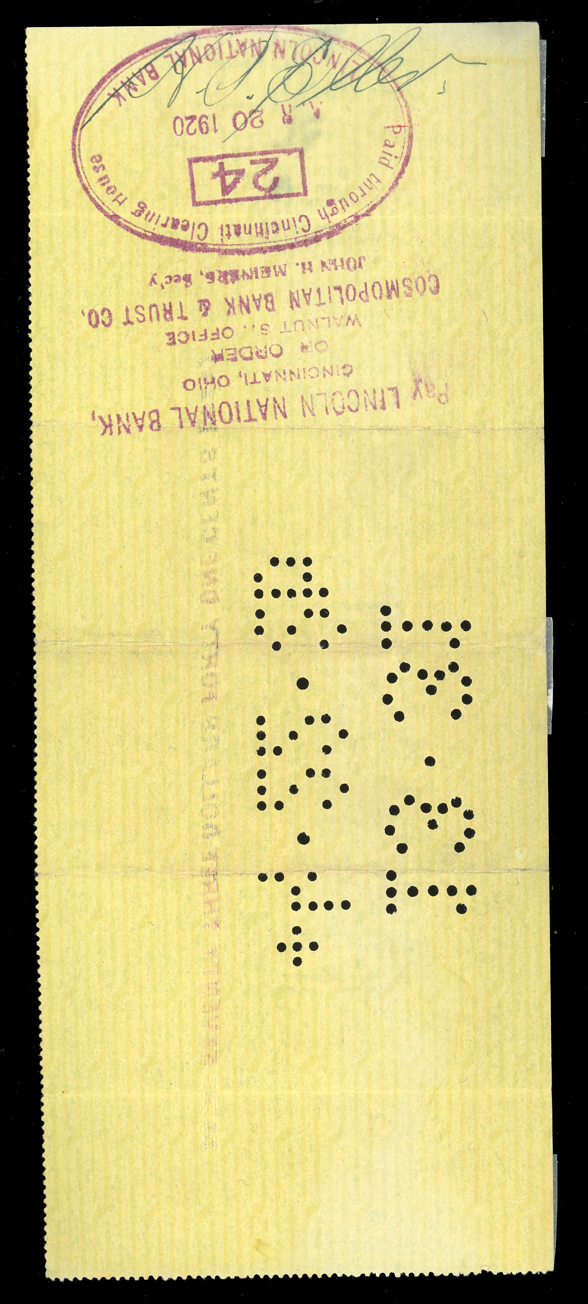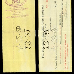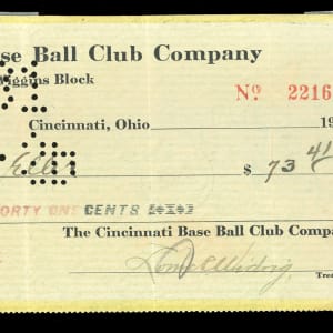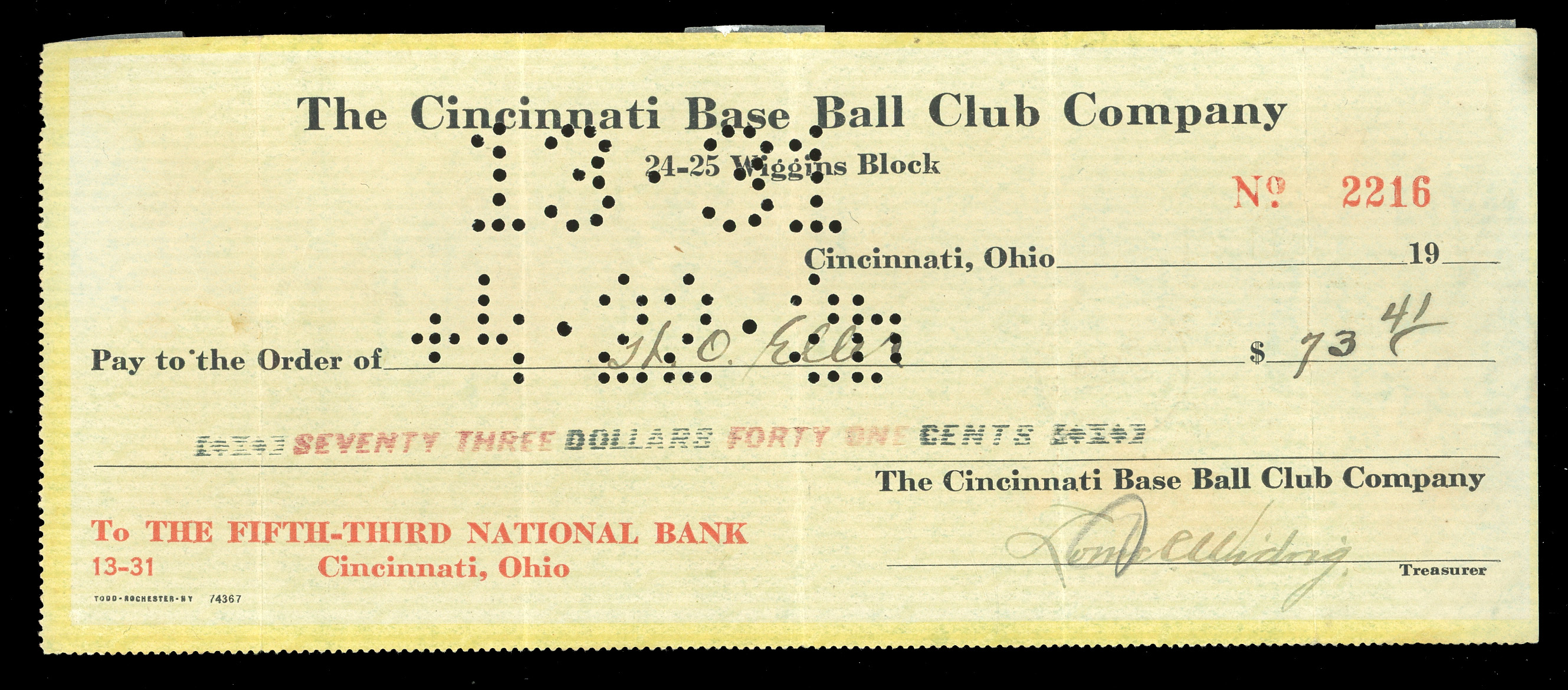 Cincinnati Reds payroll check issued to pitcher Hod Eller during the 1920 season in the amount of $73.41. Drawn on the Fifth-Third National Bank of Cincinnati and signed by the team's treasurer, the check is endorsed by Eller on the reverse and features a number of bank related stamps and cancellation marks, including one dated April 20, 1920. The check displays five vertical folds as well as discoloration along the edges and tiny remnants of clear tape along the top edge from having once been mounted within a display. Notably, Eller was a member of the famed 1919 World Championship team, which defeated the Chicago White Sox amid the "Black Sox" scandal to win the franchise's first title. This is one of an exceptional grouping of scarce 1920 Reds payroll checks offered within this auction. Auction LOA from James Spence/JSA.