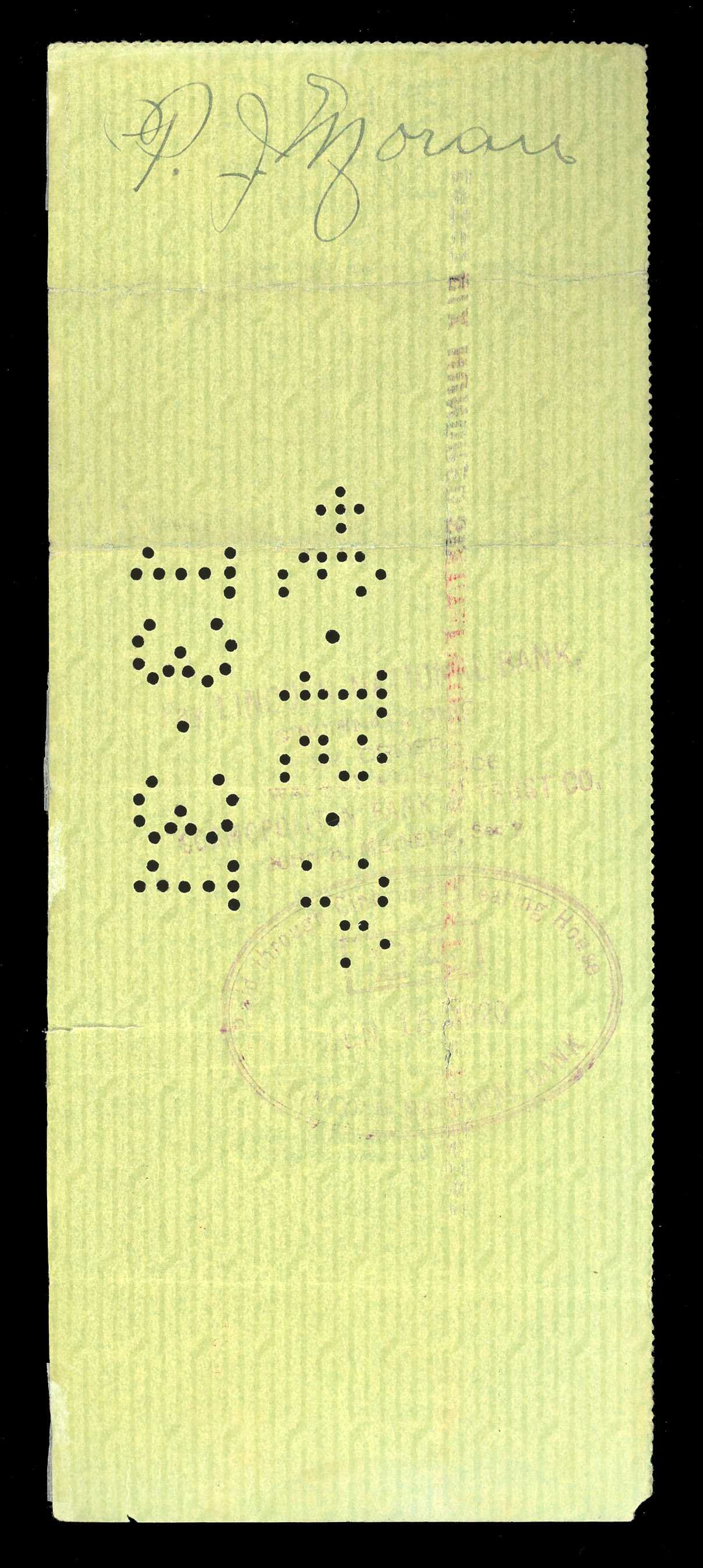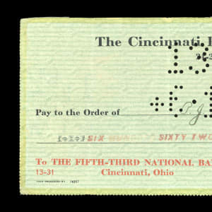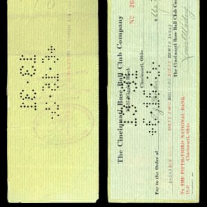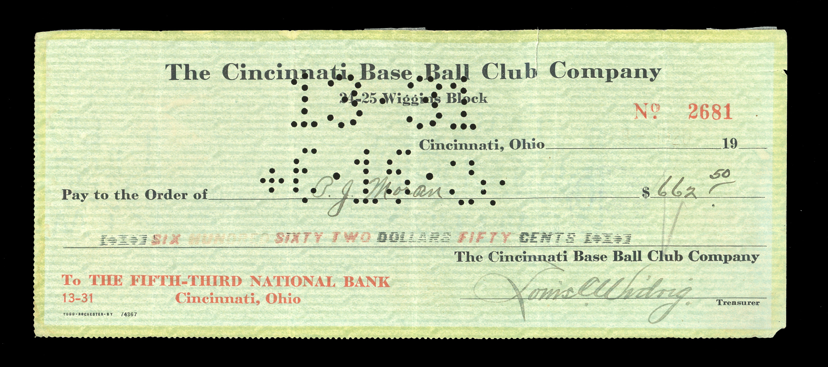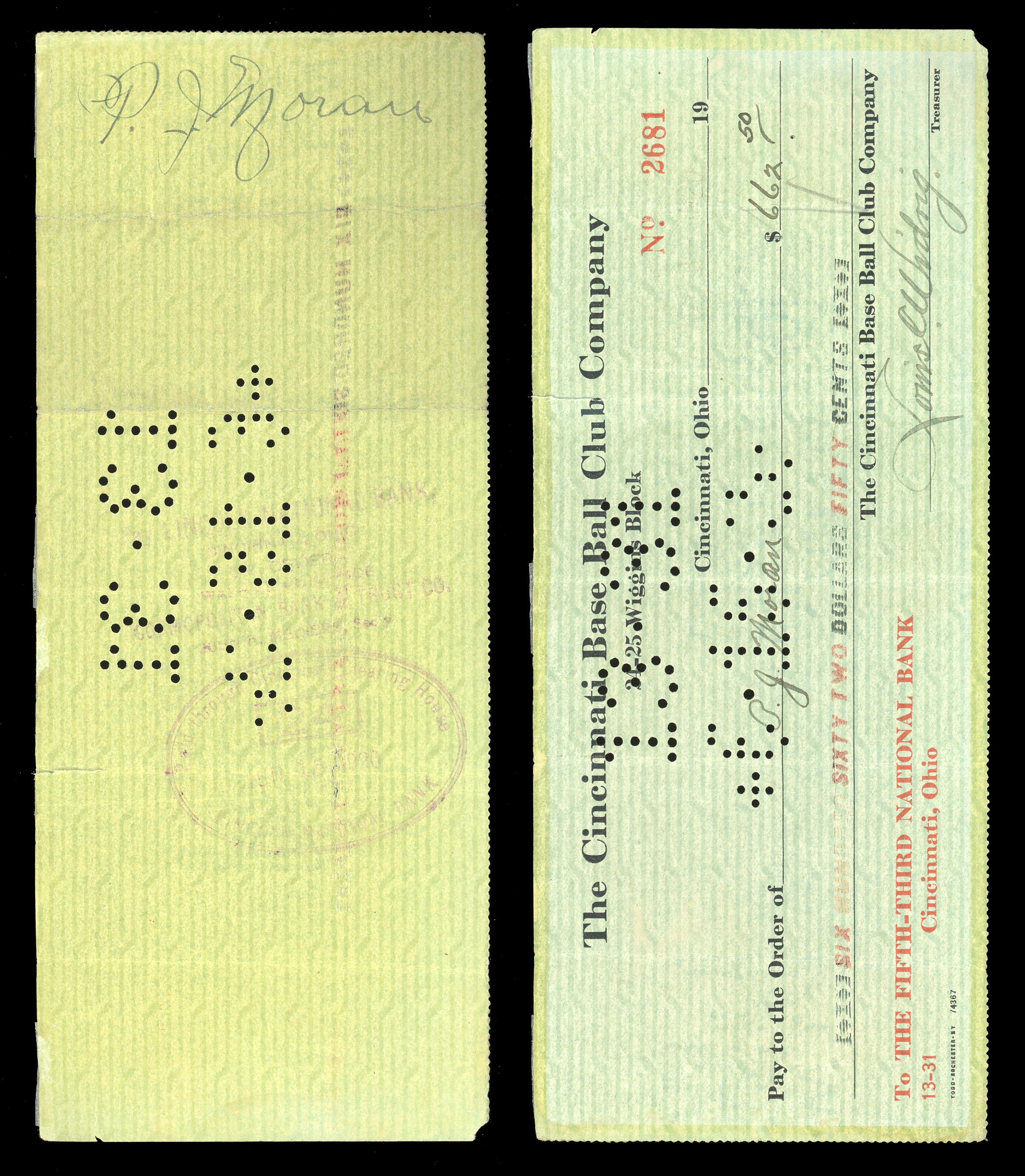 Cincinnati Reds payroll check issued to manager Pat Moran during the 1920 season in the amount of $662.50. Drawn on the Fifth-Third National Bank of Cincinnati and signed by the team's treasurer, the check is endorsed by Moran on the reverse and features a number of bank related stamps and cancellation marks. The check displays five vertical folds as well as discoloration along the edges and tiny remnants of clear tape along the top edge from having once been mounted within a display. Notably, Moran was the manager of the famed 1919 World Championship team, which defeated the Chicago White Sox amid the "Black Sox" scandal to win the franchise's first title. He died in 1924, making this is a tough signature for Reds collectors. This is one of an exceptional grouping of scarce 1920 Reds payroll checks offered within this auction. Auction LOA from James Spence/JSA.