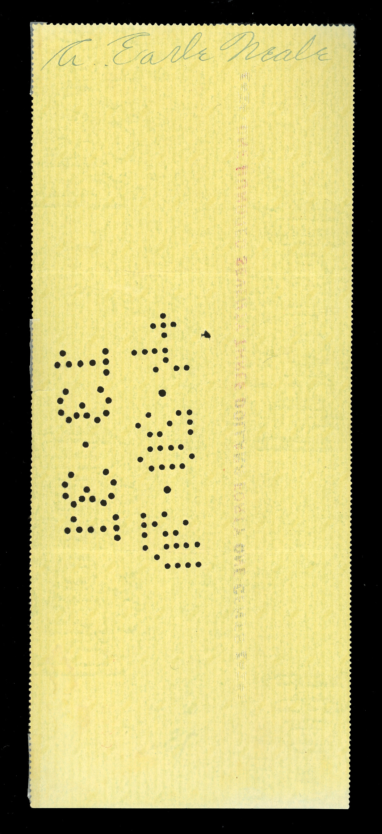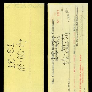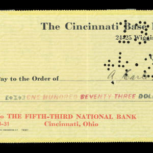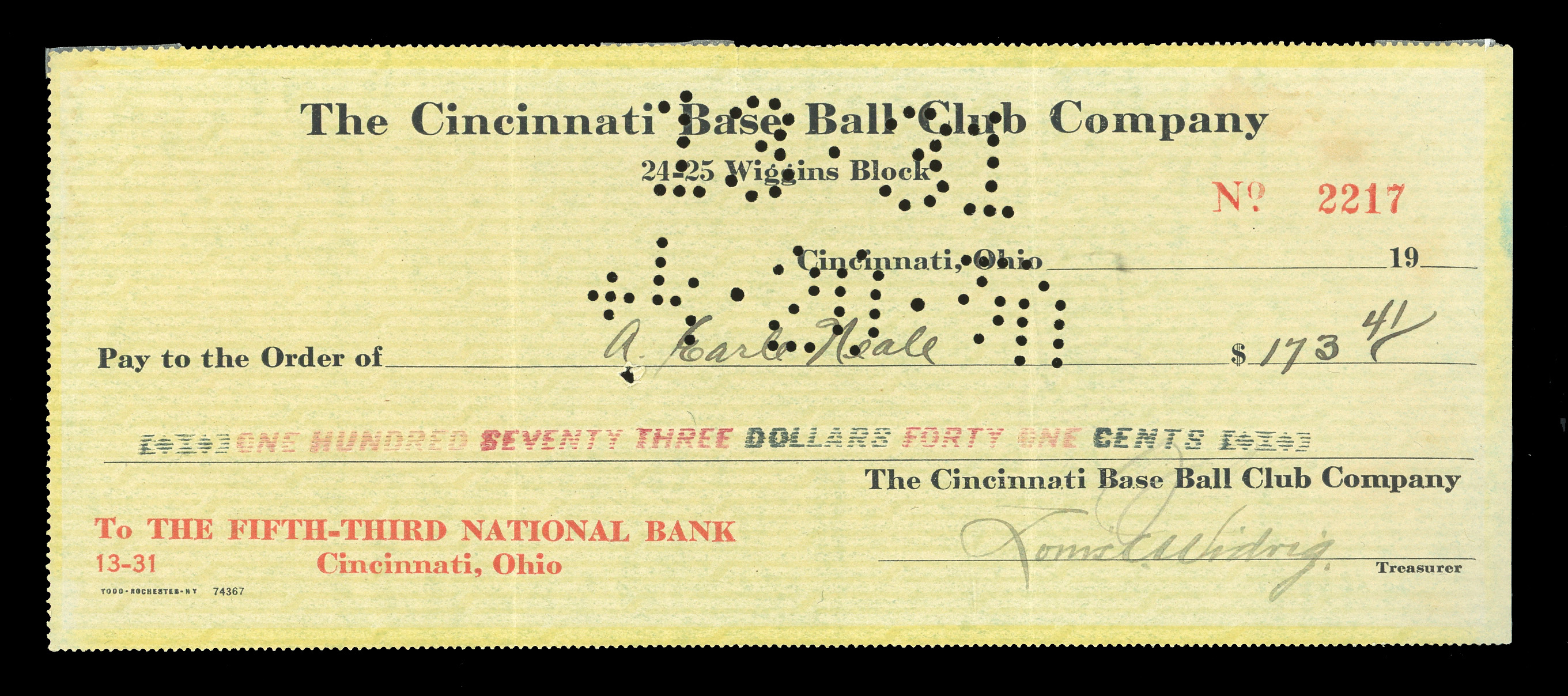 Cincinnati Reds payroll check issued to outfielder Greasy Neale during the 1920 season in the amount of $173.41. Drawn on the Fifth-Third National Bank of Cincinnati and signed by the team's treasurer, the check is endorsed by Neale on the reverse and features a number of bank cancellation marks. The check displays discoloration along the edges and tiny remnants of clear tape along the top edge from having once been mounted within a display. Notably, Neale was a member of the famed 1919 World Championship team, which defeated the Chicago White Sox amid the "Black Sox" scandal to win the franchise's first title. He is also a member of the College Football Hall of Fame and spent time as a head coach in the National Football League following his baseball career. This is one of an exceptional grouping of scarce 1920 Reds payroll checks offered within this auction. Auction LOA from James Spence/JSA.