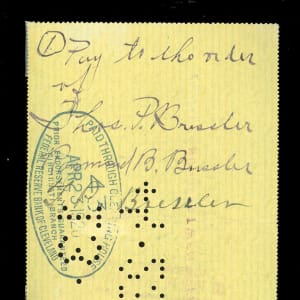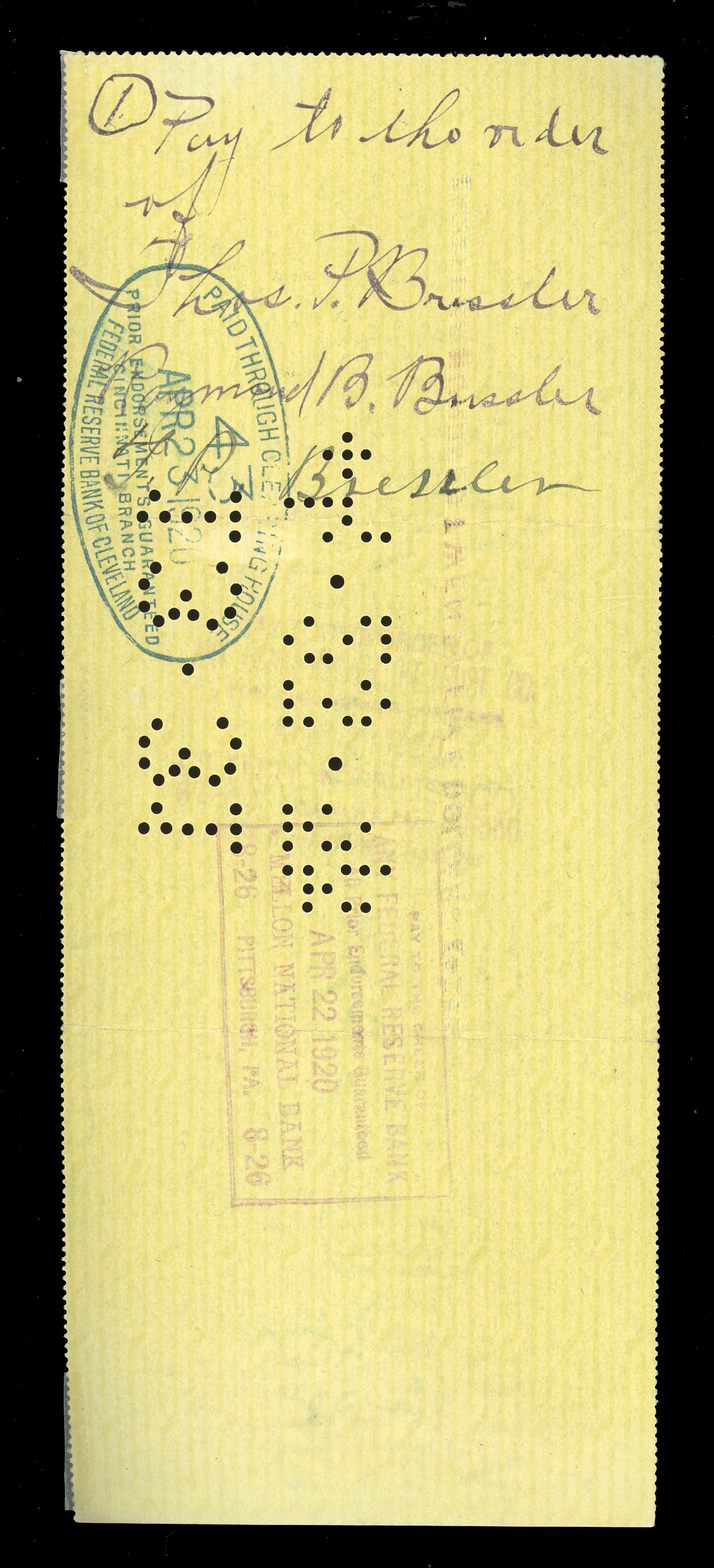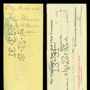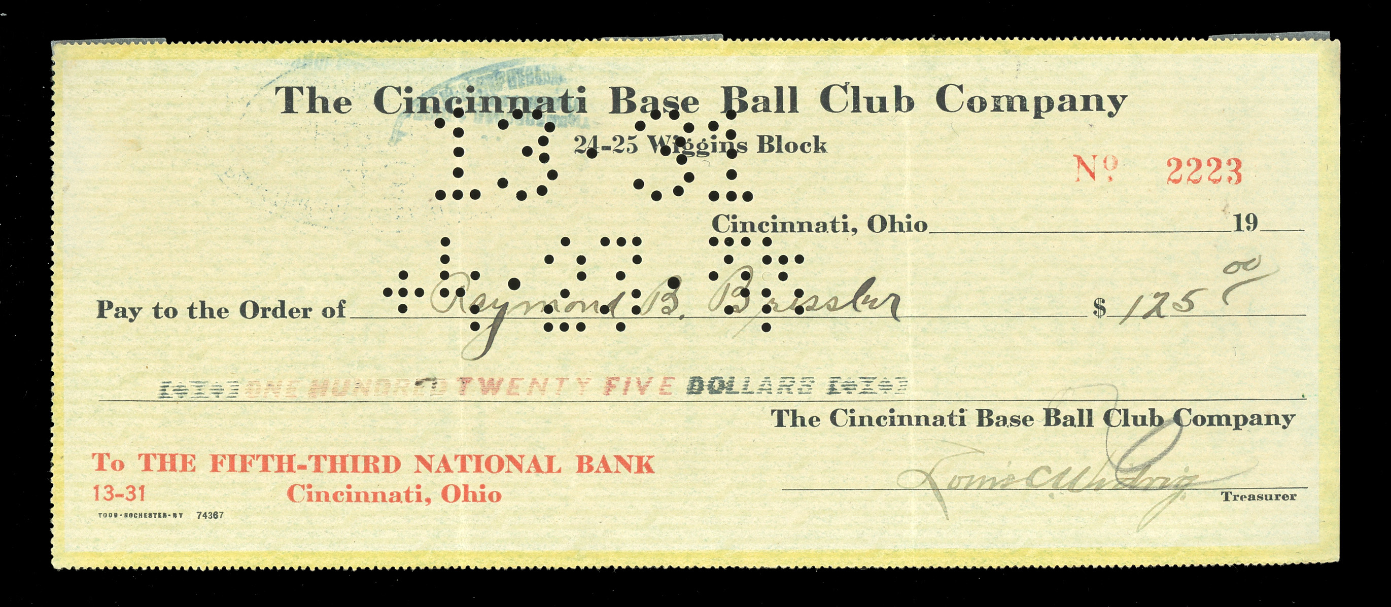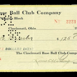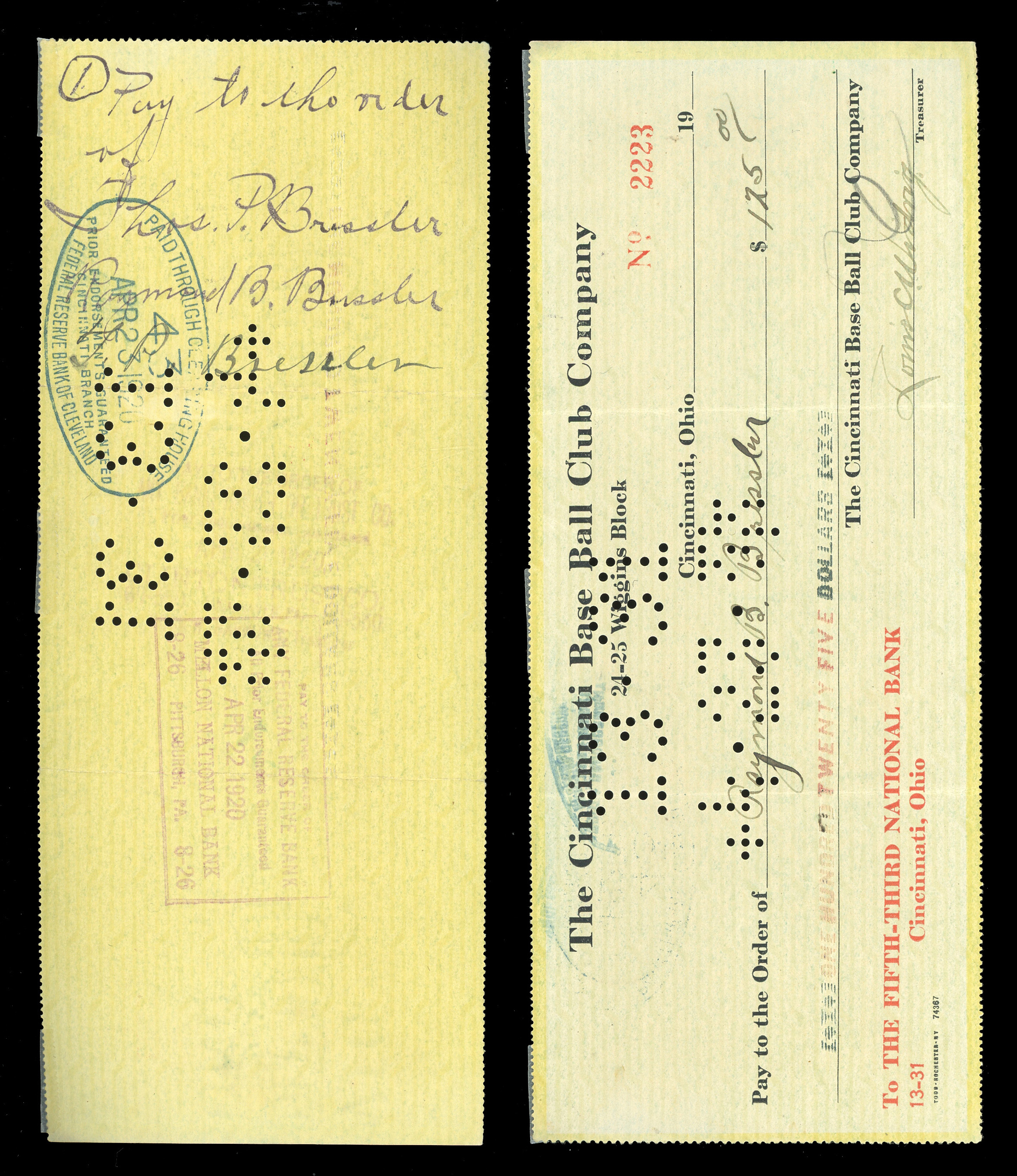 Cincinnati Reds payroll check issued to outfielder Rube Bressler during the 1920 season in the amount of $125.00. Drawn on the Fifth-Third National Bank of Cincinnati and signed by the team's treasurer, the check is endorsed by Bressler (secretarial signature as per JSA) on the reverse and features a number of bank related stamps and cancellation marks, including one dated April 23, 1920. The check displays two vertical folds as well as discoloration along the edges and tiny remnants of clear tape along the top edge from having once been mounted within a display. Notably, Bressler was a member of the famed 1919 World Championship team, which defeated the Chicago White Sox amid the "Black Sox" scandal to win the franchise's first title. This is one of an exceptional grouping of scarce 1920 Reds payroll checks offered within this auction.