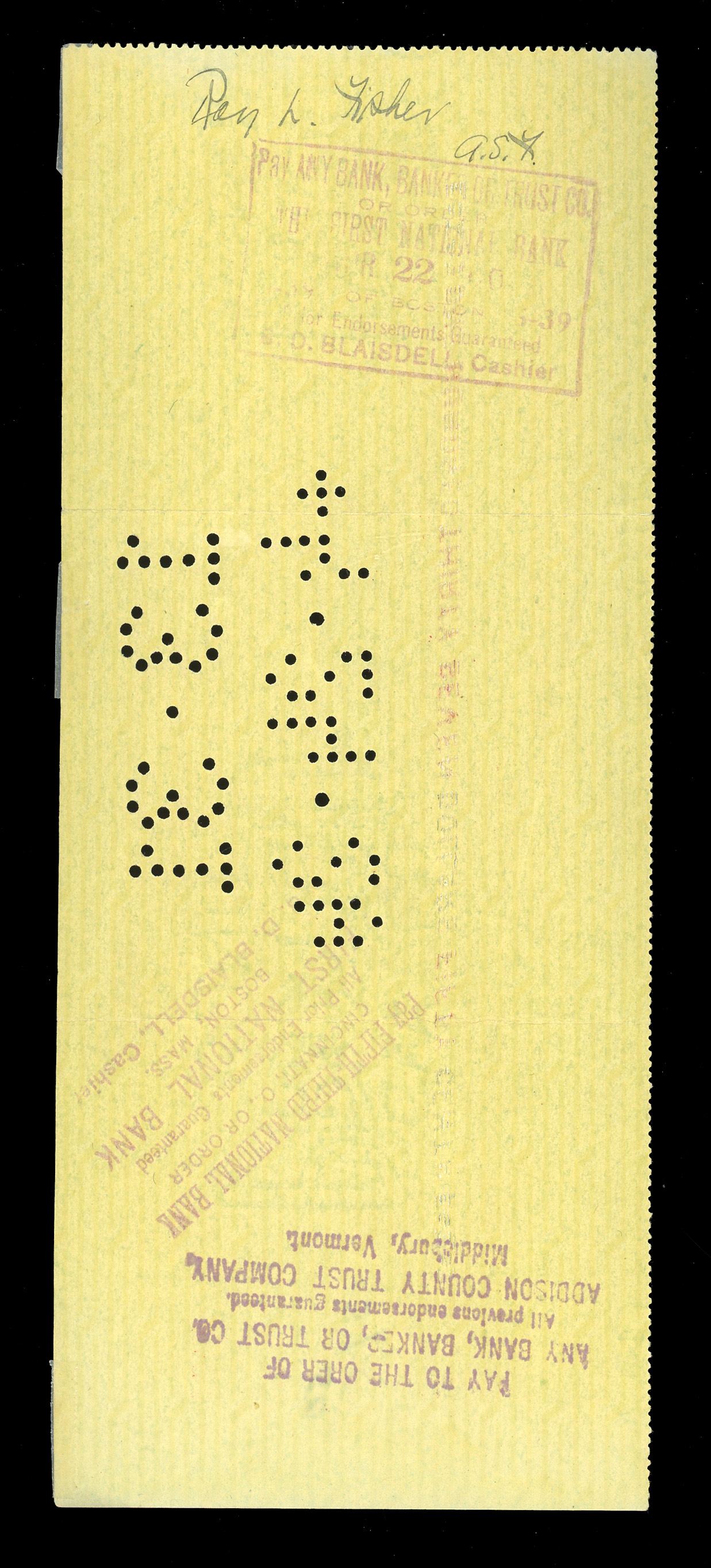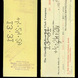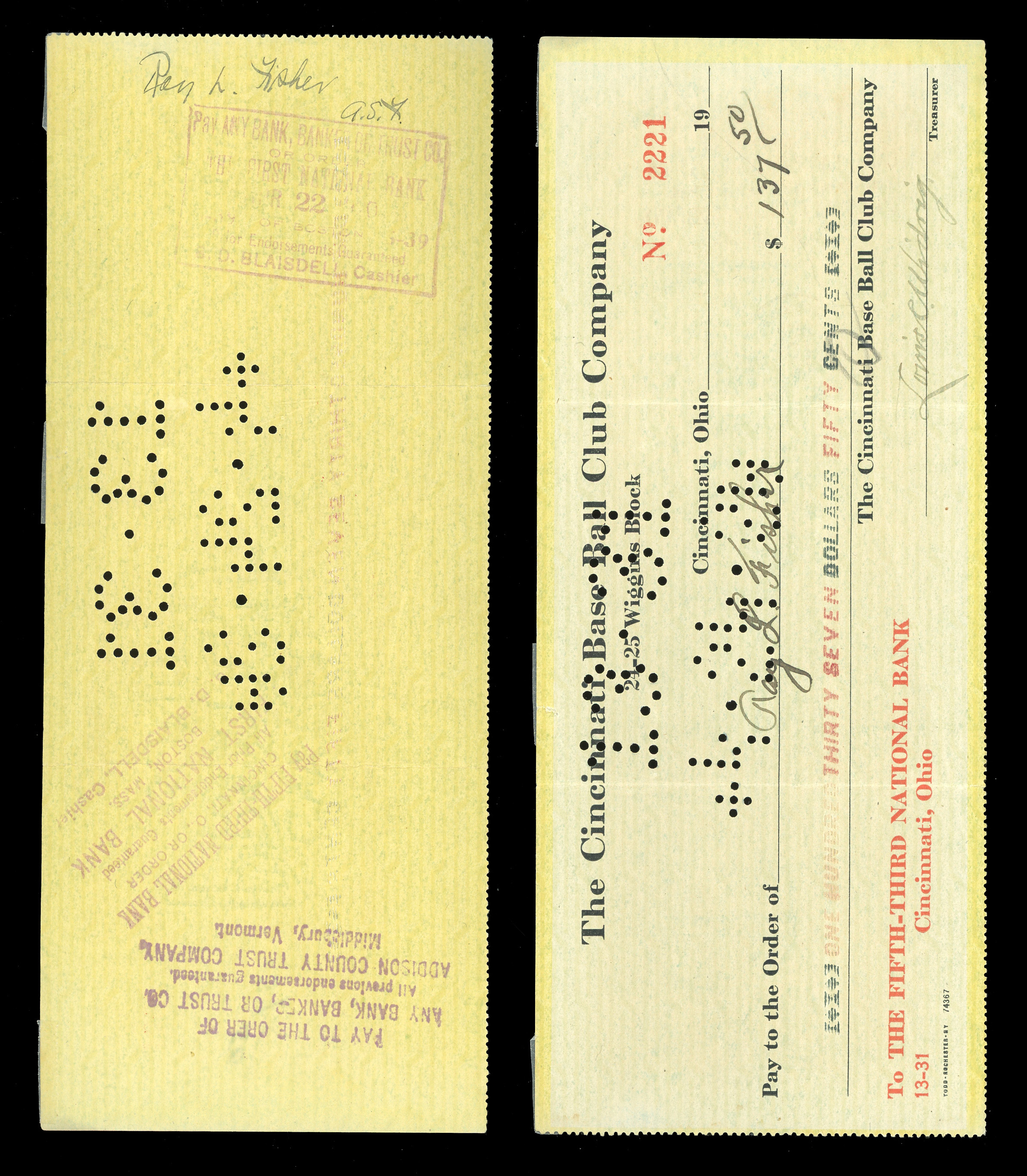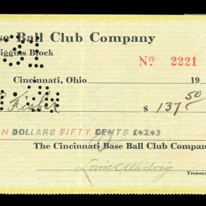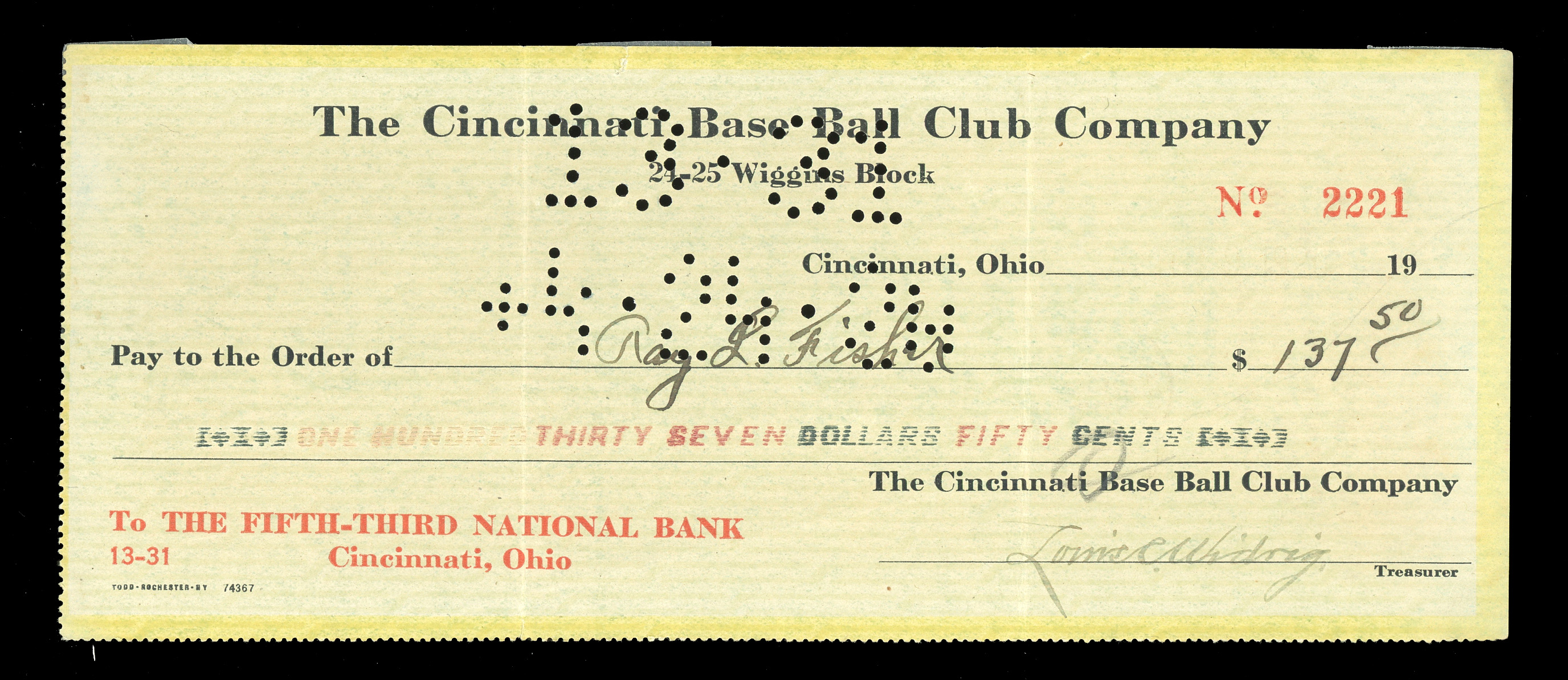 Cincinnati Reds payroll check issued to pitcher Ray Fisher during the 1920 season in the amount of $137.50. Drawn on the Fifth-Third National Bank of Cincinnati and signed by the team's treasurer, the check is endorsed by Fisher (secretarial signature as per JSA) on the reverse and features a number of bank related stamps and cancellation marks. The check displays two vertical folds as well as discoloration along the edges and tiny remnants of clear tape along the top edge from having once been mounted within a display. Notably, Fisher was a member of the famed 1919 World Championship team, which defeated the Chicago White Sox amid the "Black Sox" scandal to win the franchise's first title. This is one of an exceptional grouping of scarce 1920 Reds payroll checks offered within this auction.