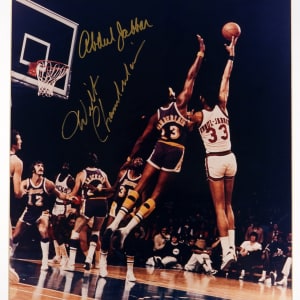 What a match-up! Legendary big men Wilt Chamberlain and Kareem Abdul-Jabbar scored 69,000+ points over their NBA careers and competed over several high-profile games. The prolific Hall of Fame tandem are truly "worth their weight in gold" with this dual-signed 16x20 photograph. Matted to overall 22x24 dimensions, the gold Sharpie autographs are exceptionally bold with Abdul-Jabbar presenting "10" and Chamberlain boasting "9" strengths. A fantastic display piece of a seldom encountered pairing! Pre-certified by PSA/DNA. The size/weight of this item requires that there will be an additional shipping charge for this lot.
