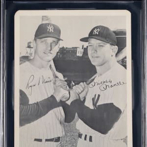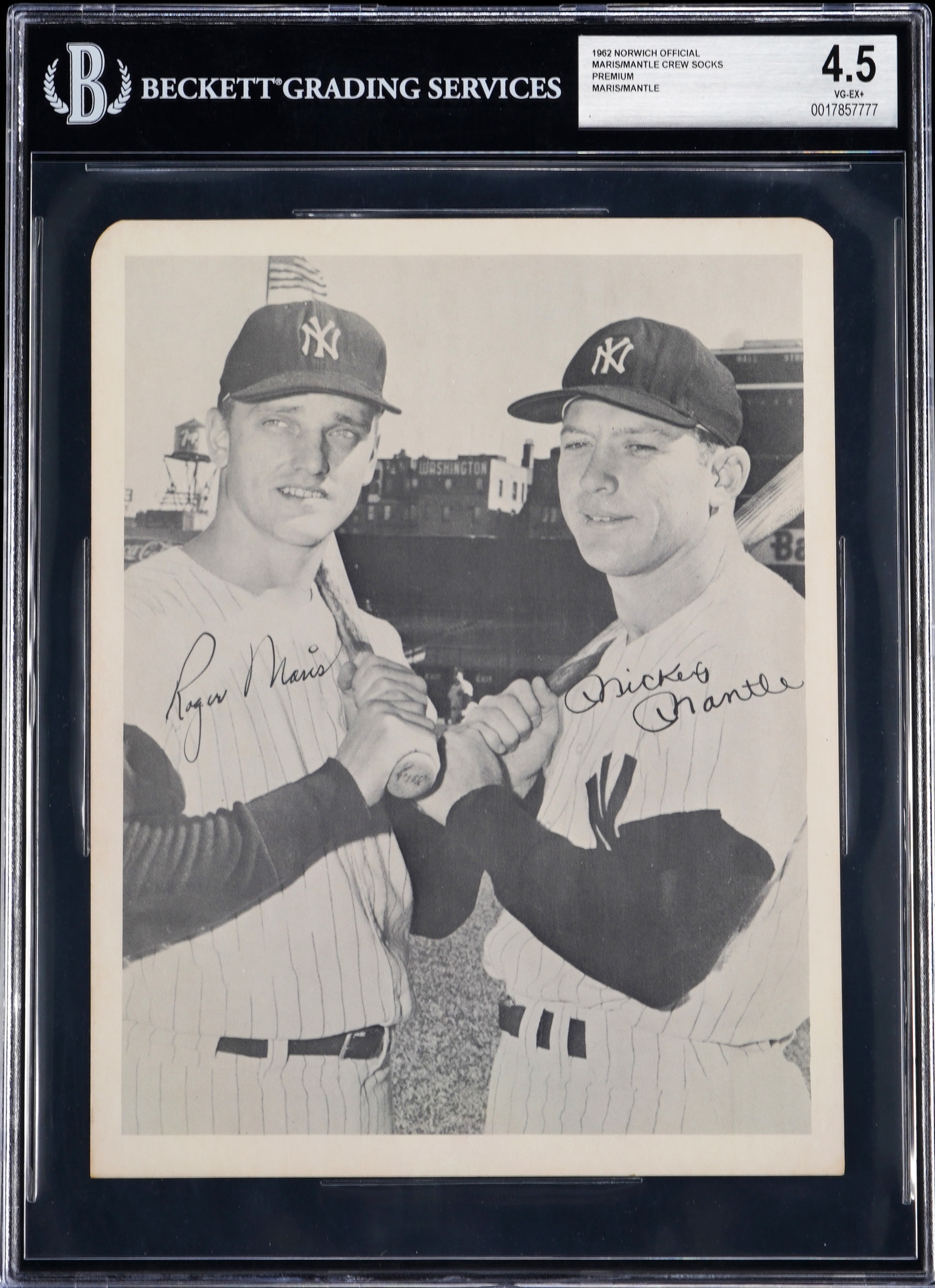 Graded VG-EX+ 4.5 by BGS. Following the relentless assault of "The M & M Boys" on American League pitching staffs during the early 1960s, national and regional sponsors lined up to have the New York Yankees sluggers promote their products. Mickey Mantle and Roger Maris go back-to-back on the offered 1962 Norwich Crew Socks 8x10 premium photo. A very attractive black-and-white representation of these game wreckers.