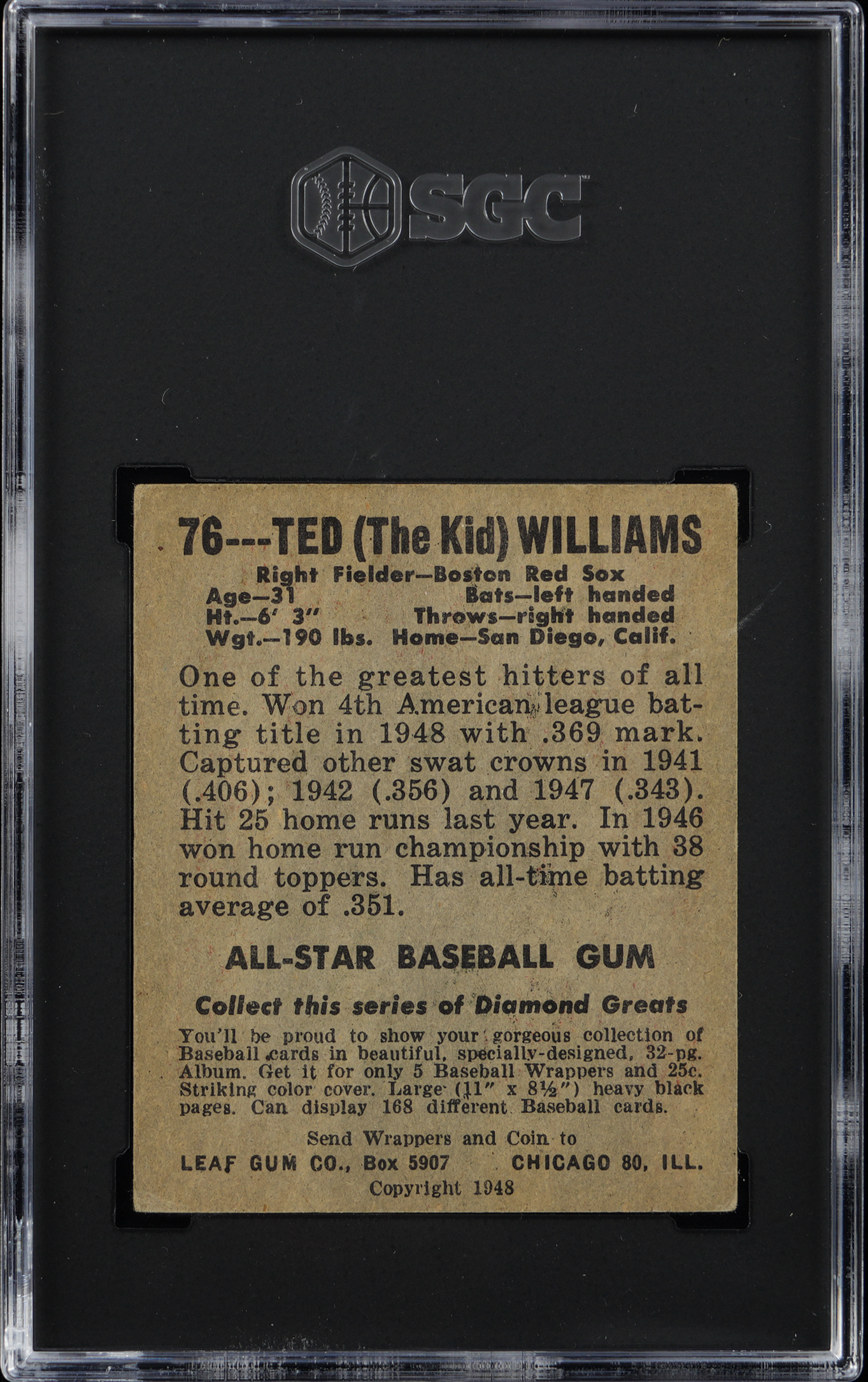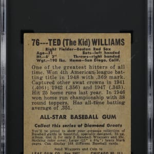 Graded POOR 1 by SGC. Smashing 1948-1949 Leaf #76 Ted Williams. "The Splendid Splinter" admires a prolific clout on this "collector's grade" ball card with slight pencil writing on the upper left corner. The player/setting colors of this Boston Red Sox Hall of Famer are bright and the reverse touting Williams as "one of the greatest hitters of all time" is wax-stain free.