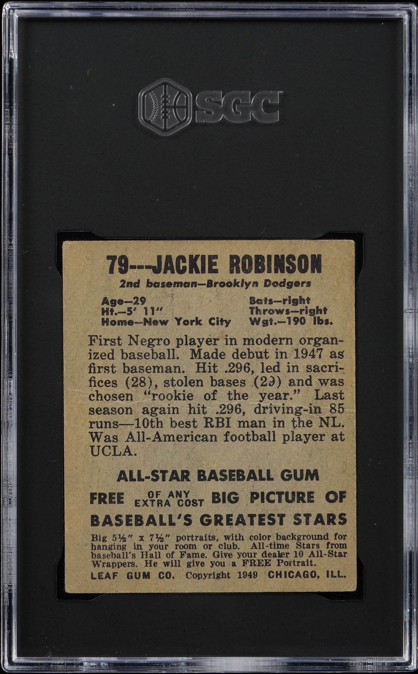 Graded POOR 1 by SGC. Important 1948-1949 Leaf #79 Jackie Robinson rookie card. This American treasure is decently centered with only modestly touched corners, off-white edges and light horizontal creasing tracing through Robby's face. The front upper left corner displays a faint pencil notation and the biographical reverse is clean. A diamond debut of the Brooklyn Dodgers Hall of Famer that is desirable across the condition spectrum!
