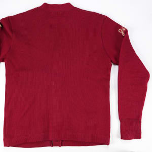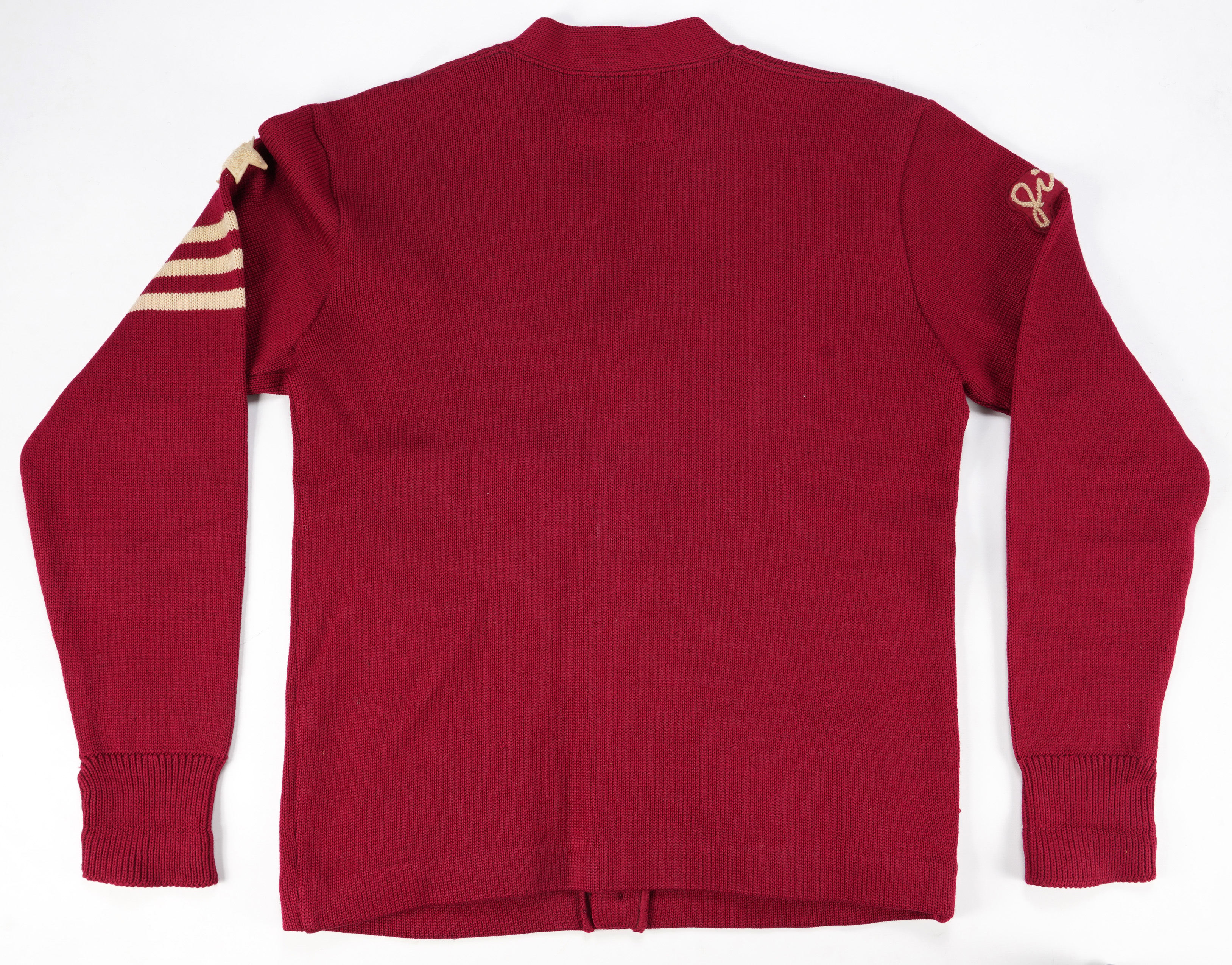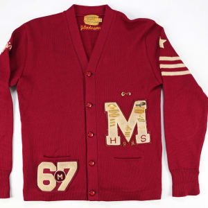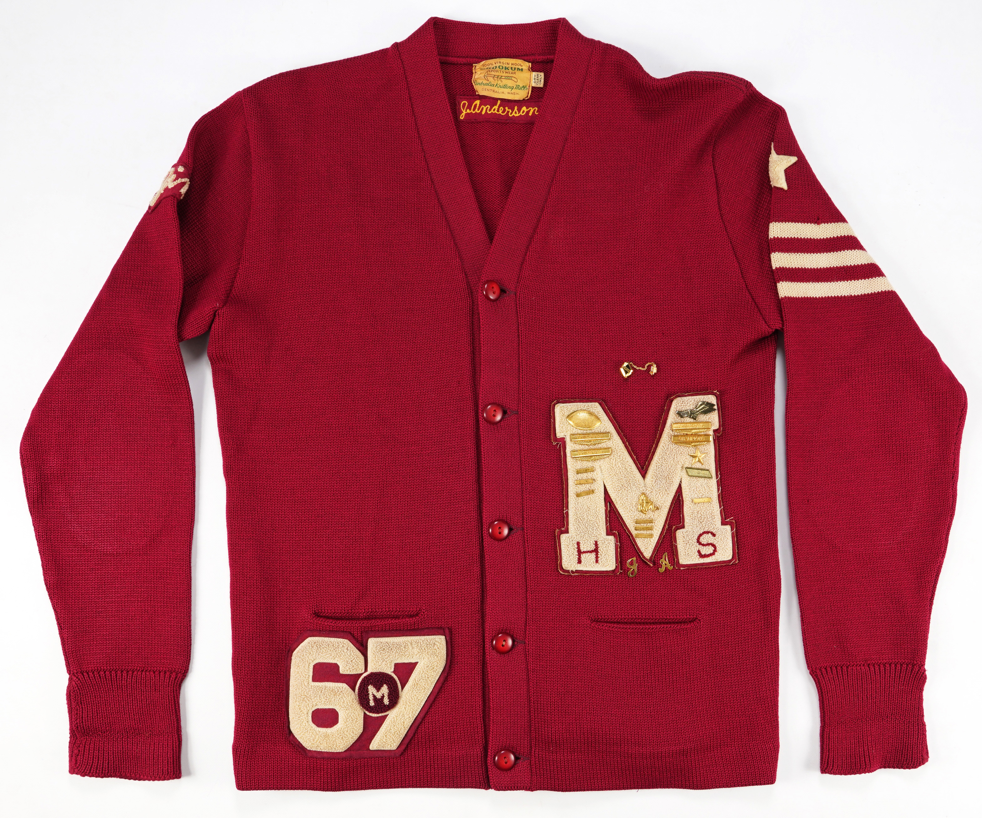 Exceptional letterman's sweater dating to the late 1960s and issued to an individual named Jim Anderson. While Anderson's credentials and his high school are unknown, the sweater serves as a time capsule that captures a look into American high school culture during this era. Athletes proudly showed off their team allegiances and accomplishments. We know from the pins affixed to the front of the sweater than Anderson was a four time champion during his tenure and participated in football and track. A total of 18 pins are present. The heavy wool sweater features a button up front and remains in outstanding condition. Anderson's name is chainstitched in the collar. A superb memento from 1960s sports culture!
