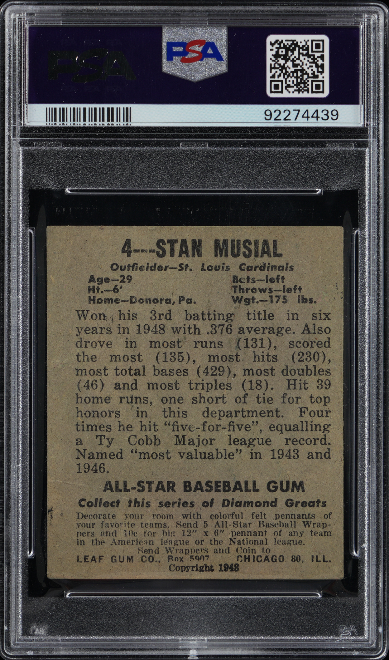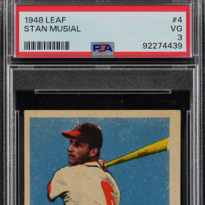 Graded VG 3 by PSA. Place the winning bid for the offered 1948 Leaf #4 Stan Musial rookie card. This St. Louis Cardinals Hall of Fame slugger is quite clean with only moderately touched corners, bright white edges and a clean biographical reverse.
