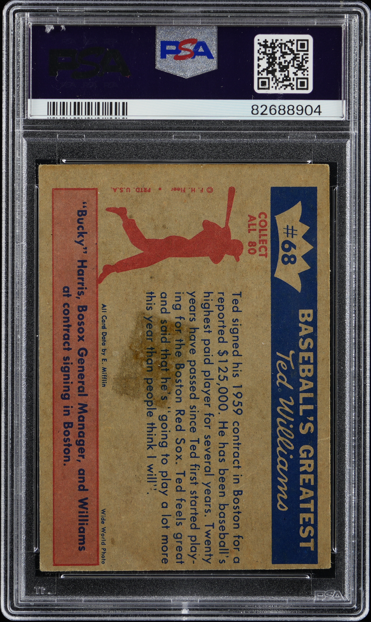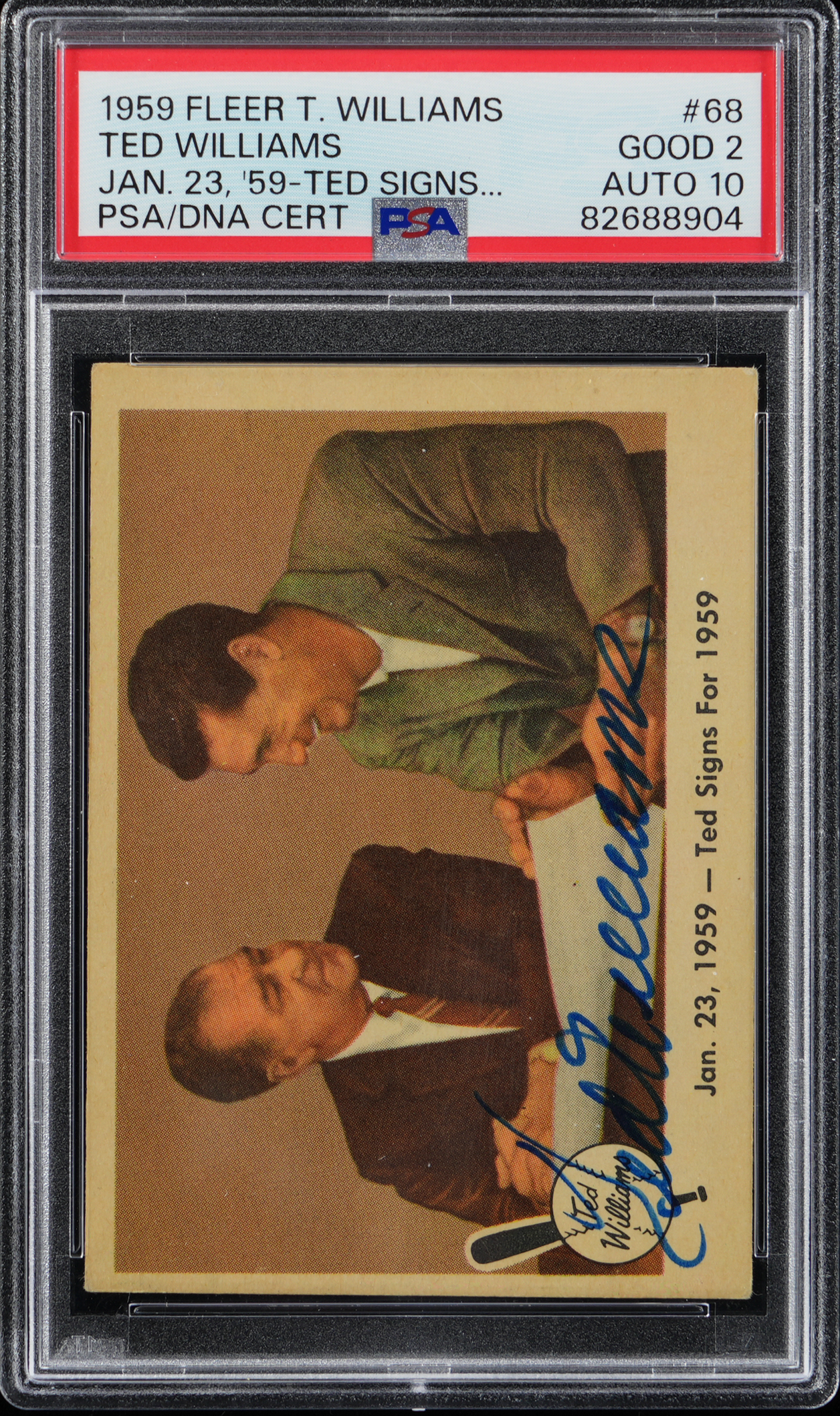 Signature judged Authentic by PSA/DNA and encapsulated with a perfect "10" Auto grade! Supercharge your 1959 Fleer Ted Williams collection with the offered #68 "Ted Signs" shortprint that is also signed by the Boston Red Sox Hall of Famer. While the card has been graded GOOD 2 by PSA due to reverse hinge residue. the front presents much nicer with solid corners, clean edges and focused registration. A prime coupling of a tough shortprint that also crossed paths with "The Splendid Splinter!"