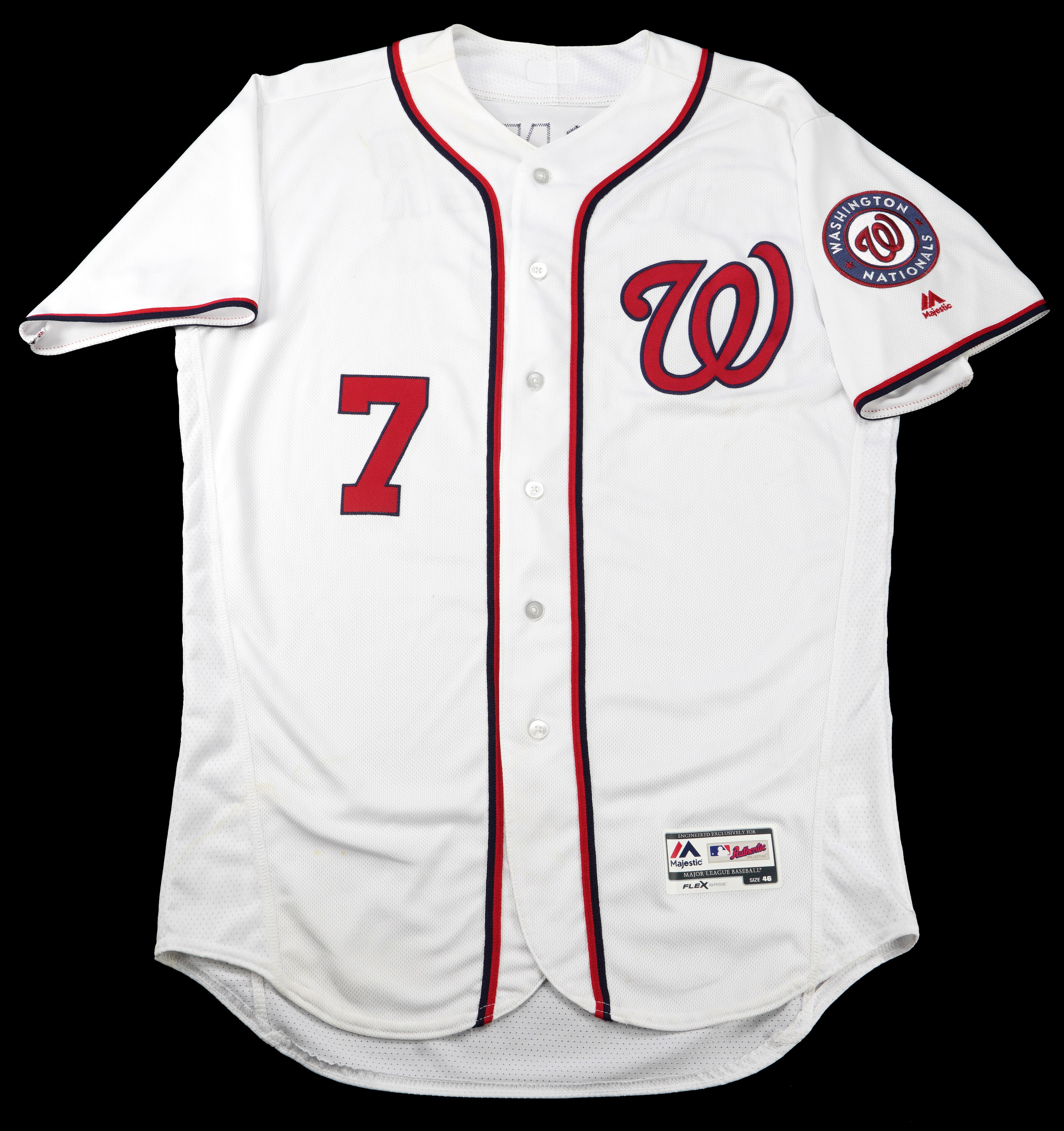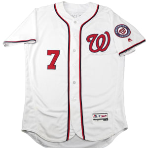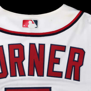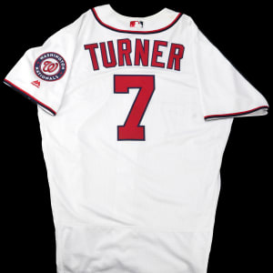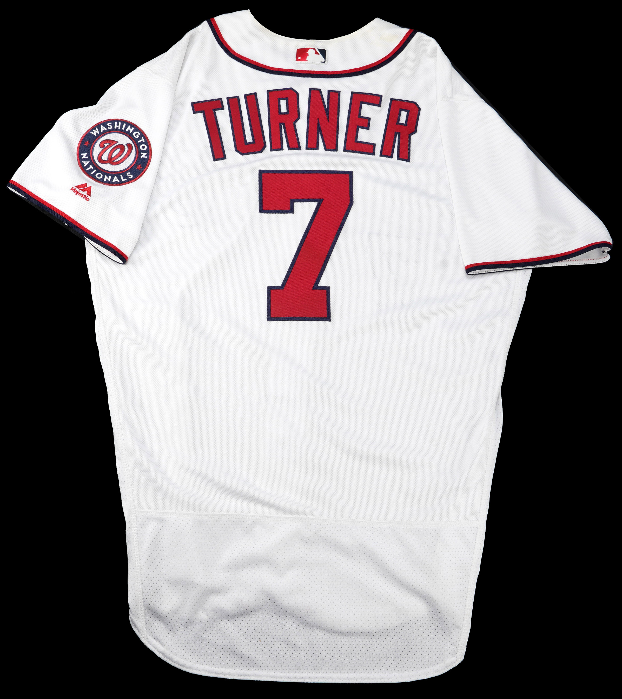 3-time All-Star, Trea Turner, played in 27 games in 2015, but his official rookie campaign was 2016, where he finished 2nd in NL Rookie of the Year voting. This size 46 jersey with “Turner 7” on the back and Washington Nationals patch on the left sleeve shows light use. It was purchased as game-used at the MLB shop at Nationals Park and features a defunct Q-R code from Majestic Authentic Collection.