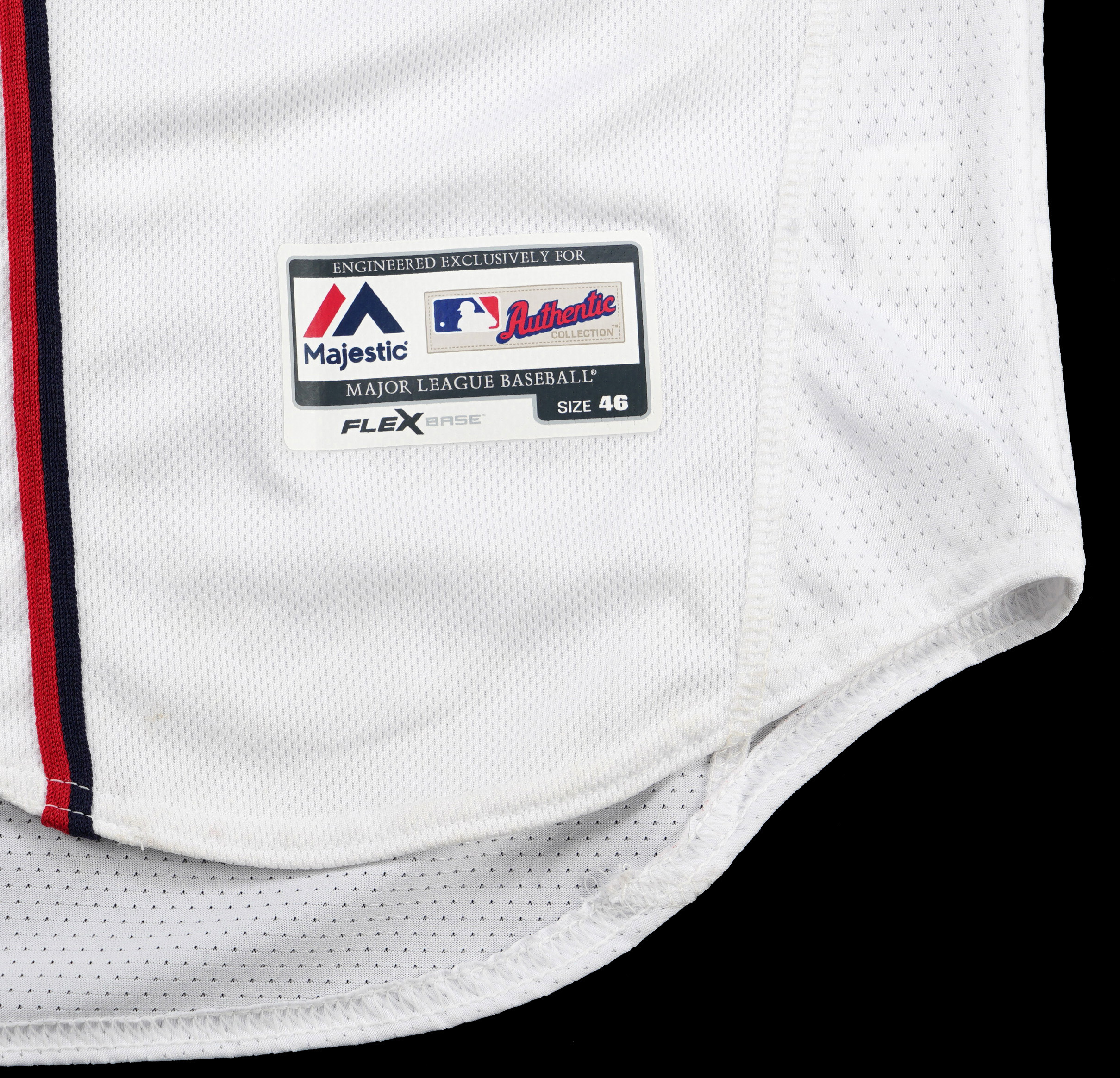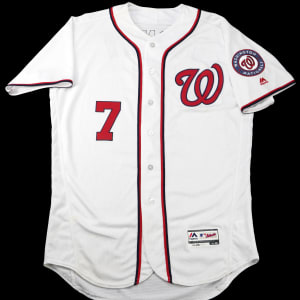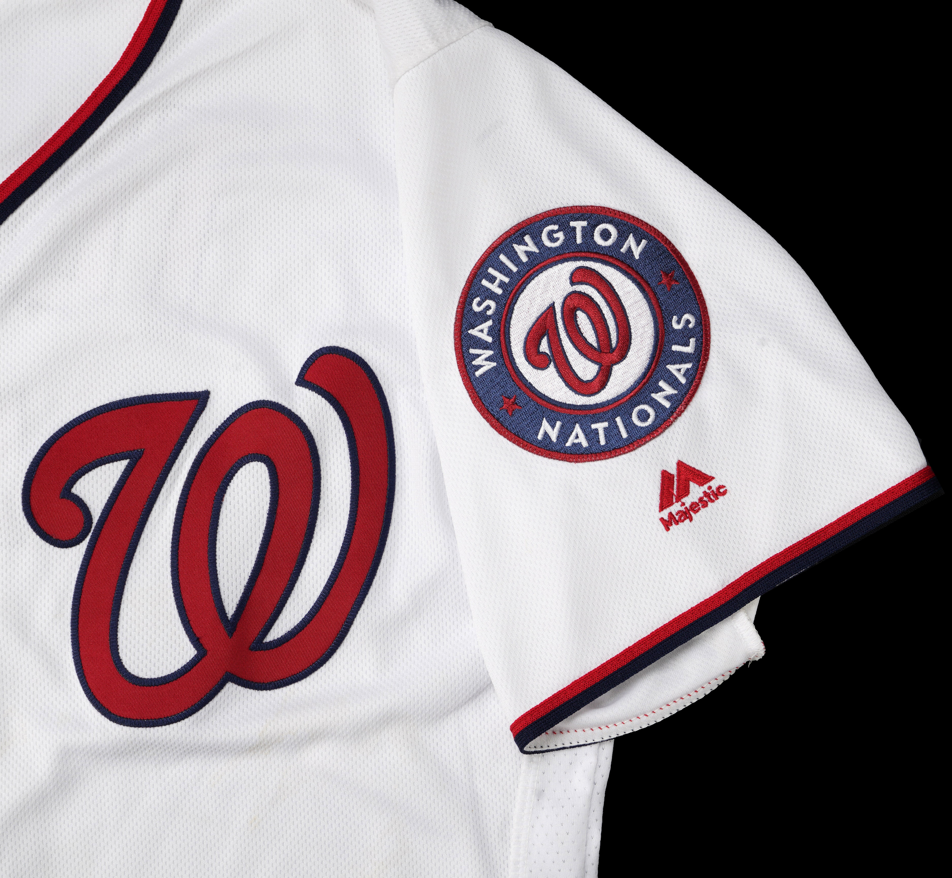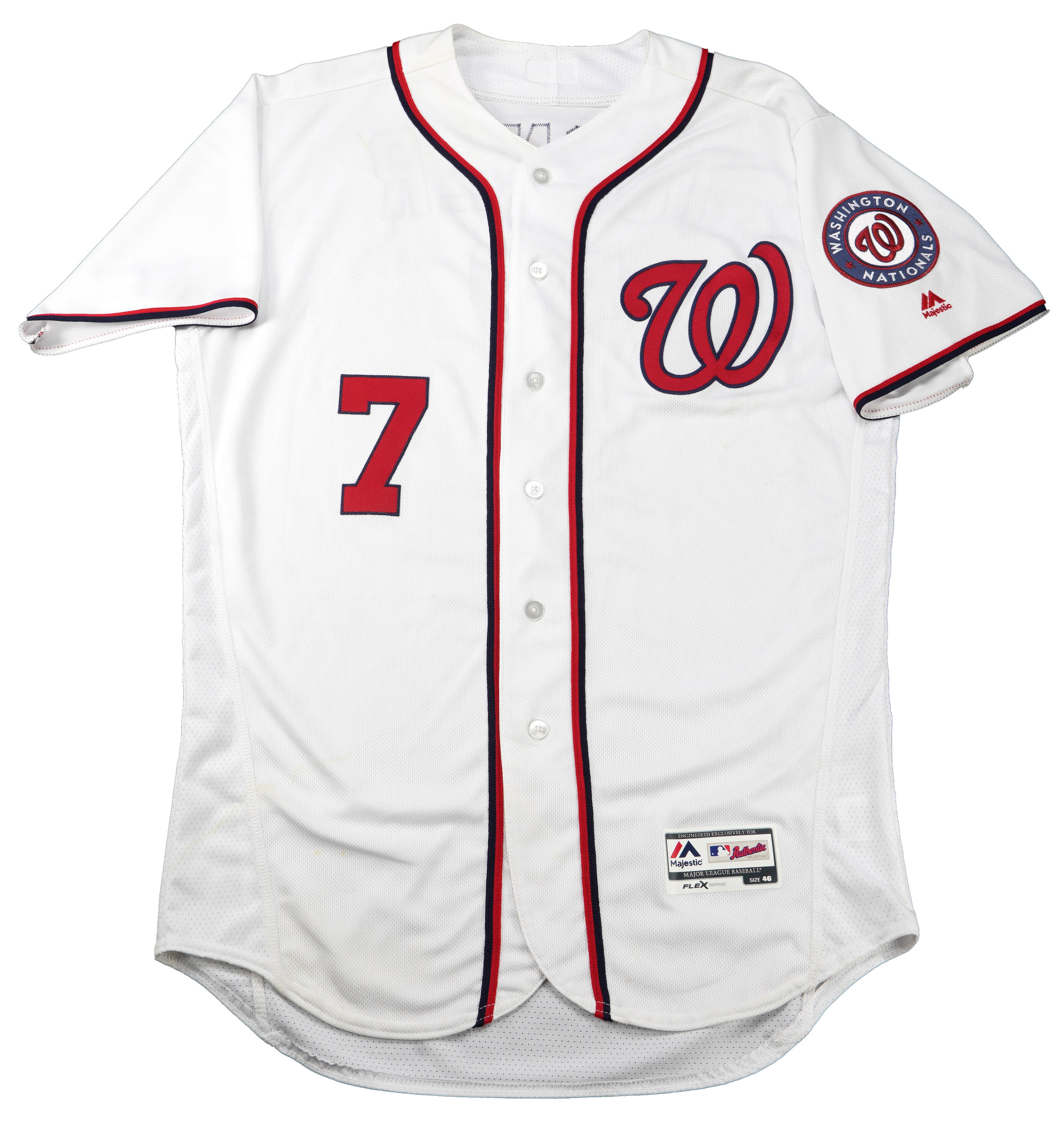 3-time All-Star, Trea Turner, played in 27 games in 2015, but his official rookie campaign was 2016, where he finished 2nd in NL Rookie of the Year voting. This size 46 jersey with “Turner 7” on the back and Washington Nationals patch on the left sleeve shows light use. It was purchased as game-used at the MLB shop at Nationals Park and features a defunct Q-R code from Majestic Authentic Collection.