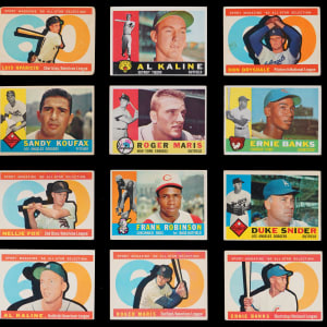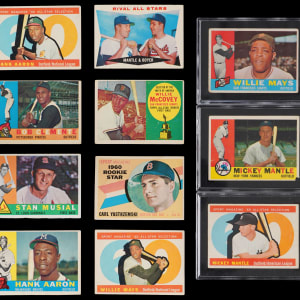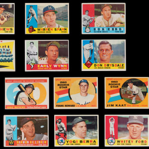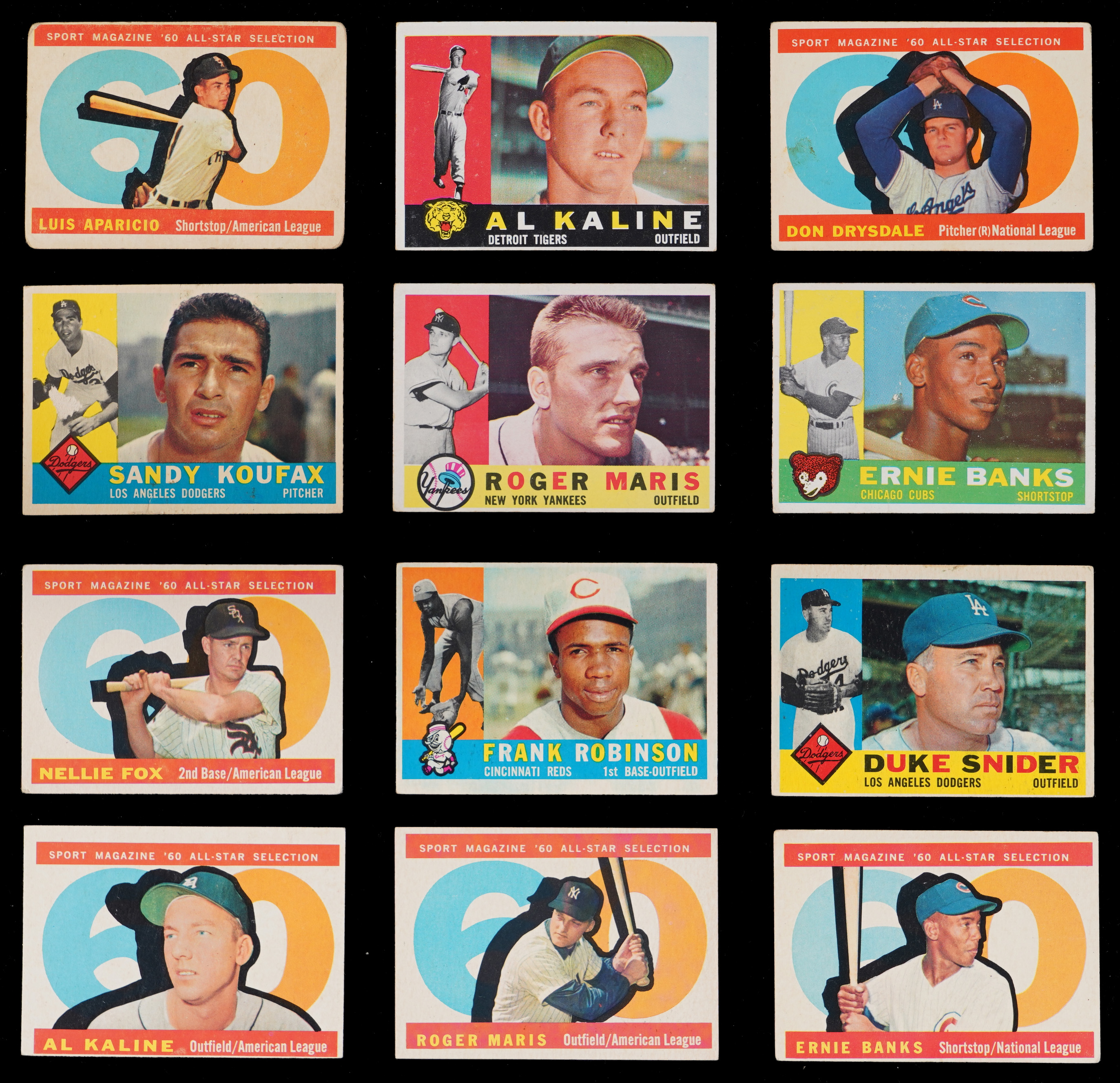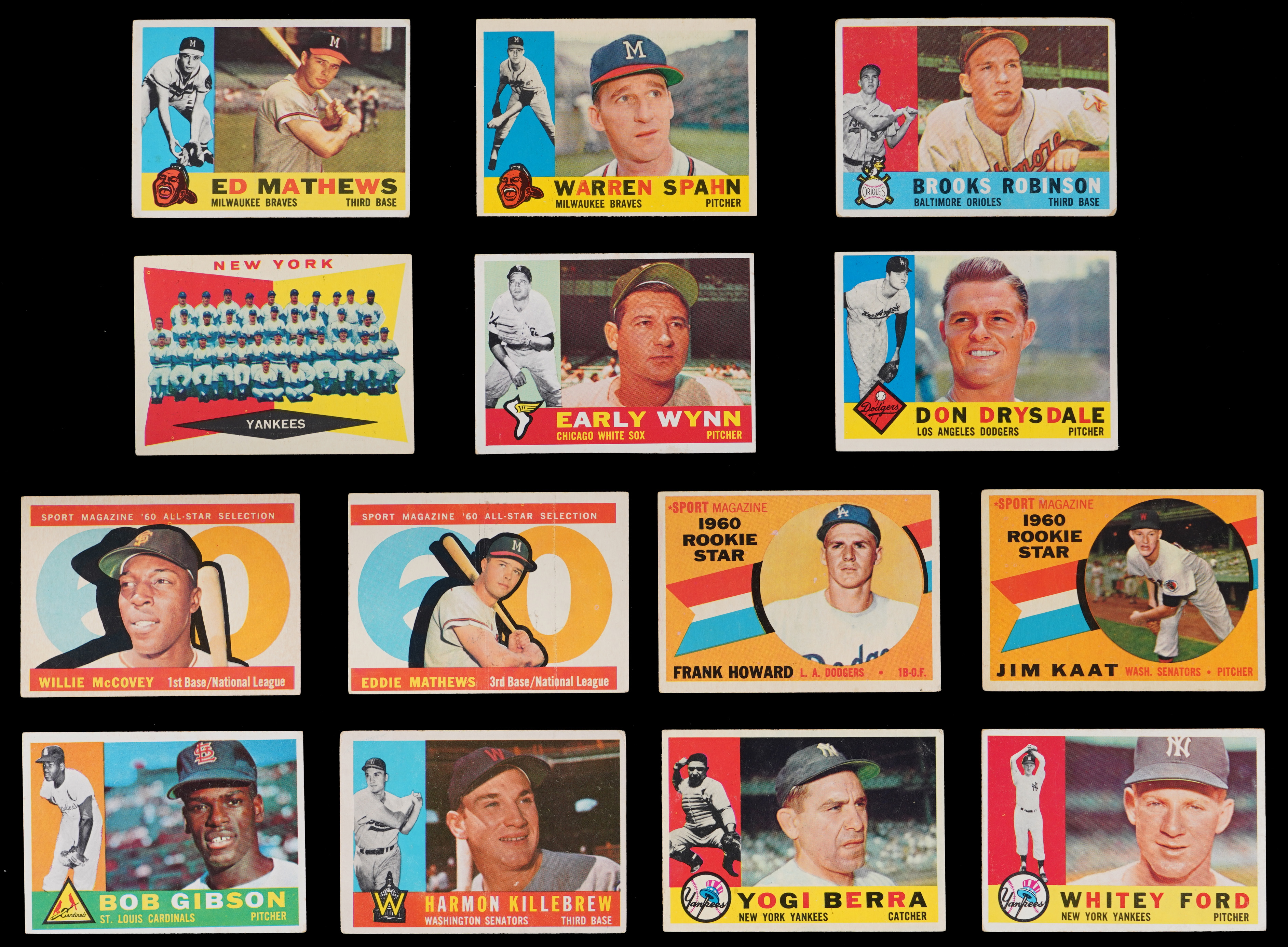 Featured is a 1960 Topps complete set of (572) cards with a trio of graded keys. This horizontal edition has an approximate condition breakdown of 10% (EX or better), 30% (VG-EX), 30% (VG) and 30% (GD or lesser) with the tougher high series generally presenting a touch lesser than the more available numbers. Highlights include: #1 Wynn (VG), #10 Banks (GD), #18 Dodgers Team (GD), #28 B. Robinson (GD), #35 Ford (GD), #50 Kaline (VG), #73 Gibson (VG), #132 F. Howard RC (VG), #136 Kaat RC (GD), #148 Yastrzemski RC (FR), #160 Mantle/Boyer (GD), #200 Mays (SGC FAIR 1.5), #210 Killebrew (GD), #250 Musial (VG), #300 Aaron (PR, paper loss), #316 McCovey RC (GD), #326 Clemente (VG), #332 Yankees Team (VG), #343 Koufax (VG), #350 Mantle (SGC POOR 1), #377 Maris (VG), #420 Mathews (GD), #445 Spahn (GD), #475 Drysdale (VG), #480 Berra (FR), #484 Pirates Team (VG-EX), #490 F. Robinson (VG), #493 Snider (GD), #554 McCovey AS (VG-EX), #555 Fox AS (VG), #558 Mathews AS (VG), #559 Aparicio AS (FR), #560 Banks AS (FR), #561 Kaline AS (VG), #563 Mantle AS (SGC POOR 1), #564 Mays AS (VG), #565 Maris AS (VG), #566 Aaron AS (GD) and #570 Drysdale AS (GD).