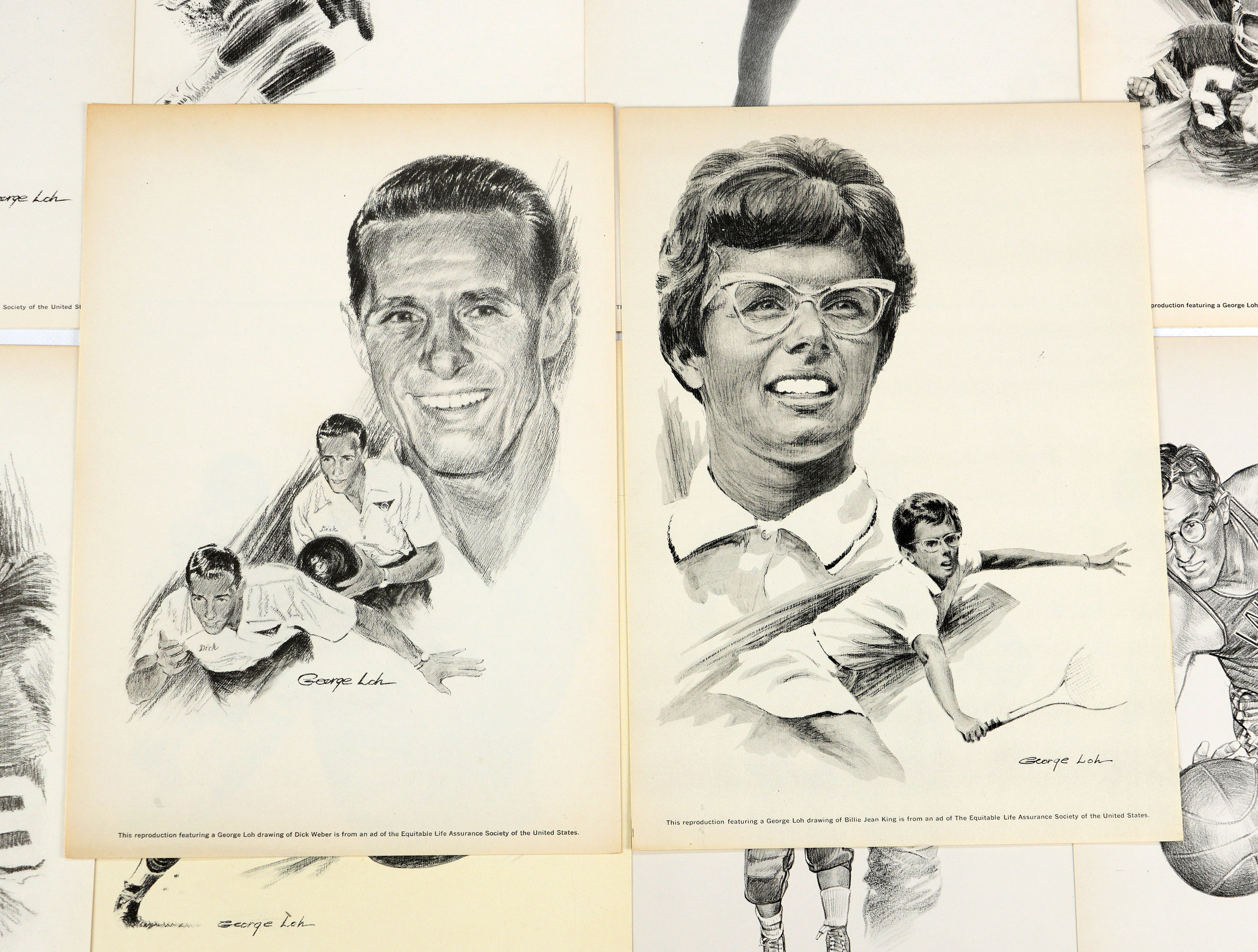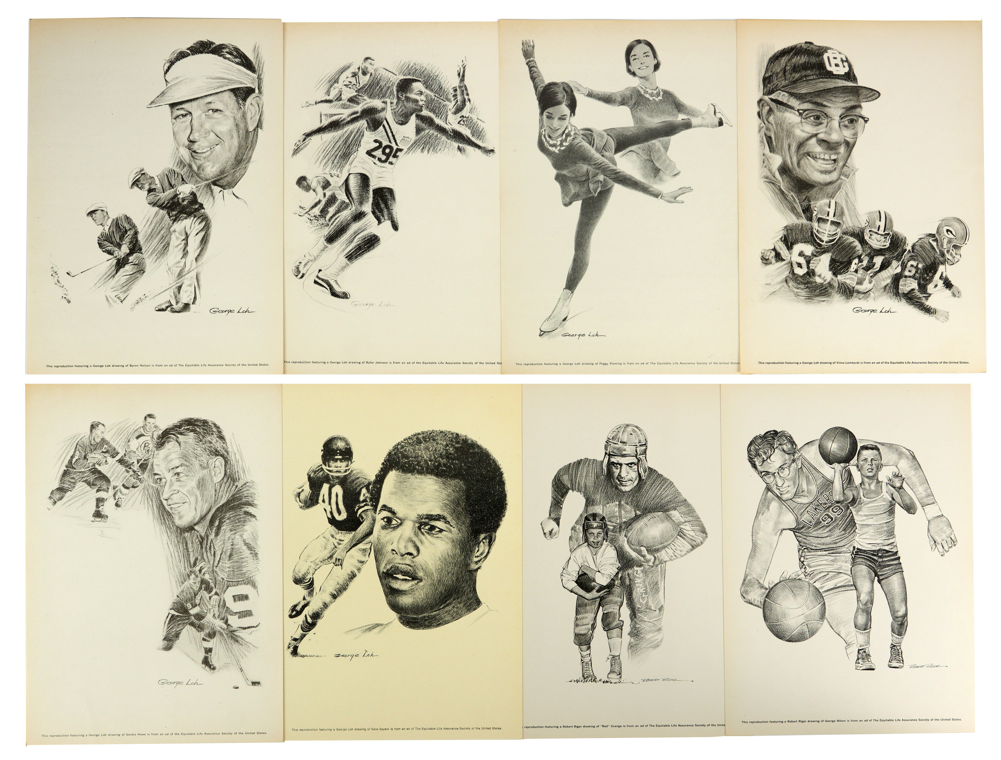These beautiful 8x11 artist prints from the 1960s on medium stock paper feature pencil, pen and ink artwork by George Loh and Robert Riger, and were produced for the Equitable Life Assurance Society of the United States. They are in Excellent or better condition and include all-time great athletes from many different sports. Highlights include: Vince Lombardi, Elroy “Crazy Legs” Hirsch, Red Grange, Johnny Unitas, Gale Sayers, Jim Brown, Jim Thorpe, Bronko Nagurski, Gordie Howe, Elgin Baylor, Jerry Lucas, Phil Esposito, Wilt Chamberlain, Hal Greer, George Mikan, Willis Reed, Bill Russell, Billy Casper, Walter Hagen, Byron Nelson, Gene Sarazen, Sam Snead, Rafer Johnson, Bob Mathias, Jesse Owens, Wilma Rudolph, Don Budge, Billie Jean King, Althea Gibson, Don Carter, Dick Weber, Gertrude Eberle, Johnny Weissmuller, Peggy Fleming, Carol Heiss.