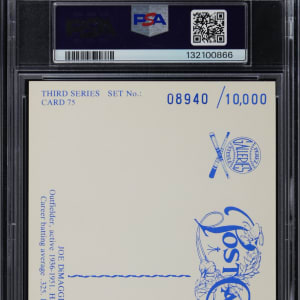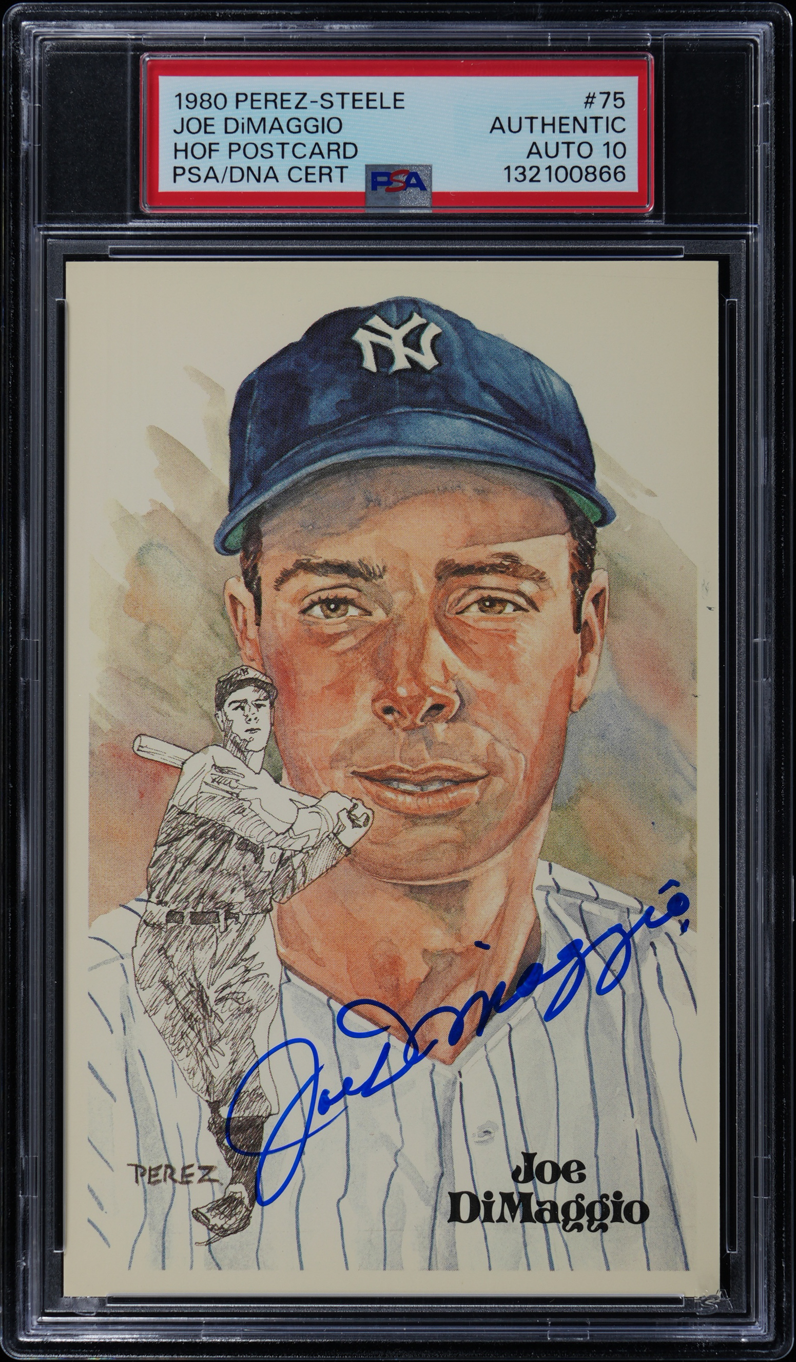 Signature judged Authentic by PSA/DNA, encapsulated, and awarded a 10 Auto grade. Add a "jolt" to your New York Yankees themed collection with the offered 1980 Perez-Steele Hall of Fame Postcard #75 Joe DiMaggio signed example.