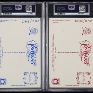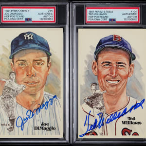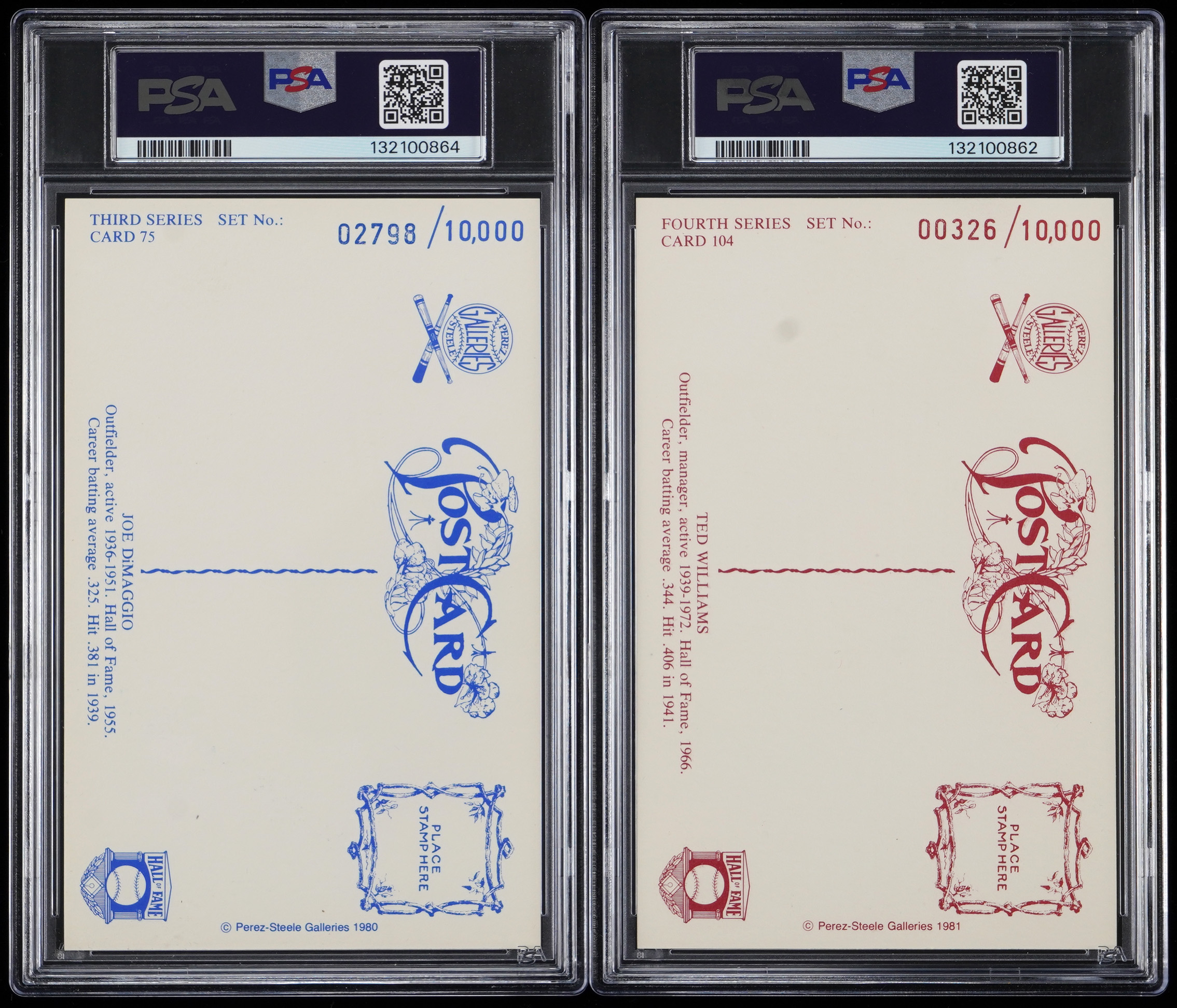 Each signature judged Authentic by PSA/DNA and encapsulated. "The Summer of '41" is revisited with the offered pair of 1980 and 1981 Perez-Steele Hall of Fame Postcards penned by legends "Joltin' Joe" and "Teddy Ballgame." Includes: 1.) 1980#75 DiMaggio (Auto 9) and 2.) 1981 #104 T. Williams (Auto 8).