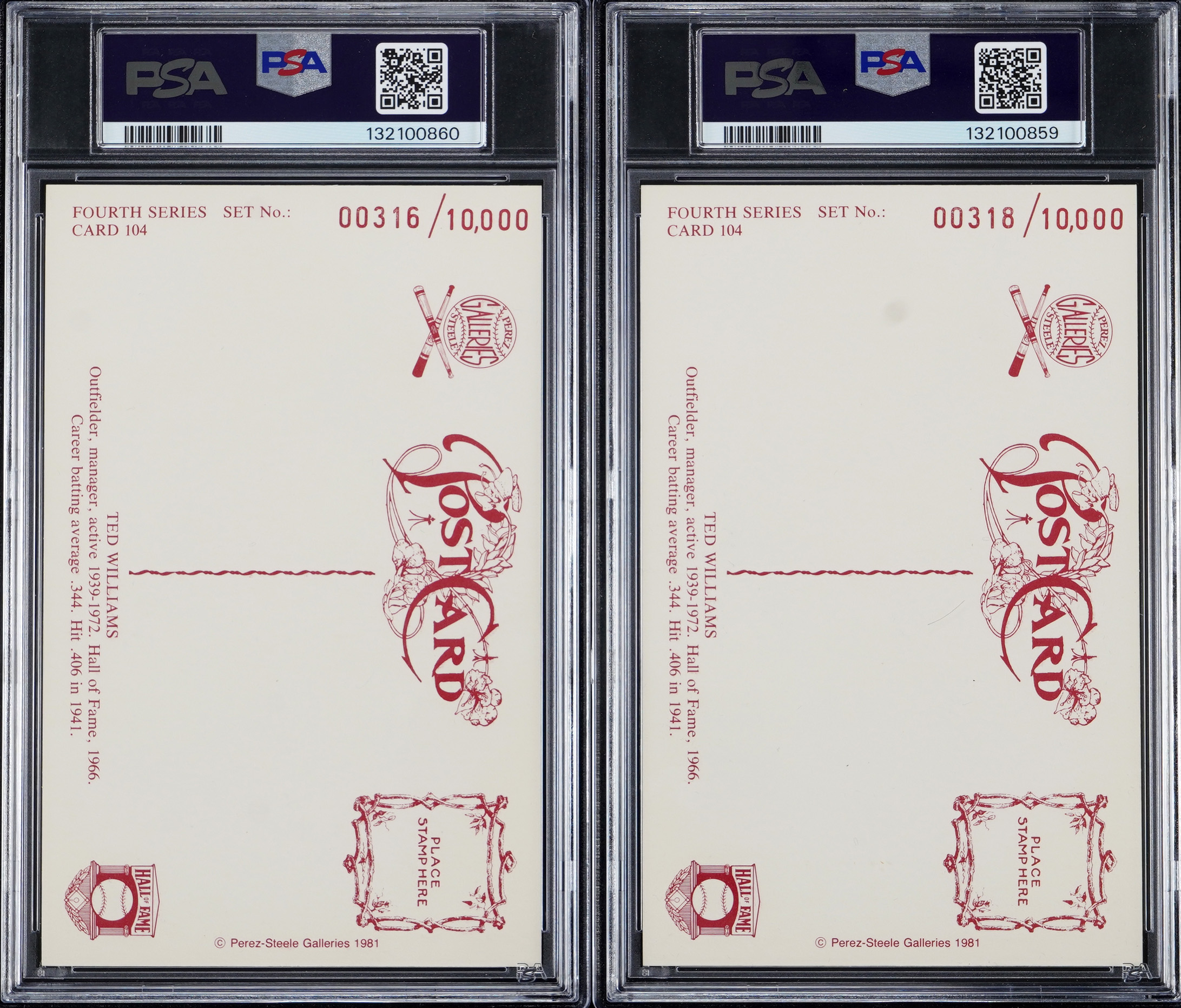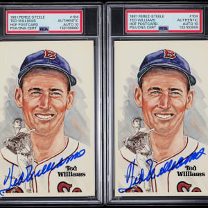 Each signature judged Authentic by PSA/DNA, encapsulated and awarded Auto 10 grades. Double the "Teddy Ballgame" with the offered pair of flawless 1981 Perez-Steele #104 Ted Williams signed postcards!
