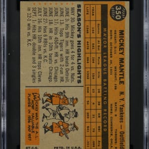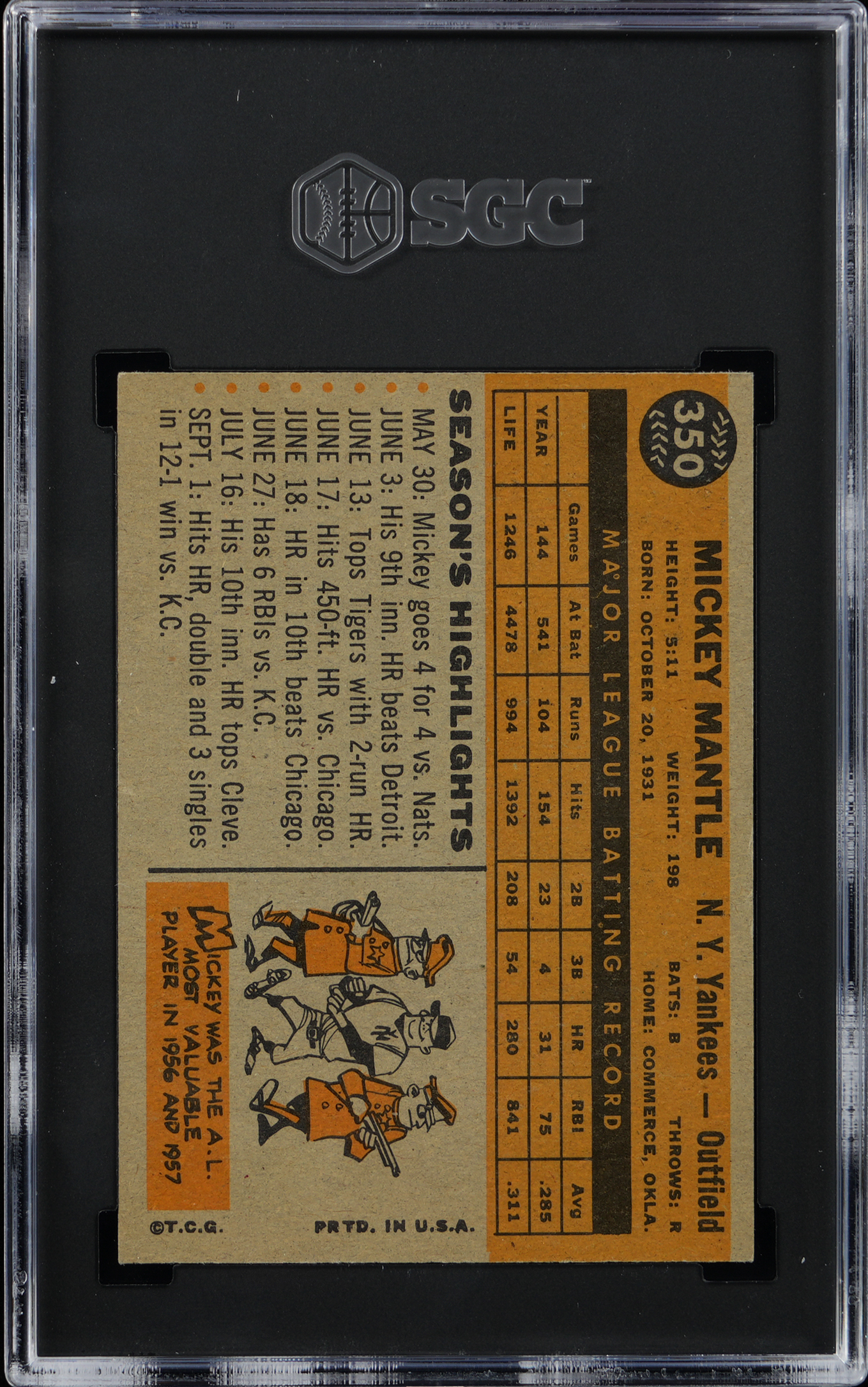 Graded EX/NM 6 by SGC. Crown your 1960 Topps set with the offered 1960 Topps #350 Mickey Mantle centerpiece. This crisp #7 is amplified by four sharp corners, creamy edges and intense surface colors with a clean back.