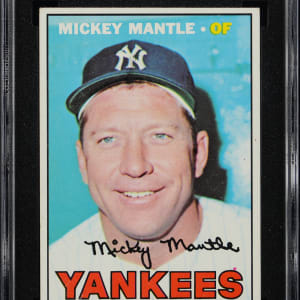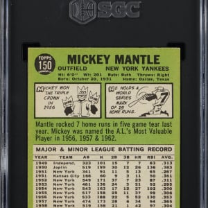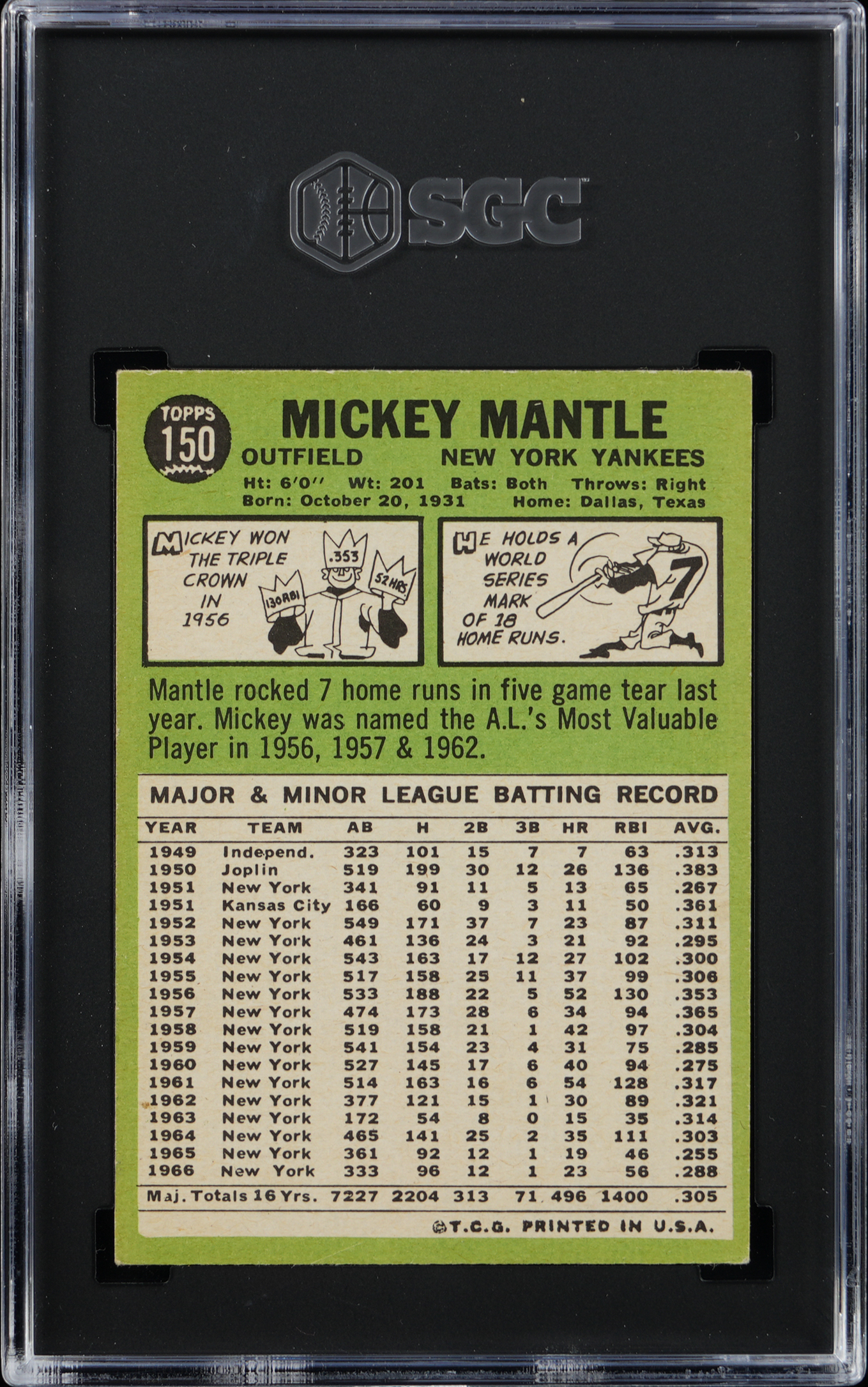 Graded EX/NM 6 by SGC. The three-time American League Most Valuable Player is front-and-center on the offered 1967 Topps #150 showpiece. New York Yankees Hall of Famer.