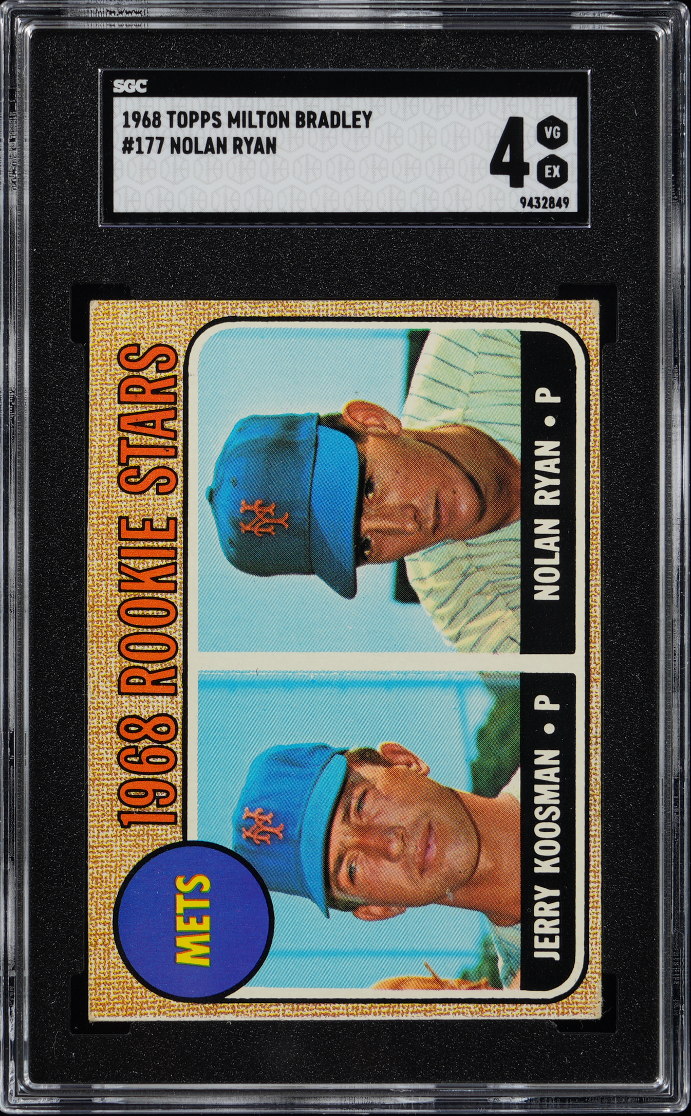 Graded VG/EX 4 by SGC. Select 1968 Topps Milton Bradley #177 Nolan Ryan rookie card that was only issued with the company's Win-A-Card board game. This premiere of the New York Mets Hall of Fame flamethrower is quite colorful and displays only superficial corner/edge wear.