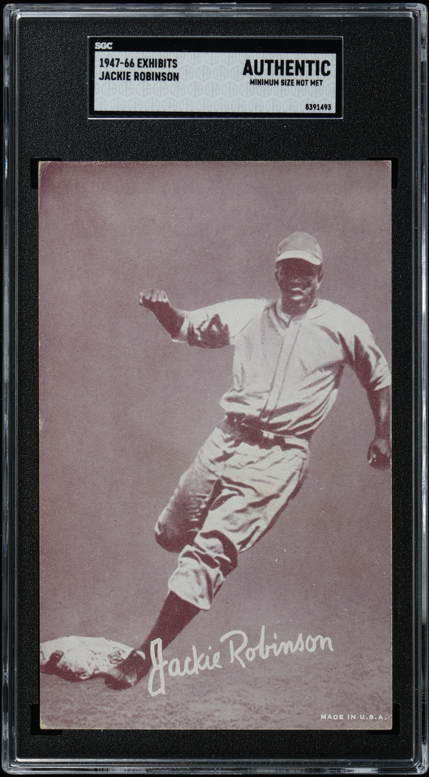 Graded Authentic by SGC due to minimum size requirements not being met. Brooklyn Dodgers Hall of Fame Jackie Robinson scurries around the bases on this crease-free 1947-1966 Exhibits card.