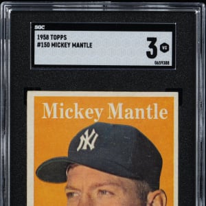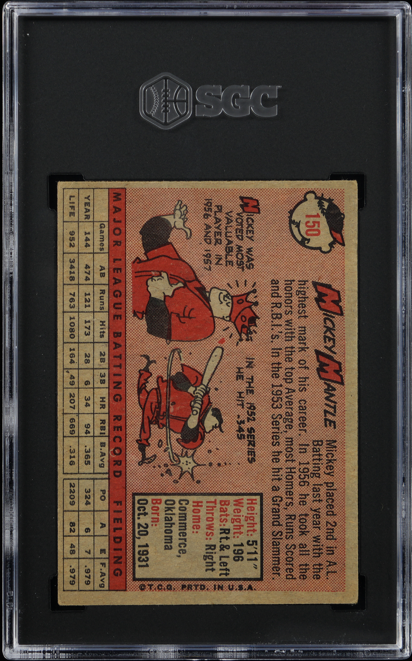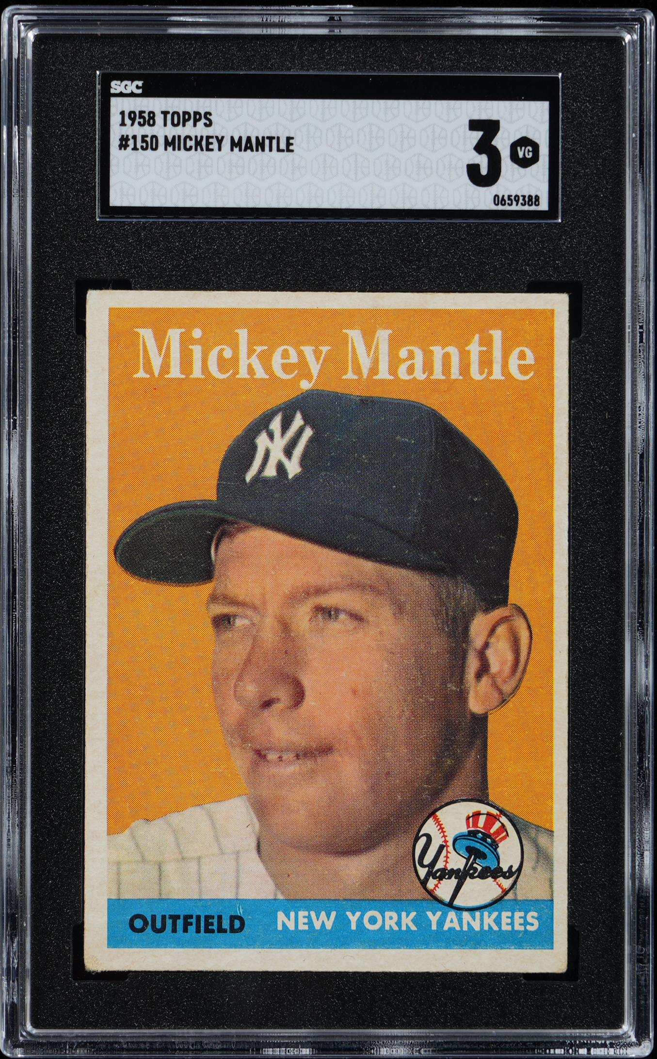 Graded VG 3 by SGC. Sweet 1958 Topps #150 gum card of New York Yankees Hall of Famer Mickey Mantle.