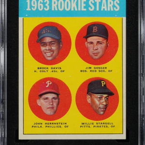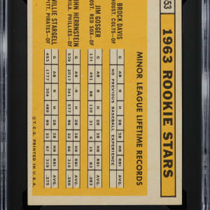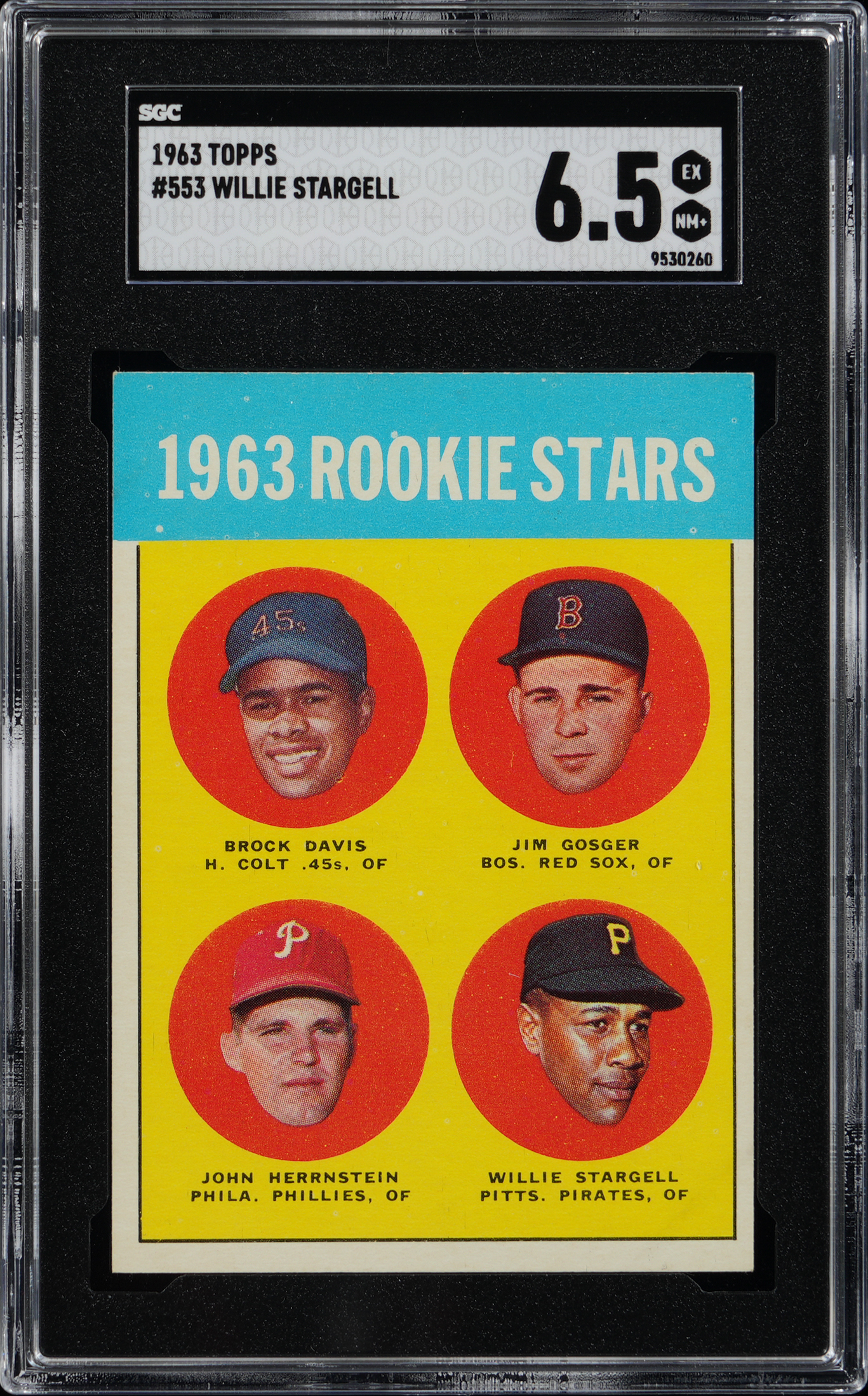 Graded EX/NM+ 6.5 by SGC. A young "Pops" is showcased on the offered 1963 Topps #553 Willie Stargell rookie card. This tougher high number of the Pittsburgh Pirates Hall of Fame slugger exhibits strong eye appeal.