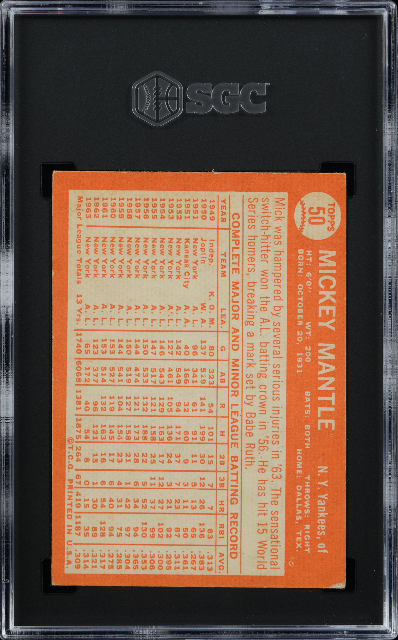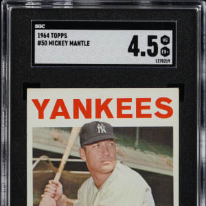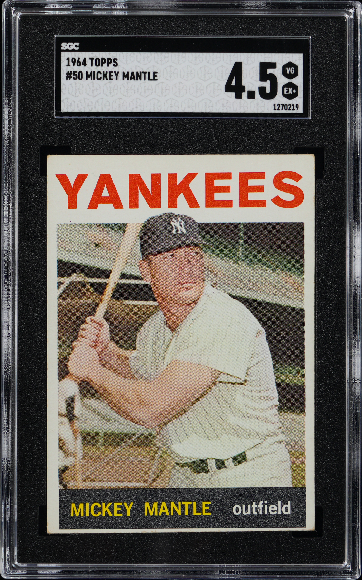 Graded VG/EX+ 4.5 by SGC. Power up for the offered 1964 Topps #50 Mickey Mantle gum card. New York Yankees Hall of Famer.