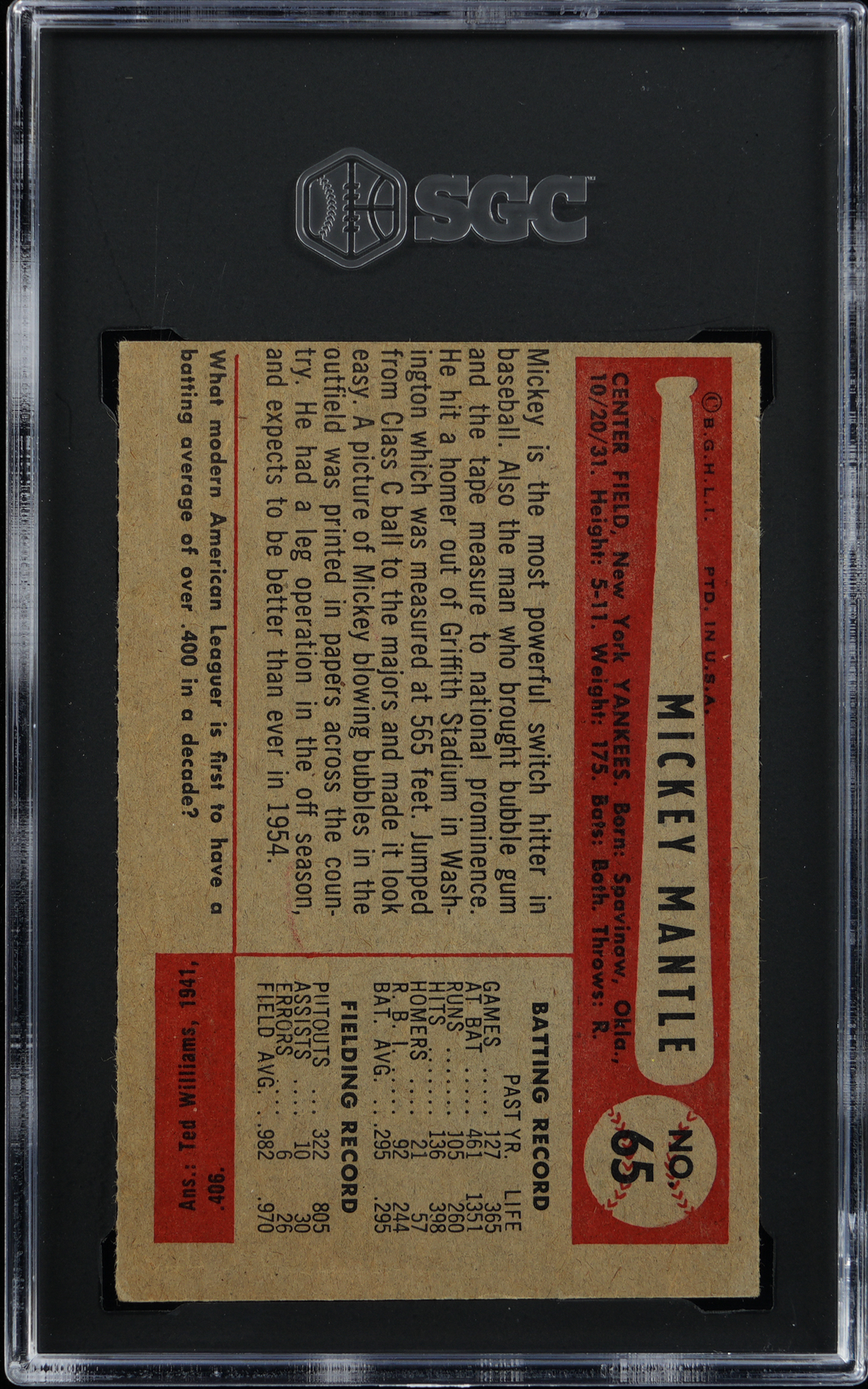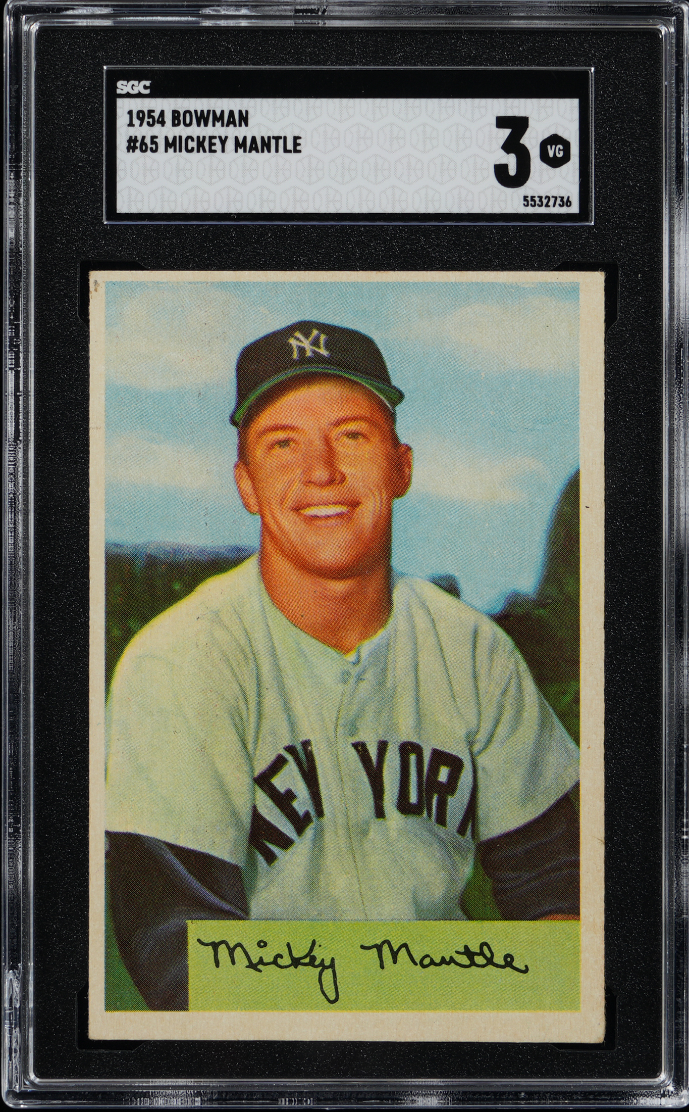 Graded VG 3 by SGC. Keynote 1954 Bowman #65 Mickey Mantle single. This integral component to the '54 edition displays only limited corner/edge wear and is crease-free. A fine mid-grade classic of the five-tool New York Yankees Hall of Fame switch-hitter.