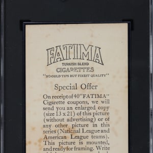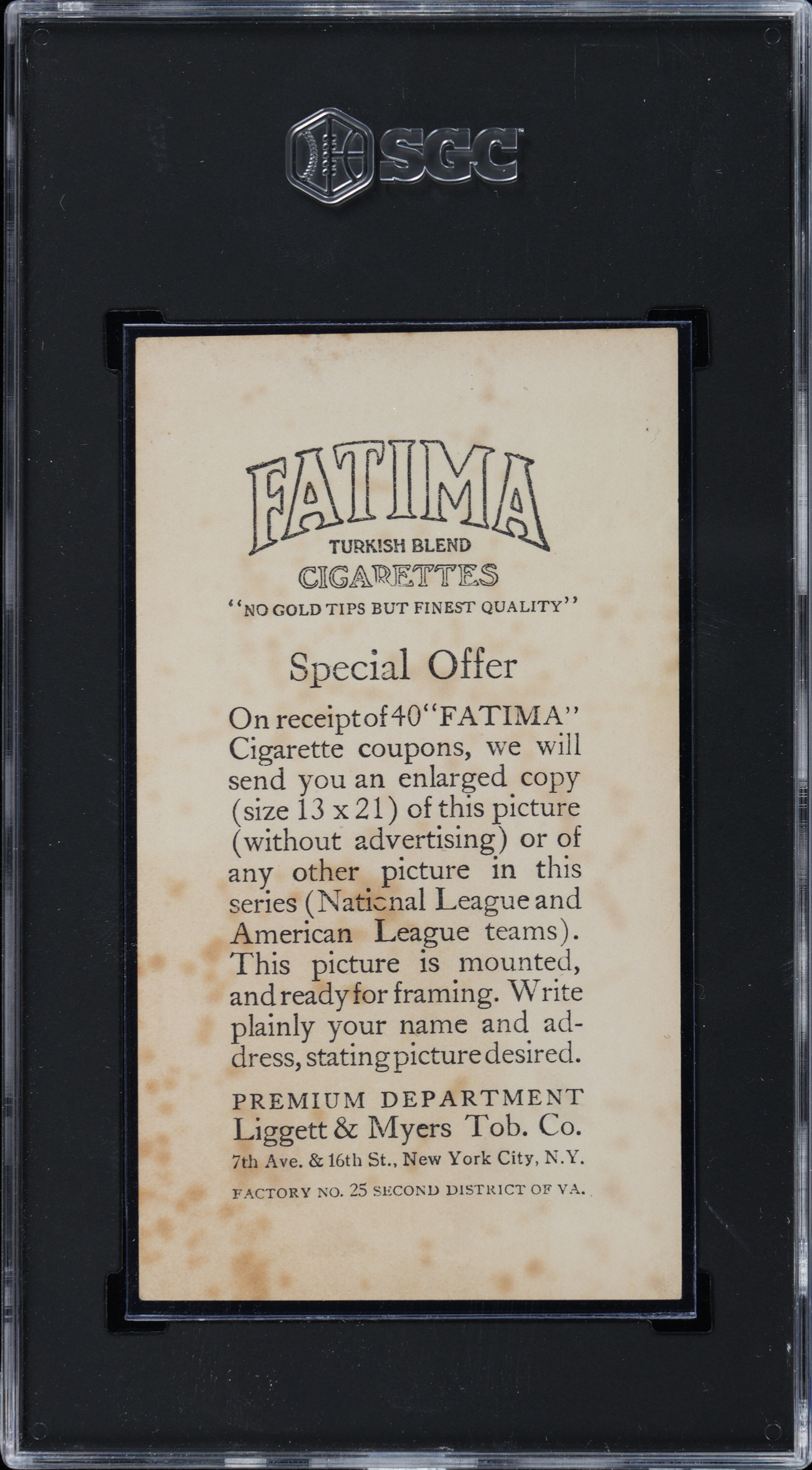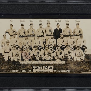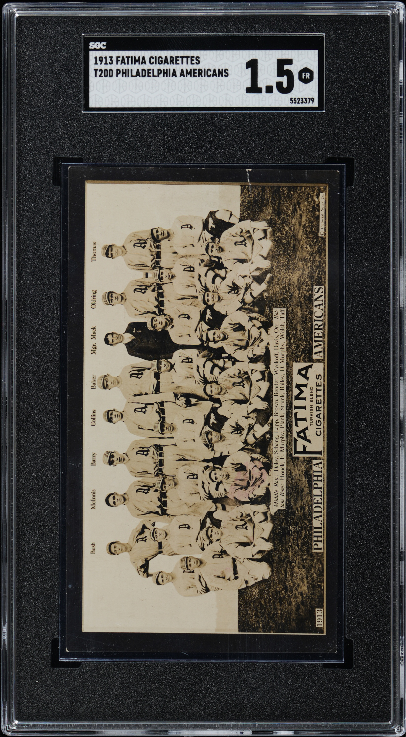 Graded FAIR 1.5 by SGC. The offered 1913 T200 Fatima Cigarettes Philadelphia Americans Team Card comes from a SGC graded near set "break" offered individually throughout this auction. Hall of Famers include Frank (Home Run) Baker, Chief bender, Eddie Collins, Connie Mack and Eddie Plank.