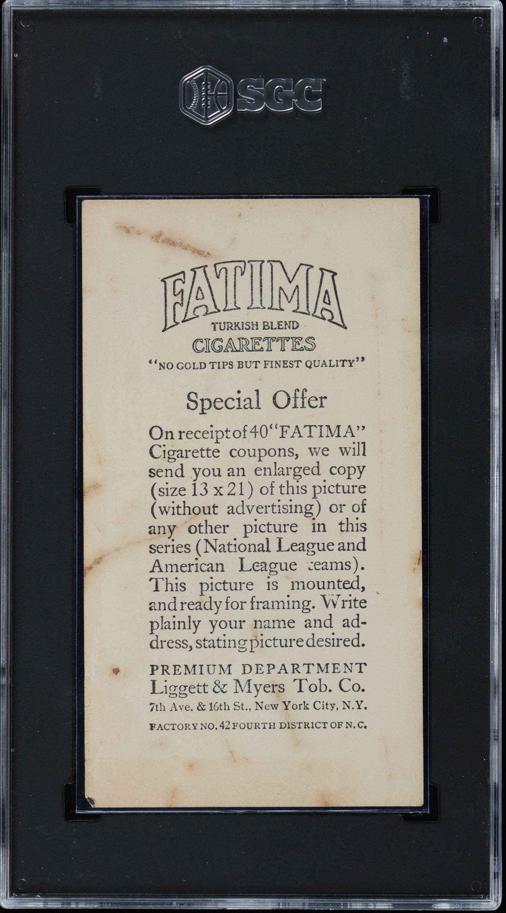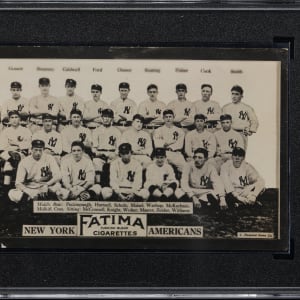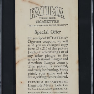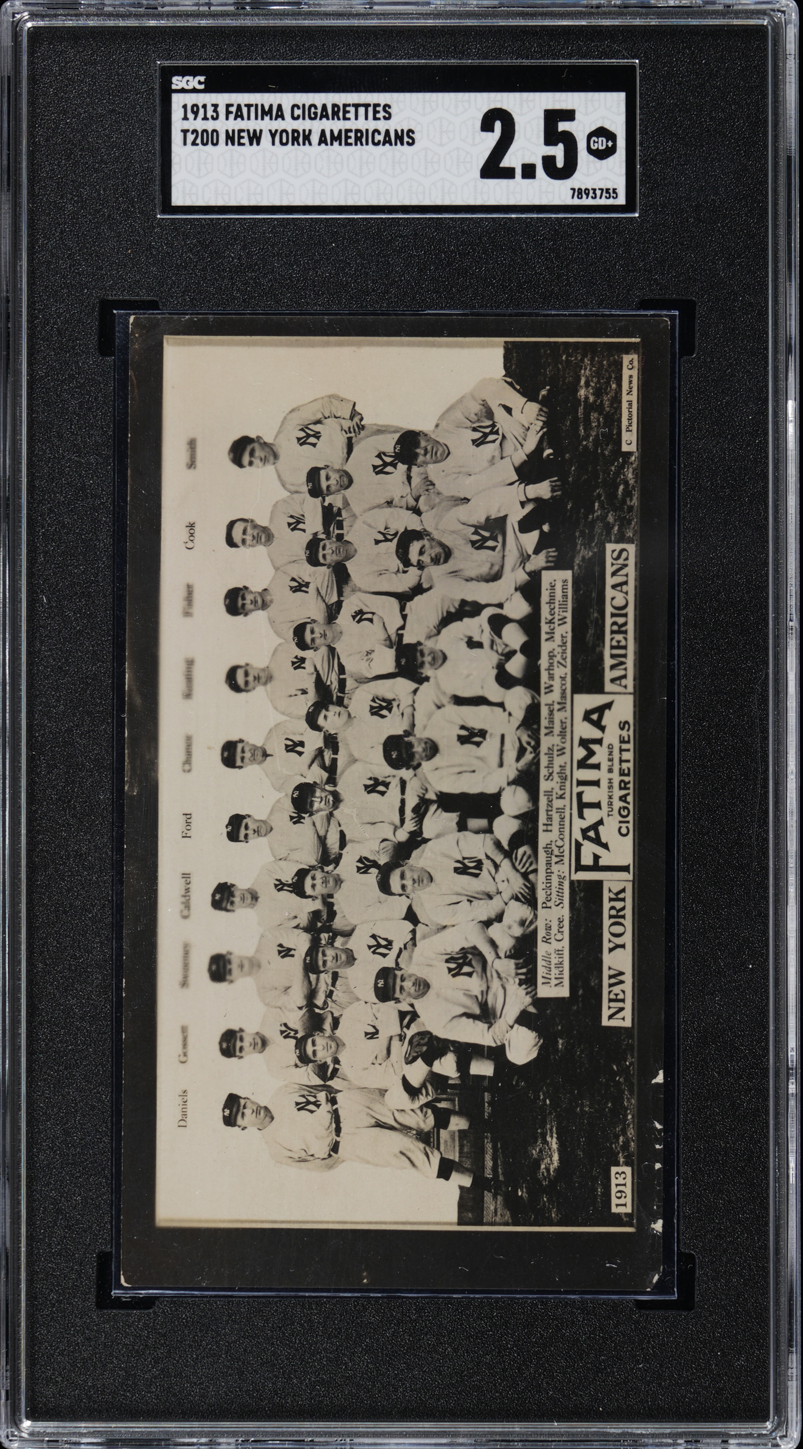 Graded GOOD+ 2.5 by SGC. The offered 1913 T200 Fatima Cigarettes New York Americans Team Card comes from a SGC graded near set "break" offered individually throughout this auction. Hall of Famers include Frank Chance and Bill McKechnie.