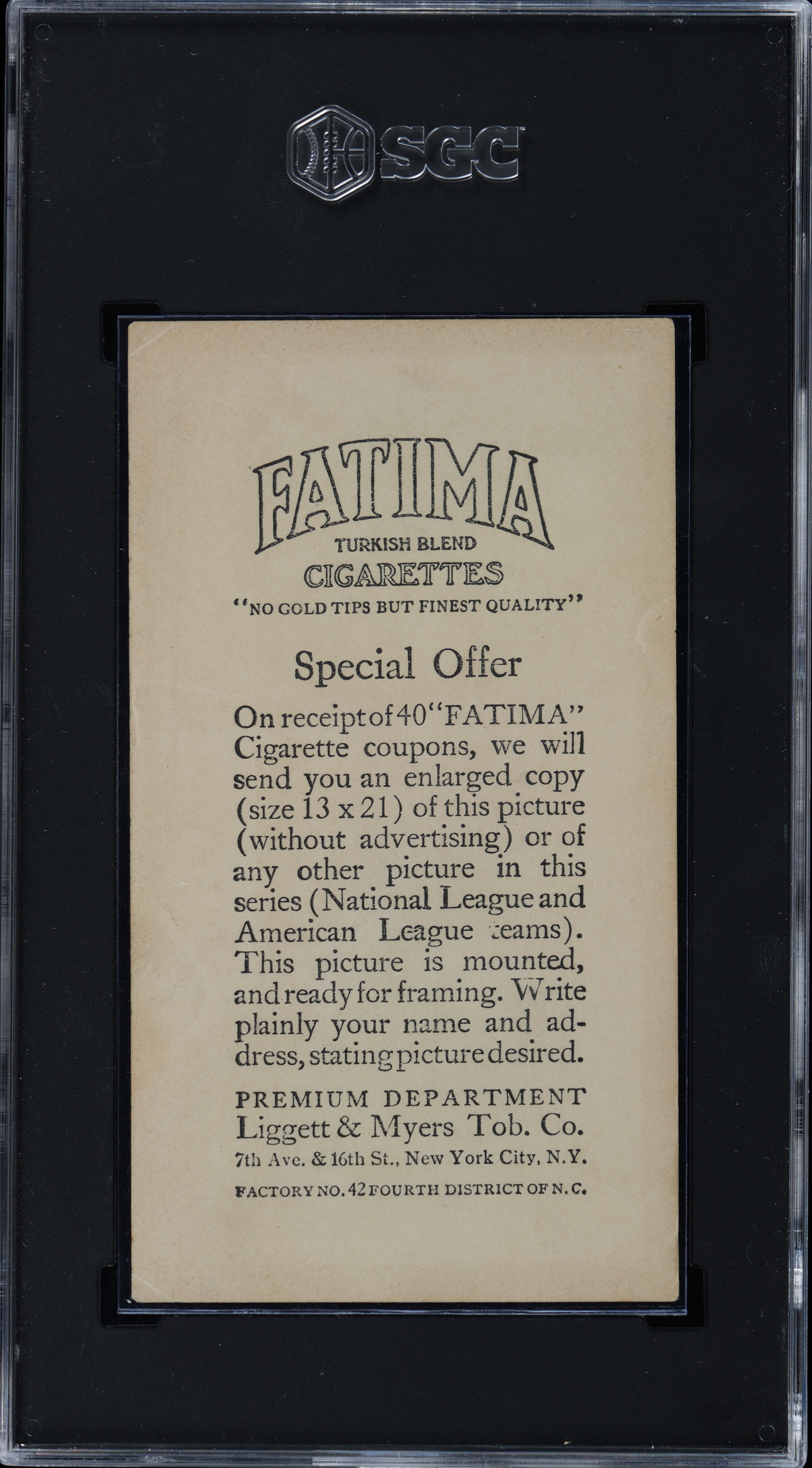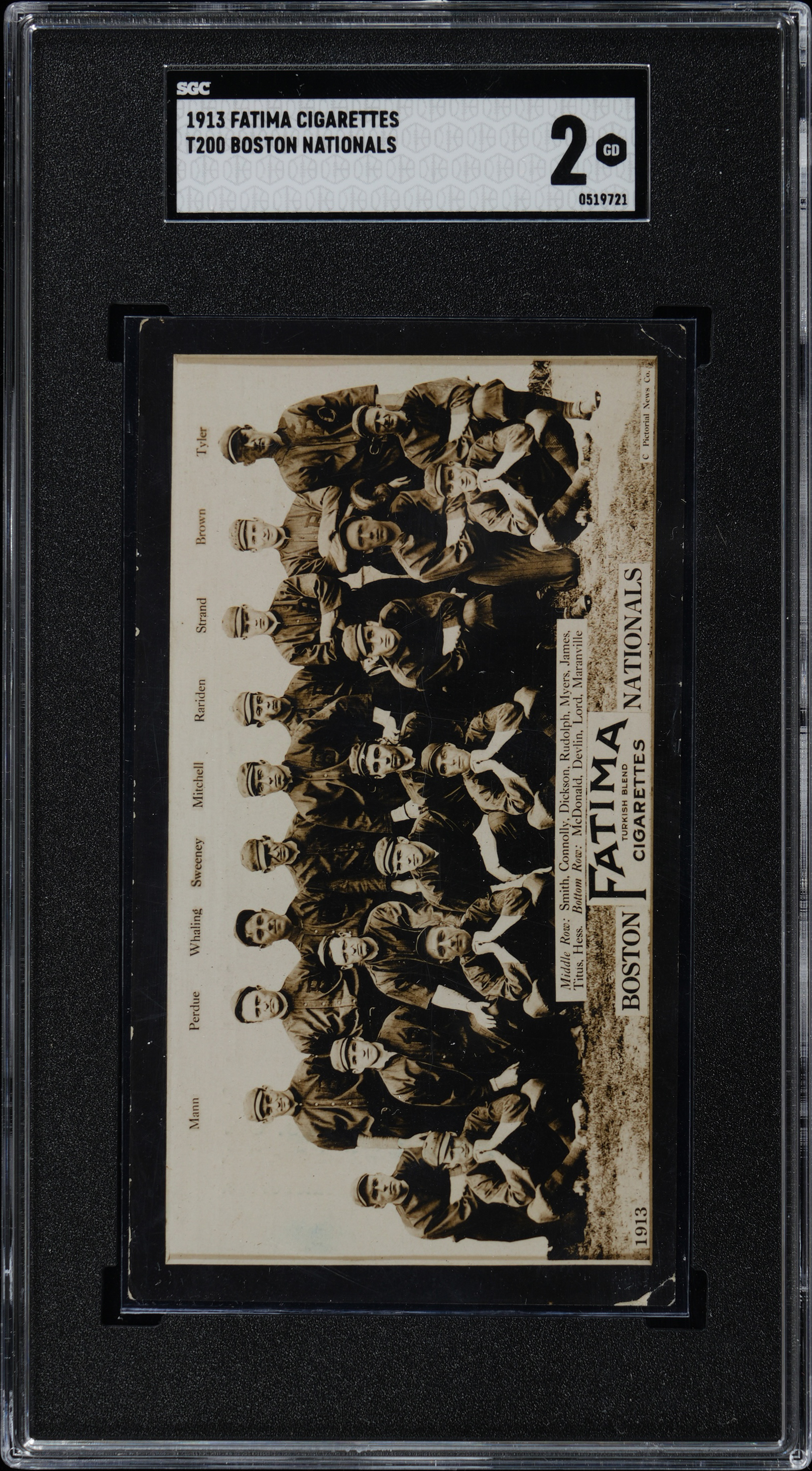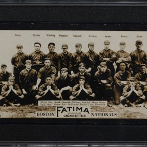Graded GOOD 2 by SGC. The offered 1913 T200 Fatima Cigarettes Boston Nationals Team Card comes from a SGC graded near set "break" offered individually throughout this auction. Hall of Famer Walter (Rabbit) Maranville is present.